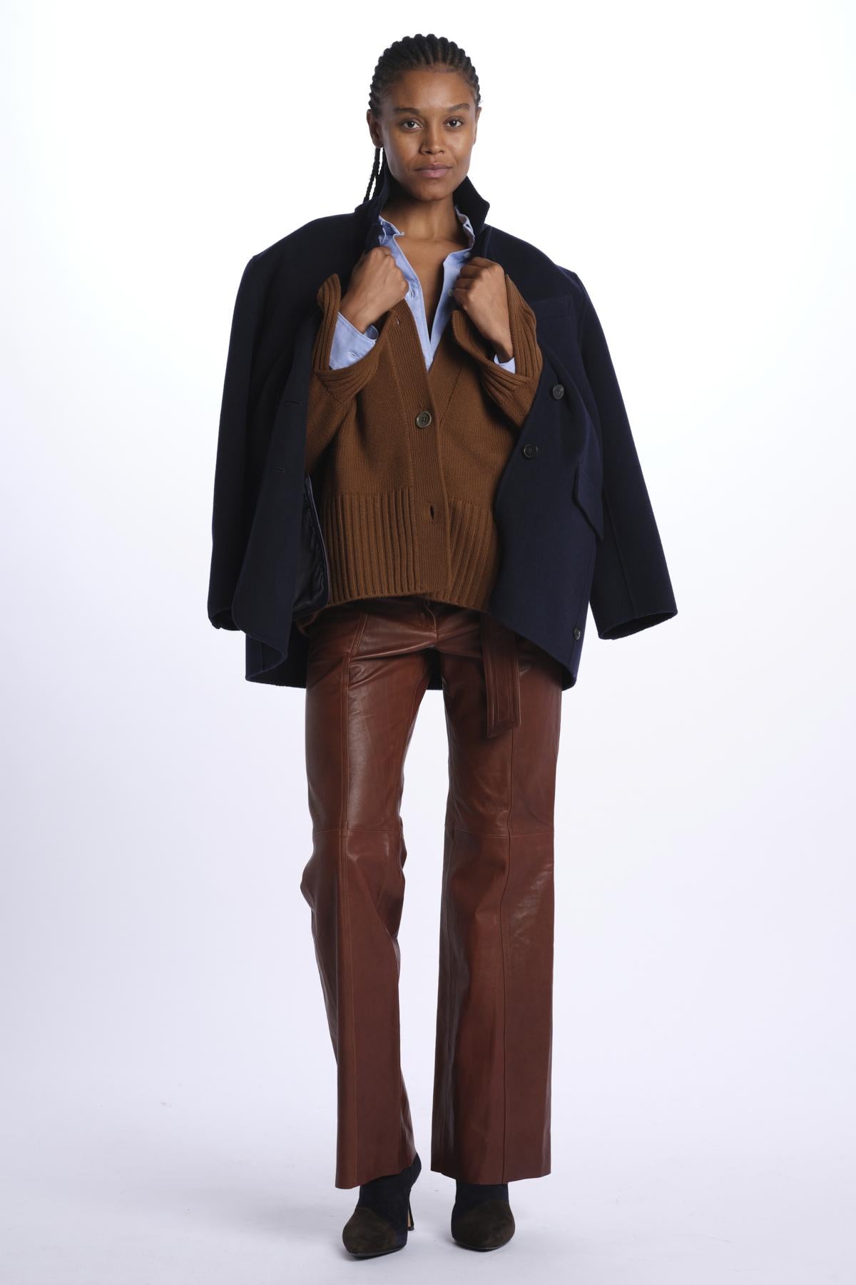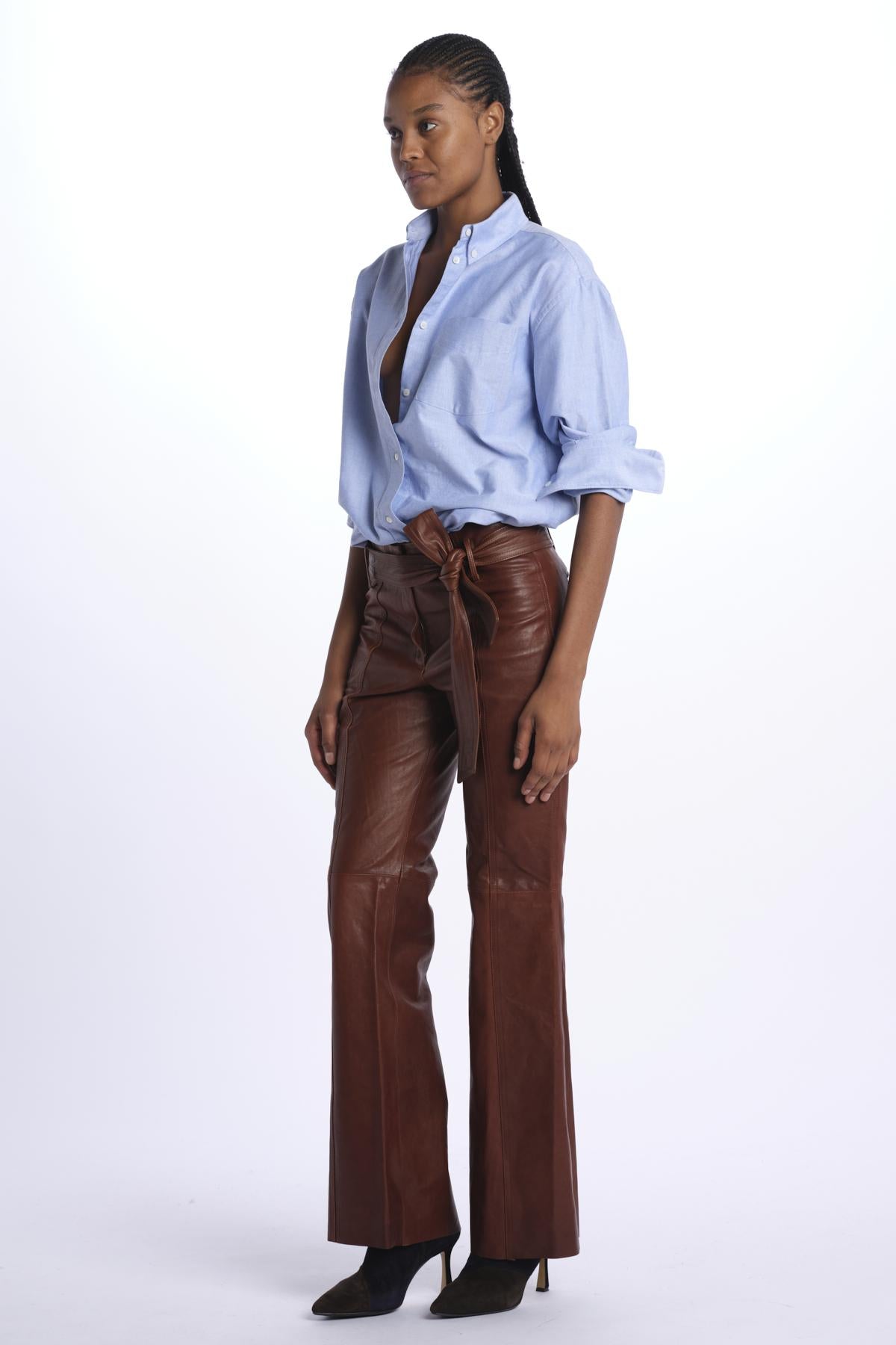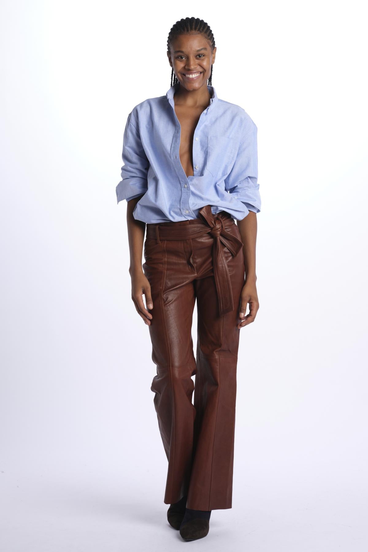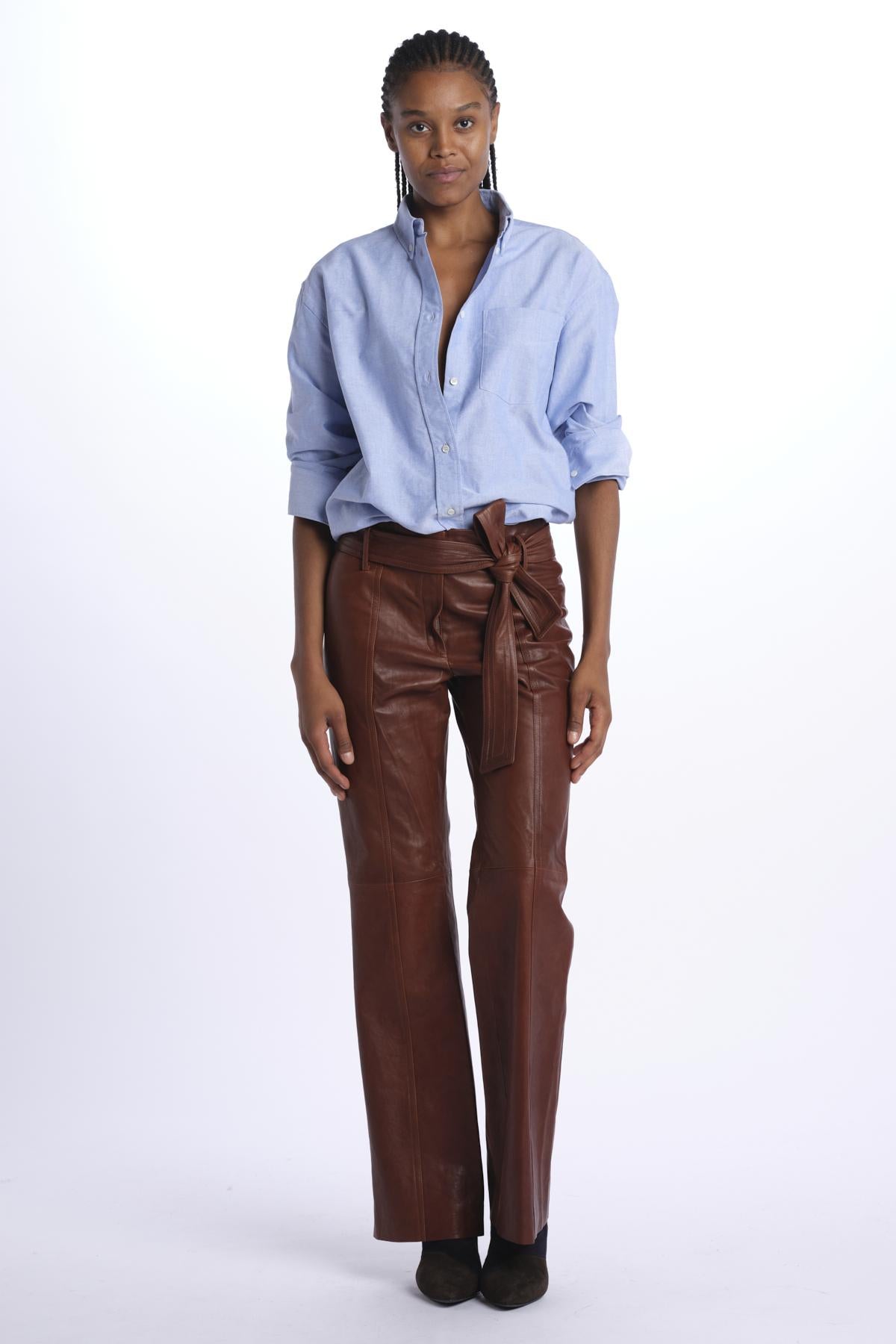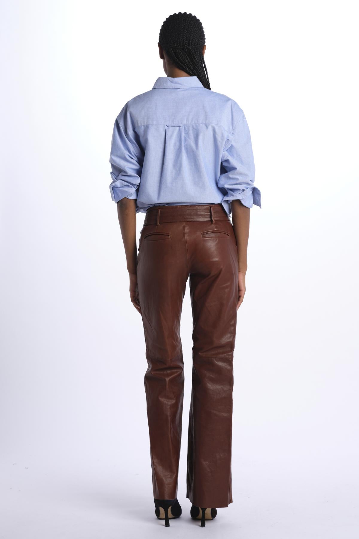 Belted trousers by milaura leather. The model is 174 cm tall and wears a 38. Composition: 100% lambskin.
