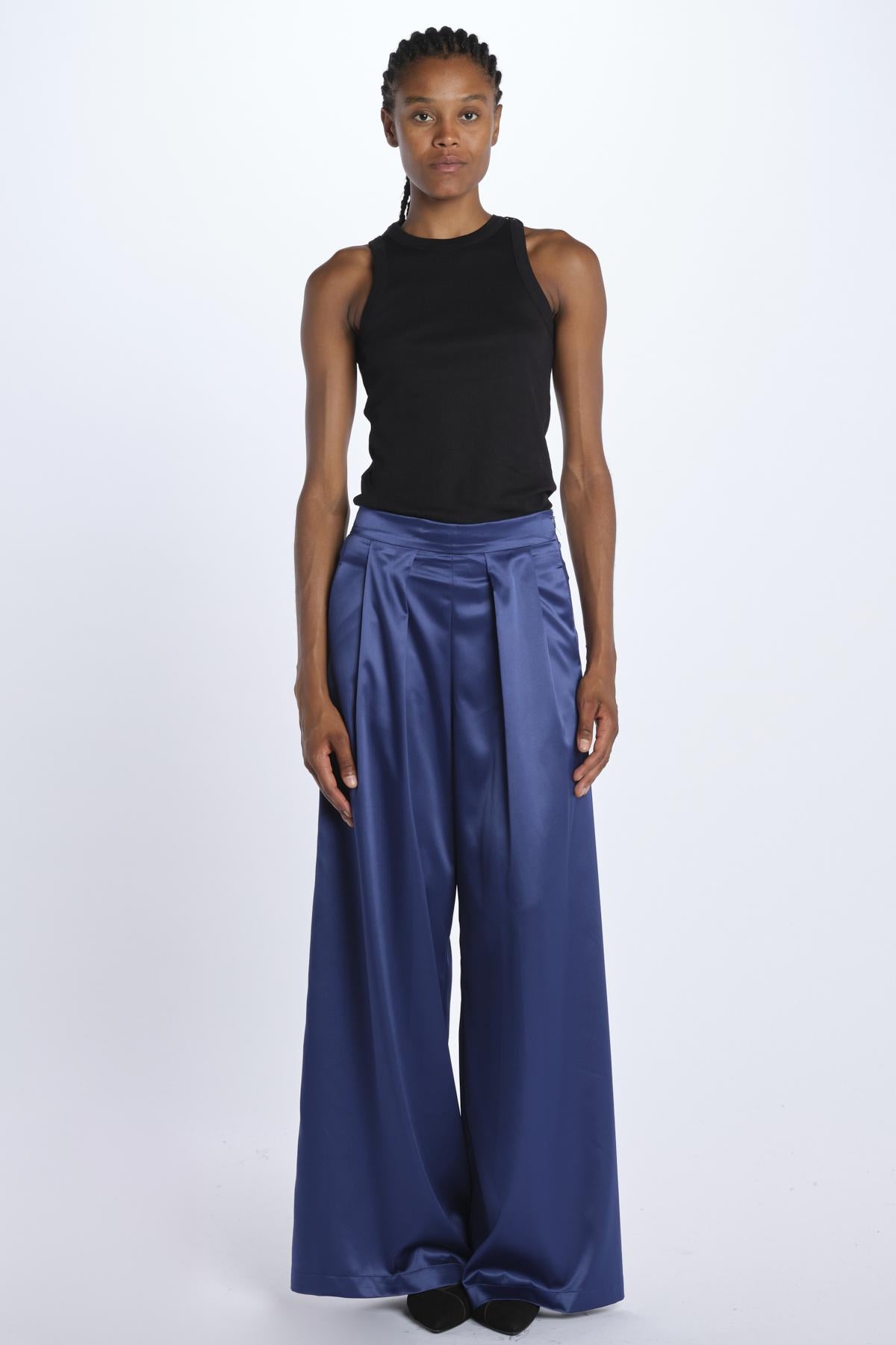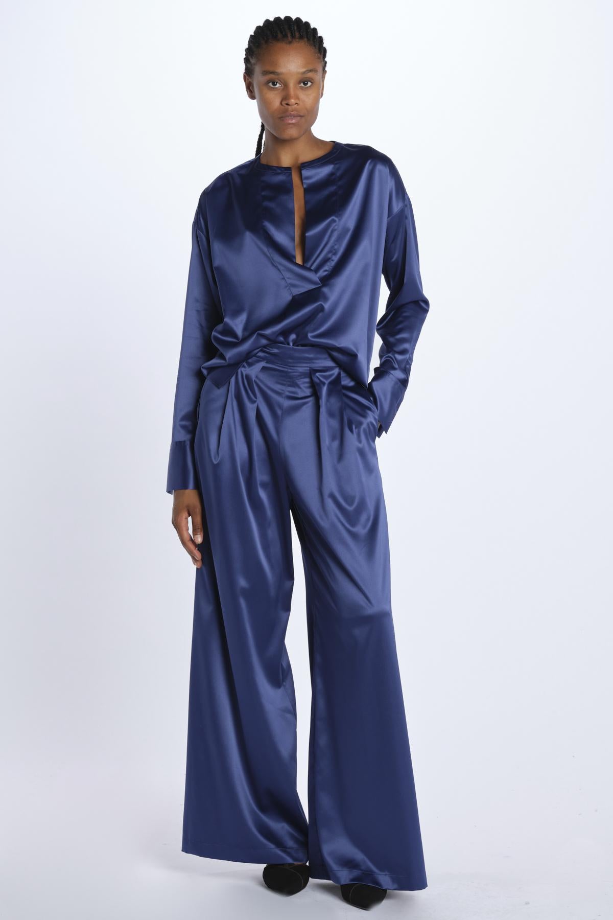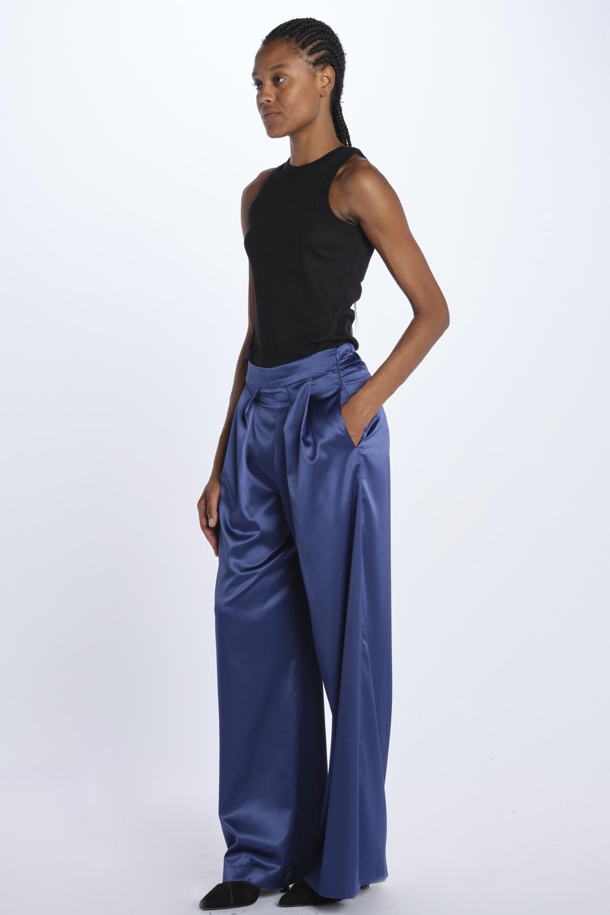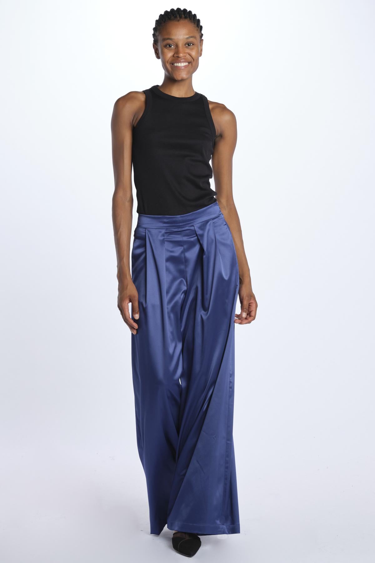 Satin trousers by milaura rtw 2 pleats. The model is 174 cm tall and wears a 38. Composition: 97% polyester, 3% elastane.