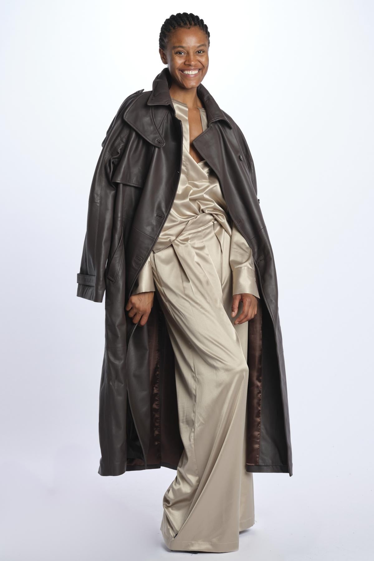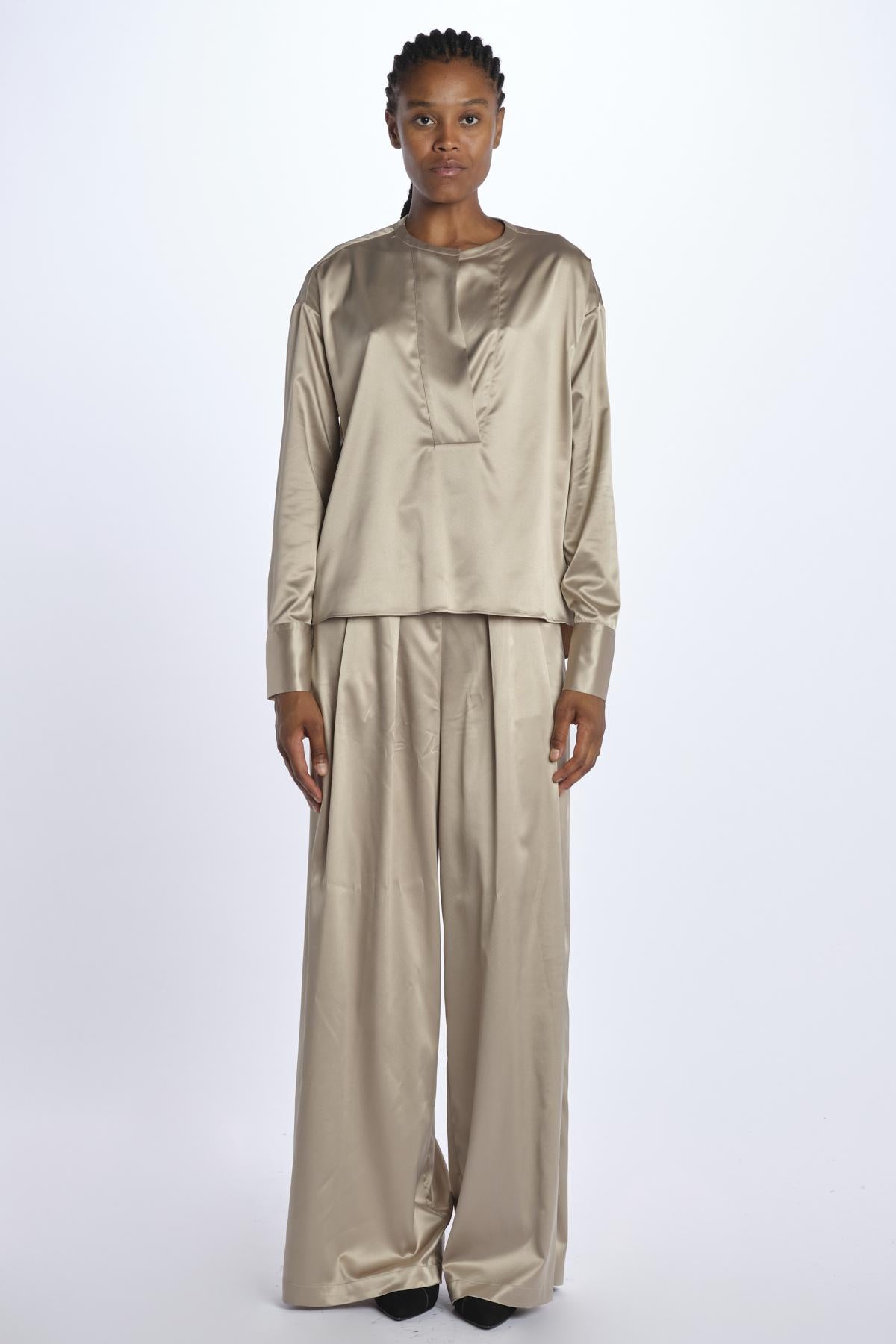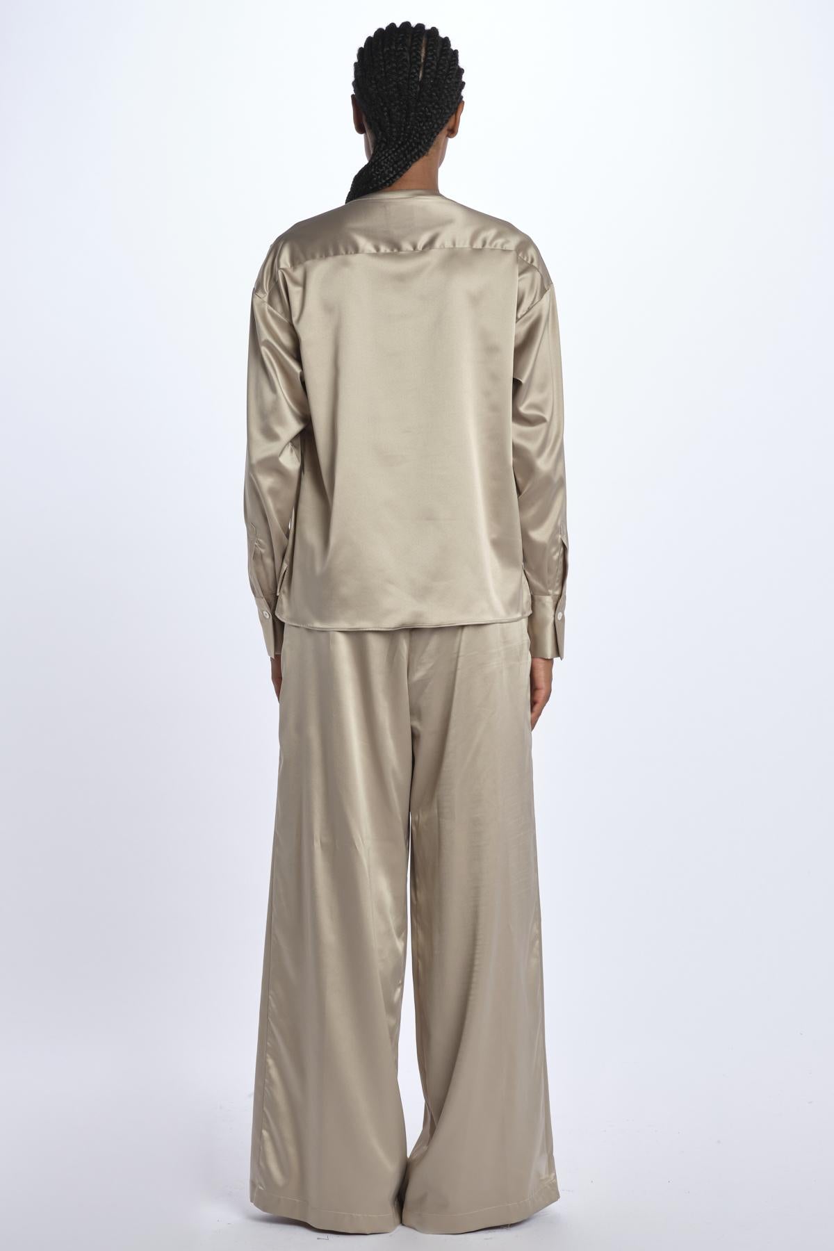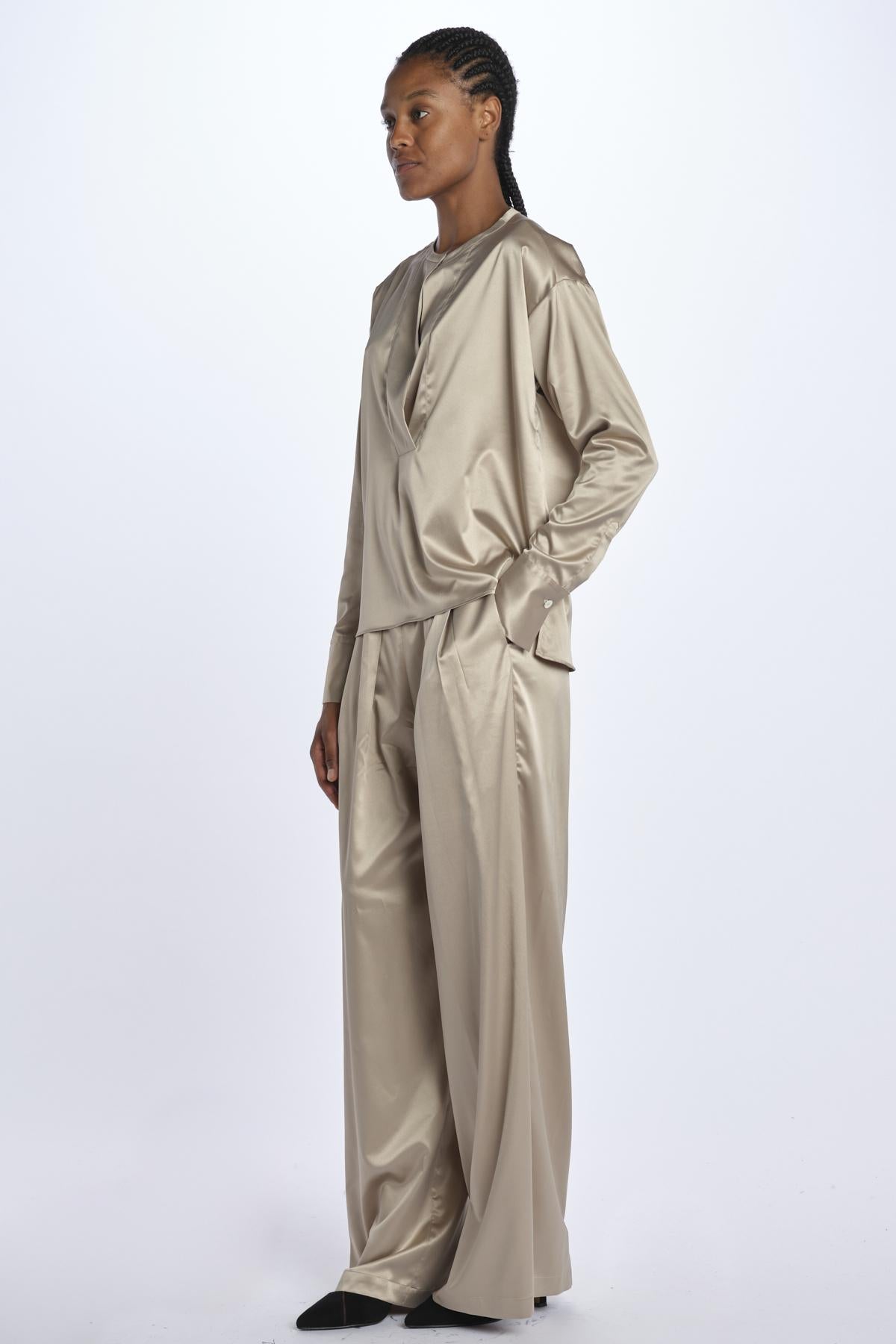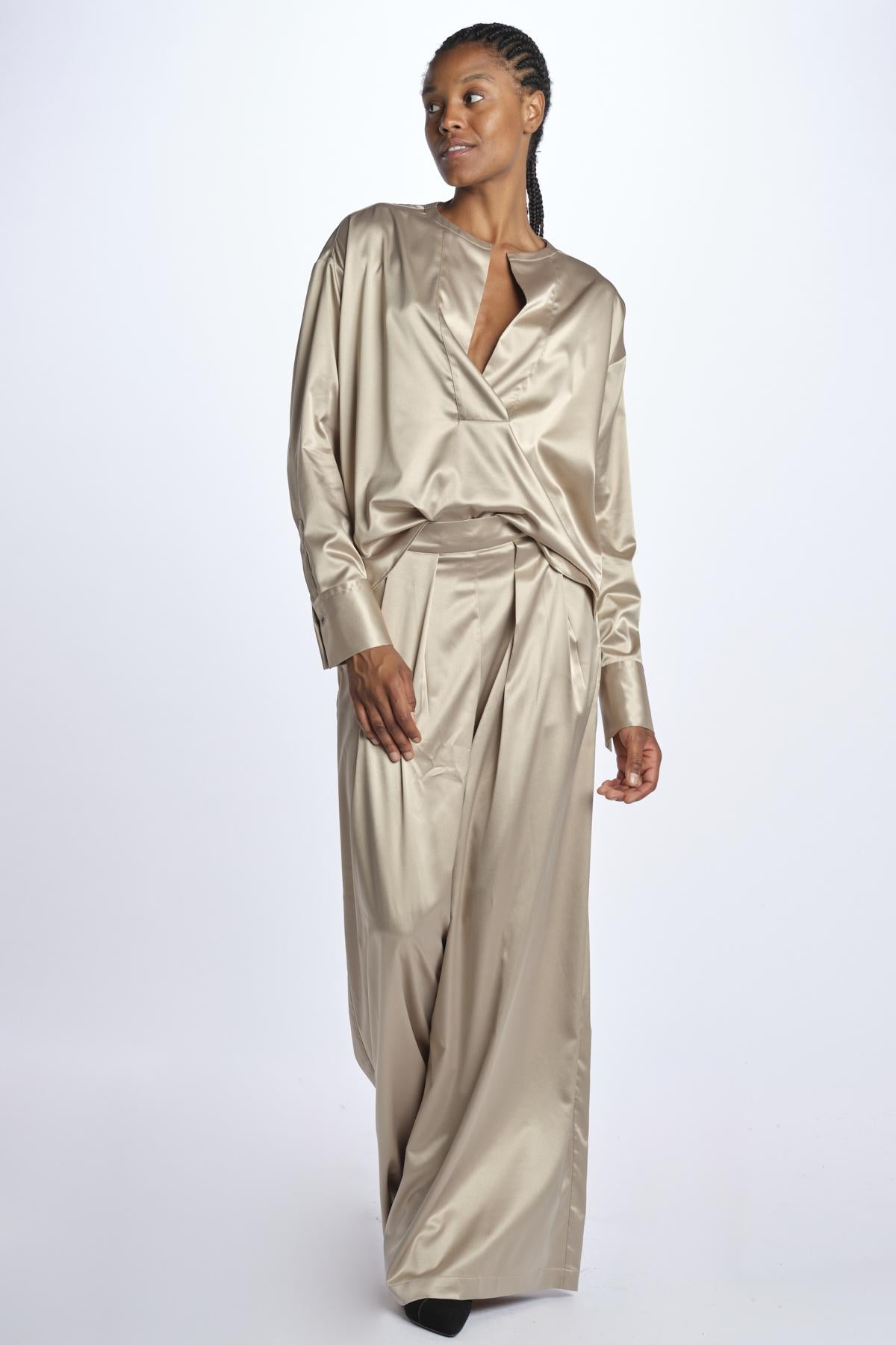 THEA by milaura rtw satin shirt. The model is 174 cm tall and wears a 38. Composition: 97% polyester, 3% elastane.