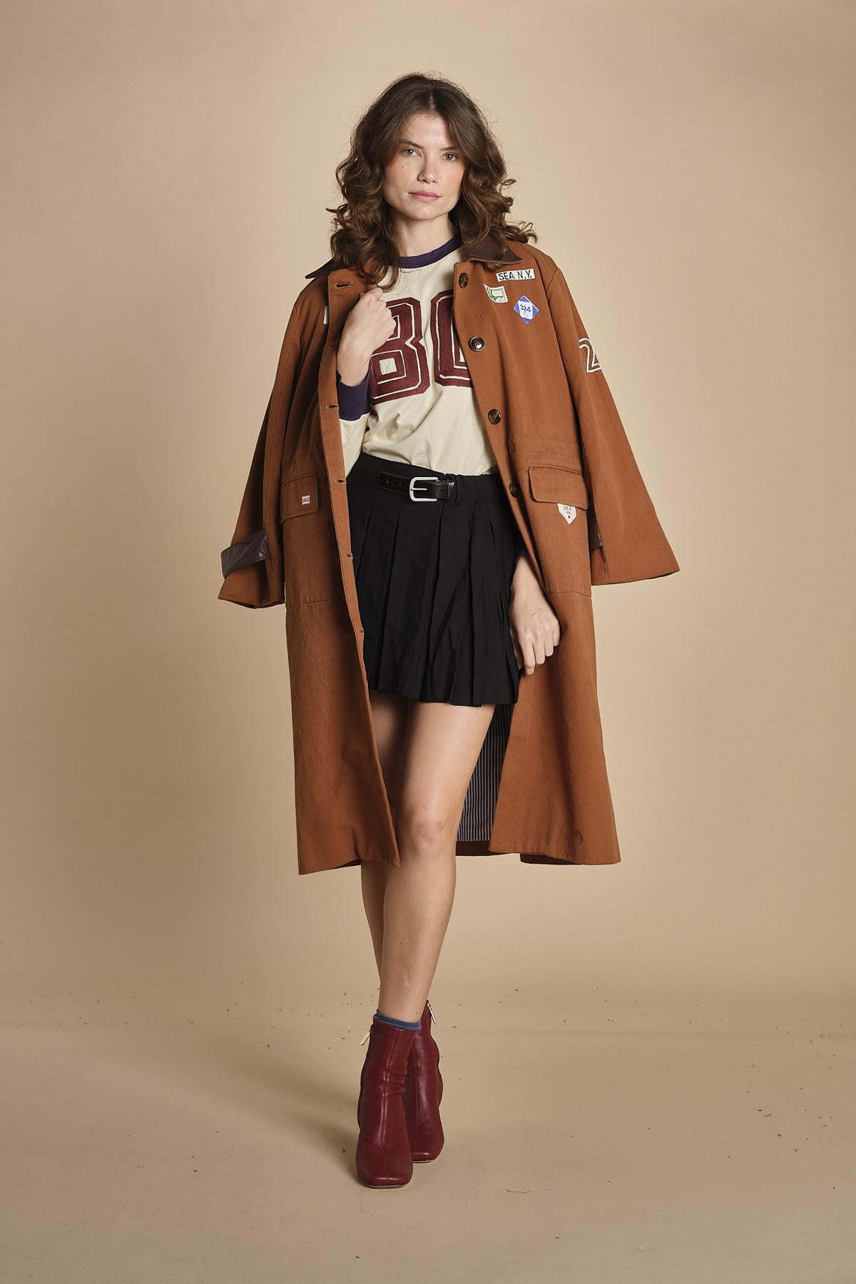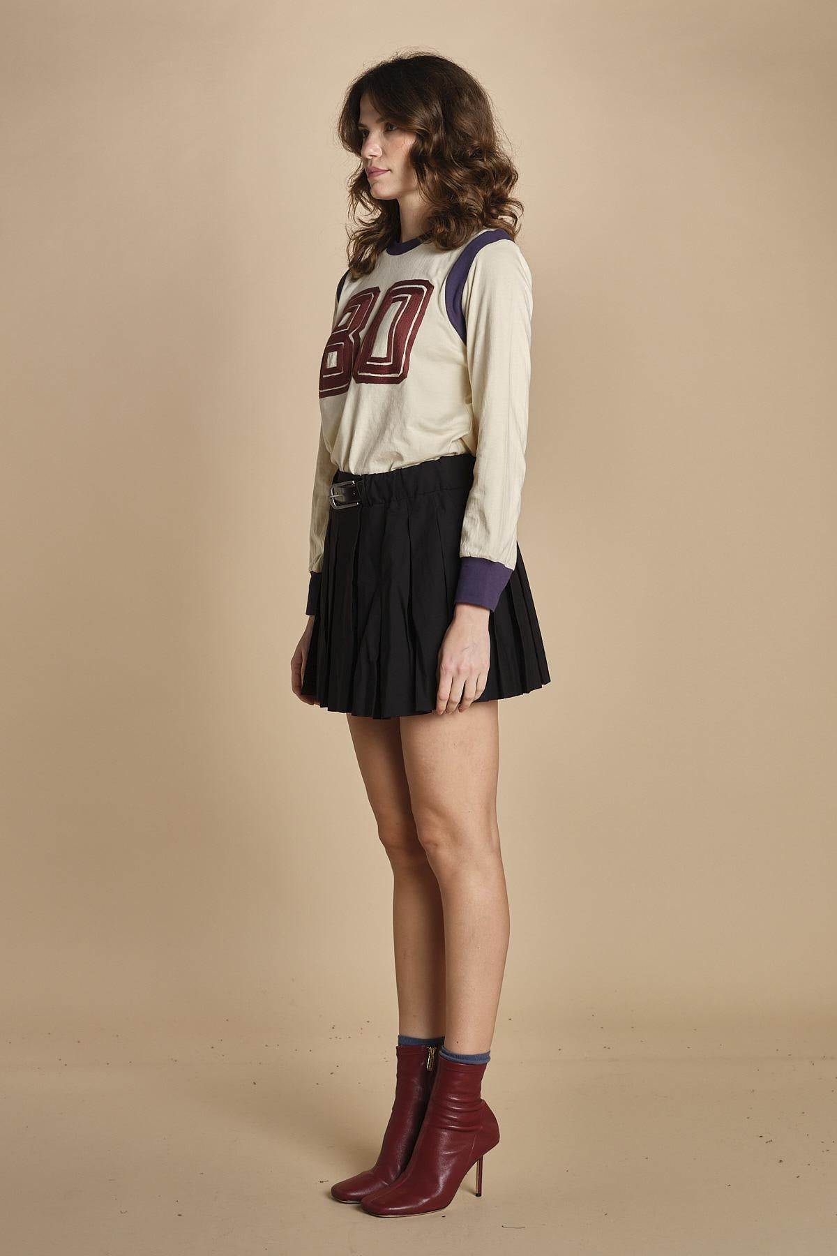mini gonna pieghe. La modella è alta 176 cm e indossa una taglia S. 51% POLIESTERE 44% LANA 5% SPANDEX