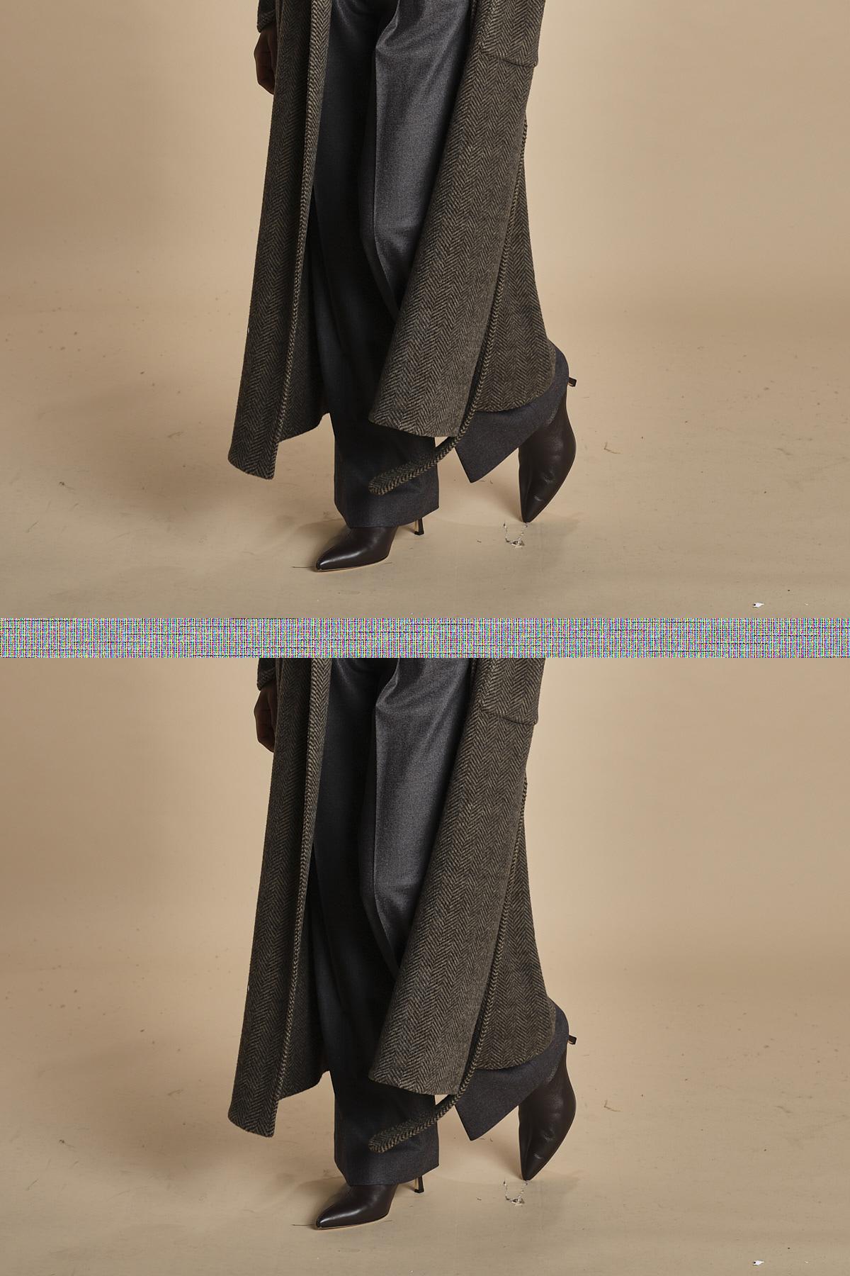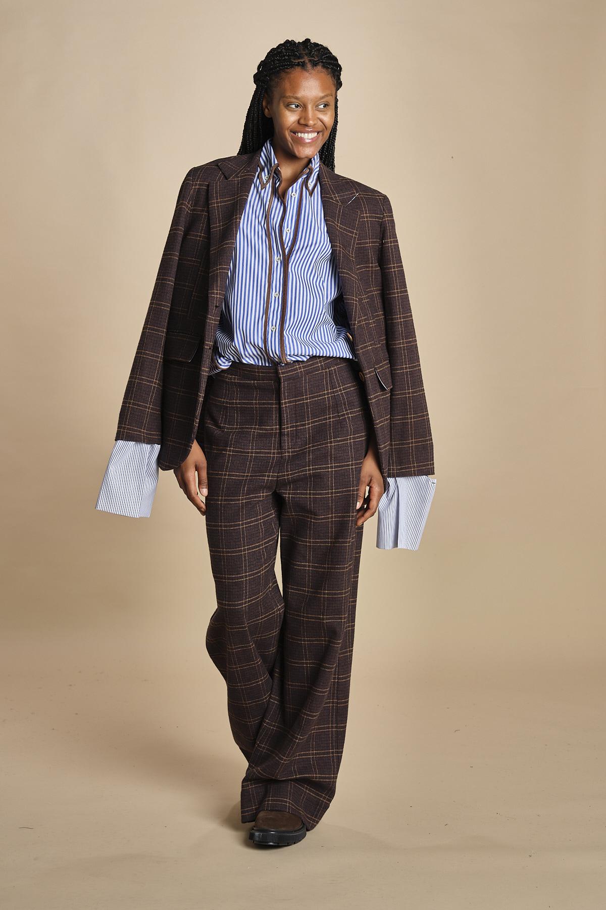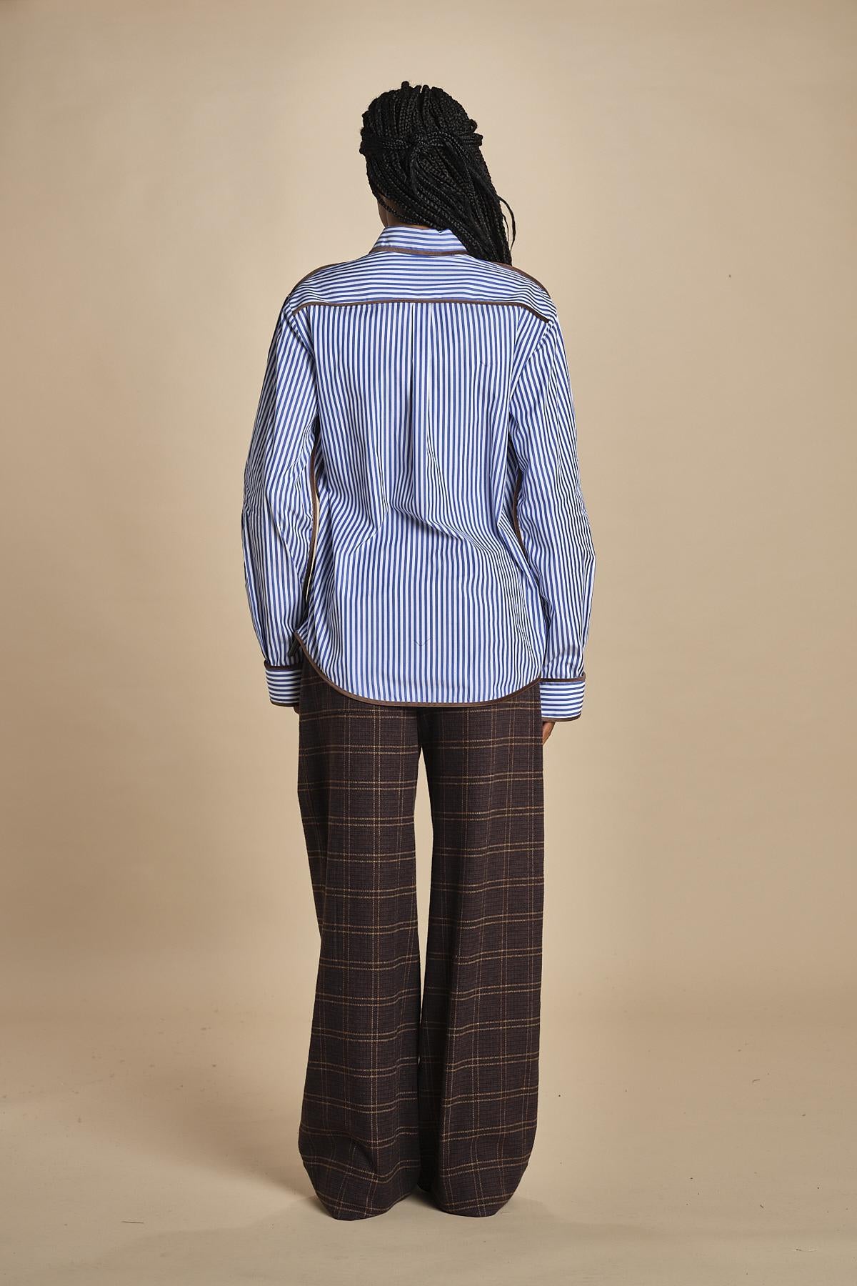 camicia maschile a righe con piping in velluto by jejia. La modella è alta 174 cm e indossa una taglia S. Composizione: 100% cotone.