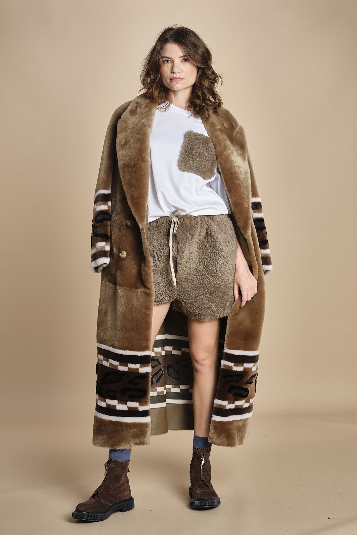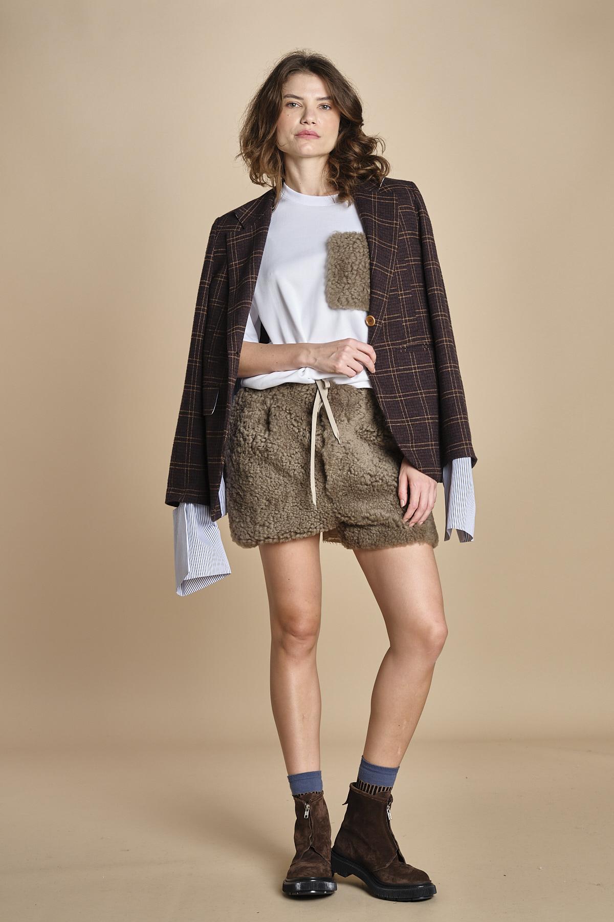 in cotone con tasca in montone. La modella è alta 176 cm e indossa una taglia 38. 80% POLIESTERE  20% COTONE 100% PELLE