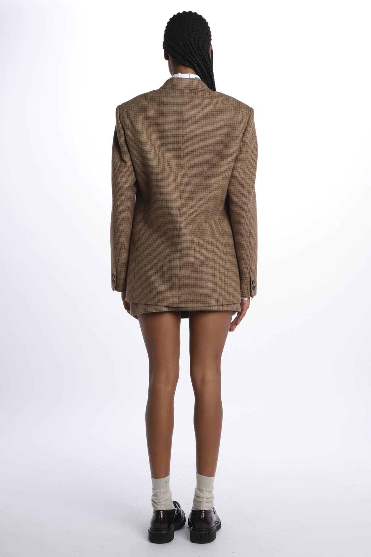 Oversized jacket with pied de poule by n21. The model is 174 cm tall and wears a size 40. Composition: 73% virgin wool, 26% polyamide, 1% elastane.