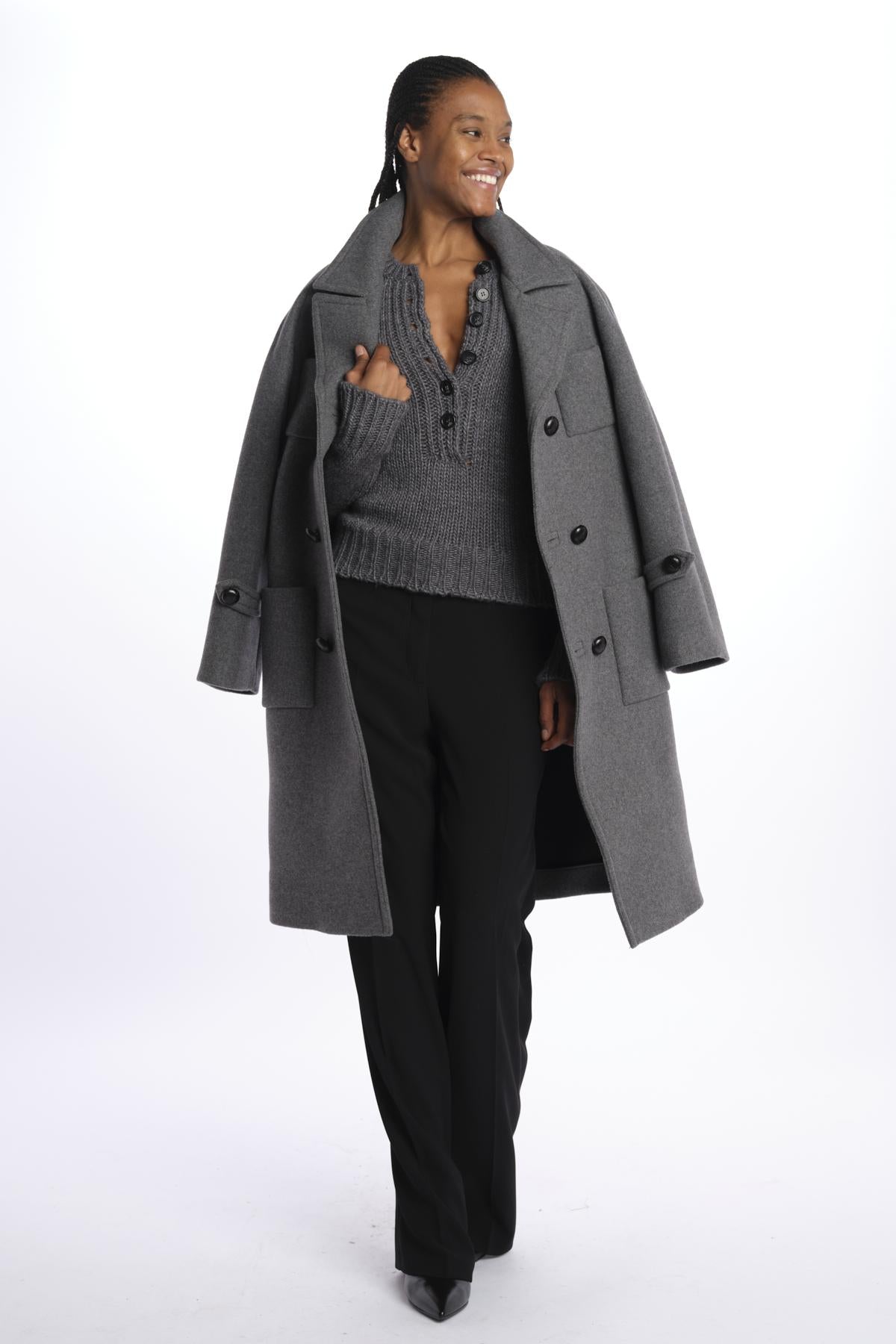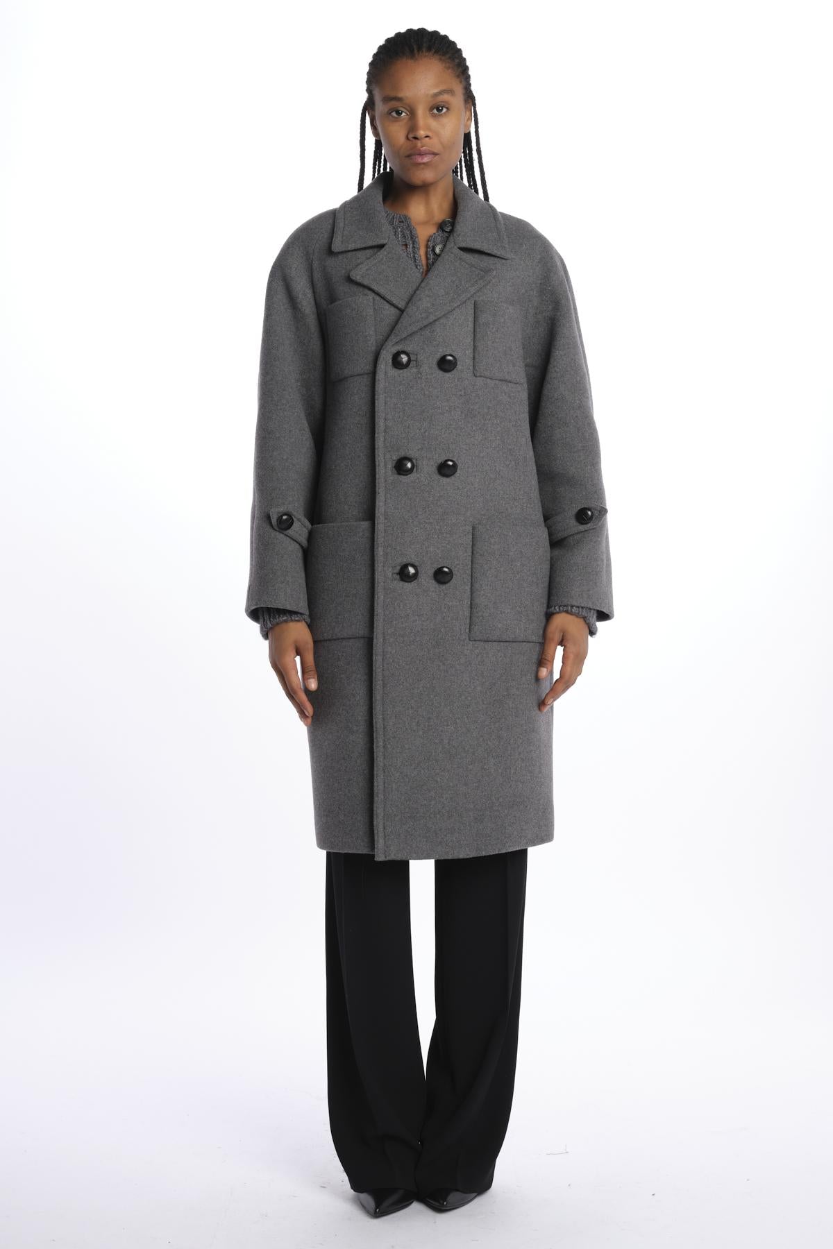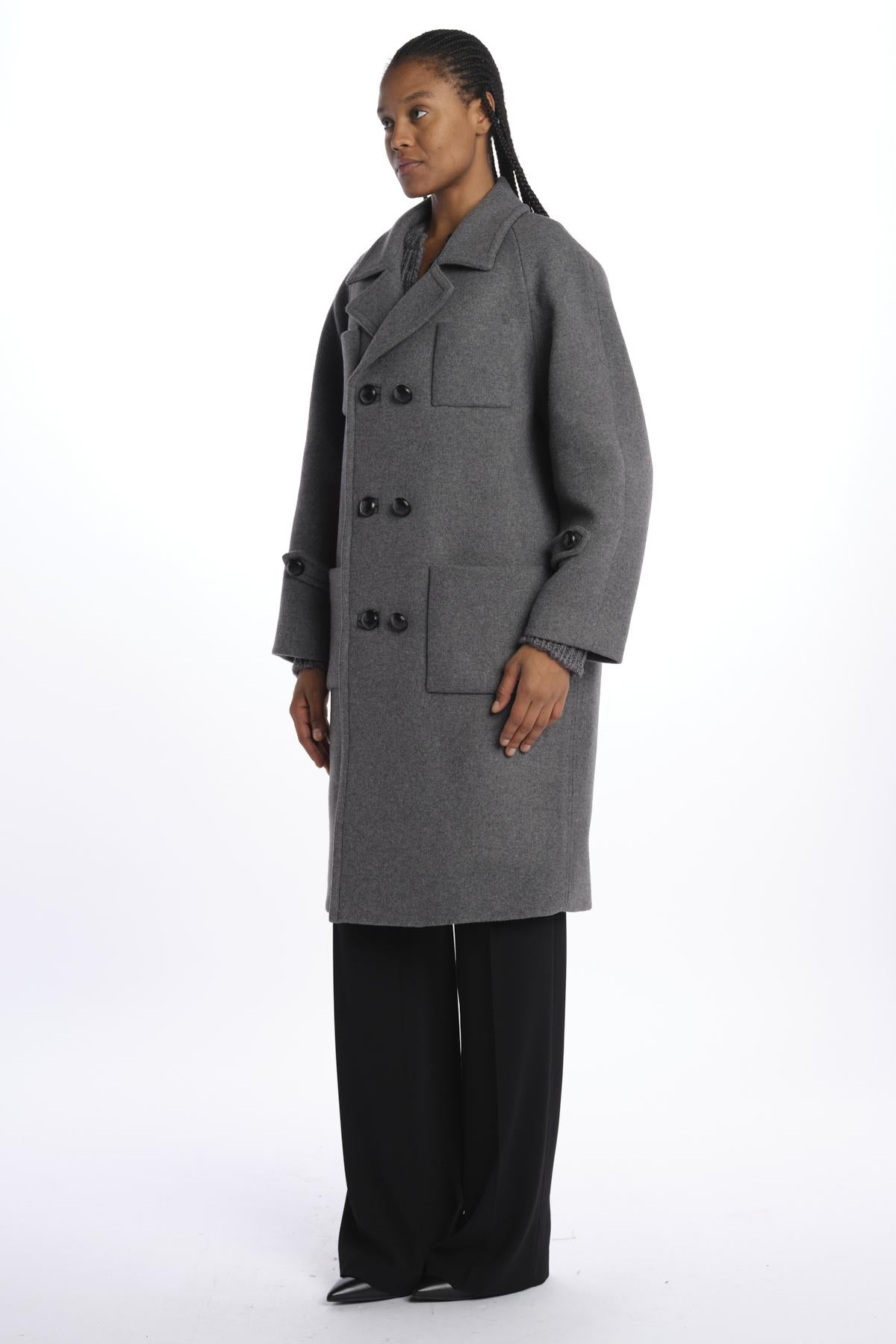 Double-breasted cloth overcoat by n21. The model is 174 cm tall and wears a size S. Composition: 75% virgin wool, 25% polyamide.