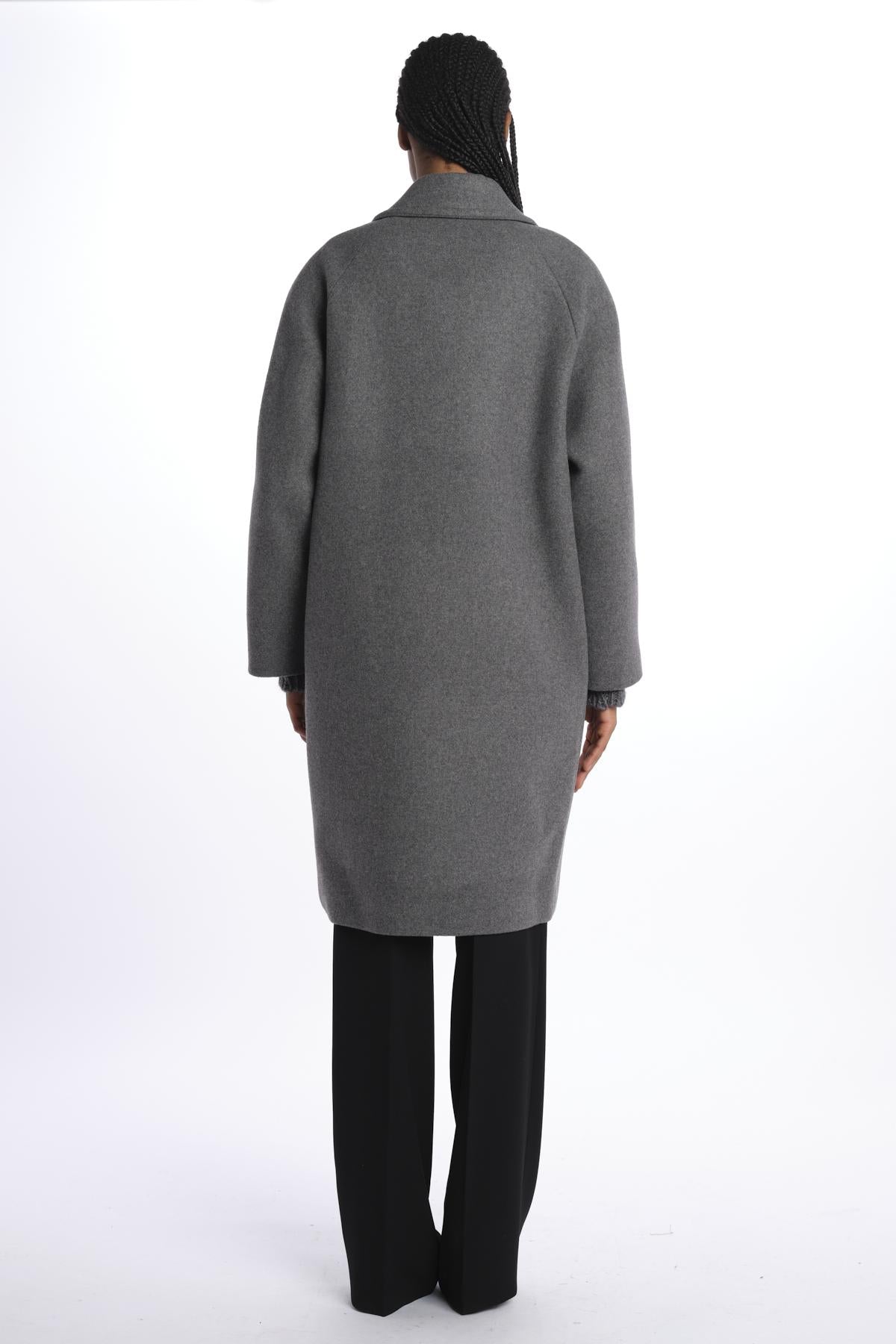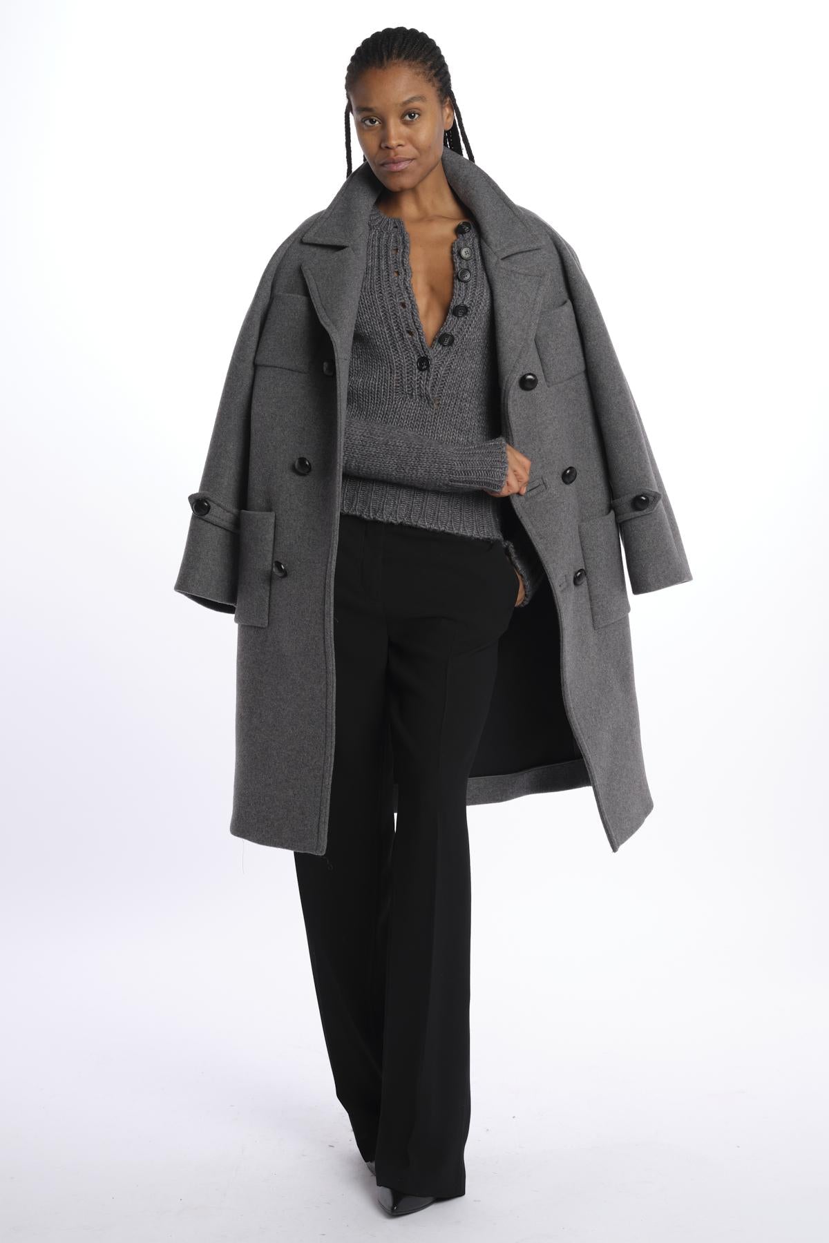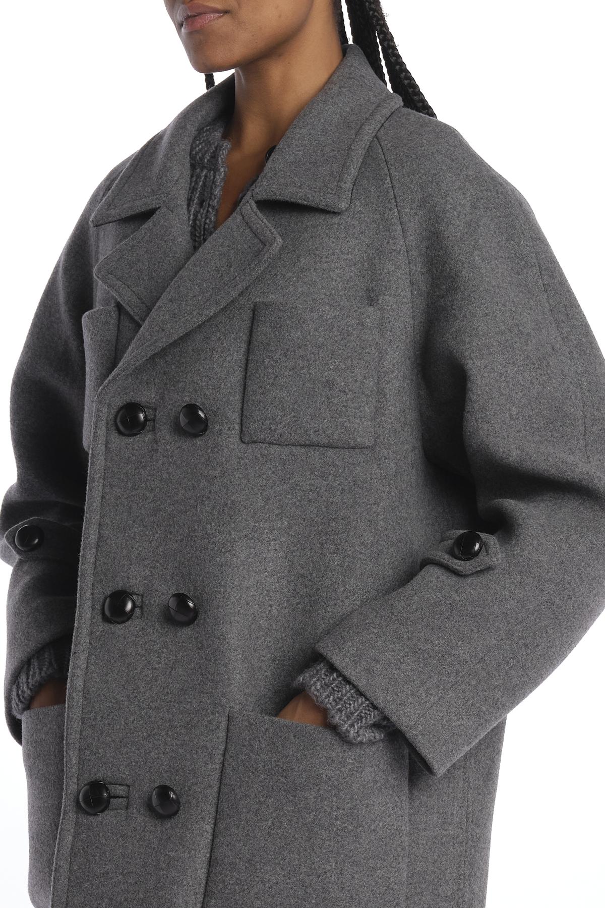 Double-breasted cloth overcoat by n21. The model is 174 cm tall and wears a size S. Composition: 75% virgin wool, 25% polyamide.