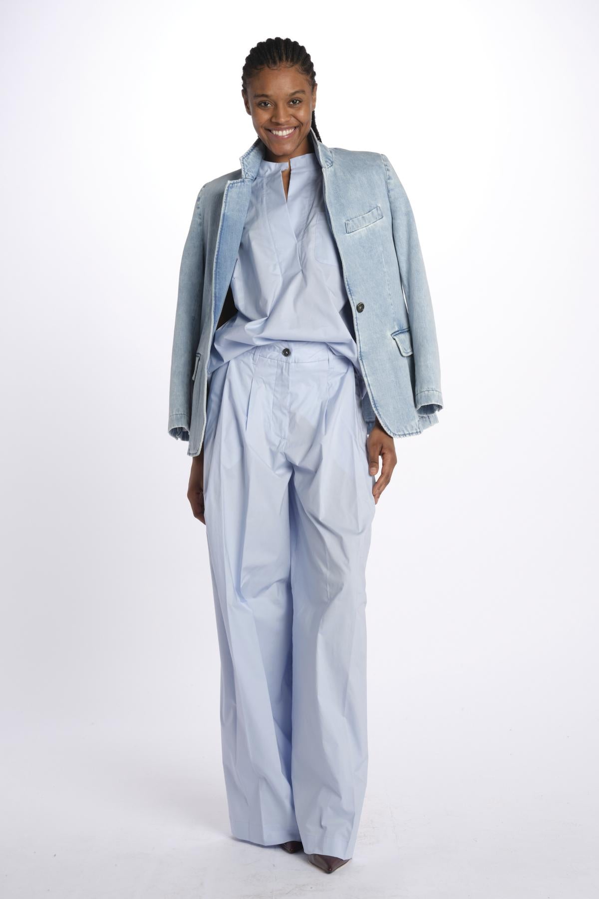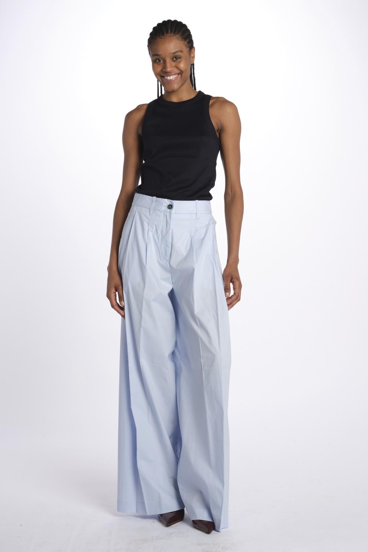 Pant PETRA 2 pinces popeline by nine in the morning. The model is 174 cm tall and wears a size 25. Composition: 92% cotton, 5% elastane, 3% silk.