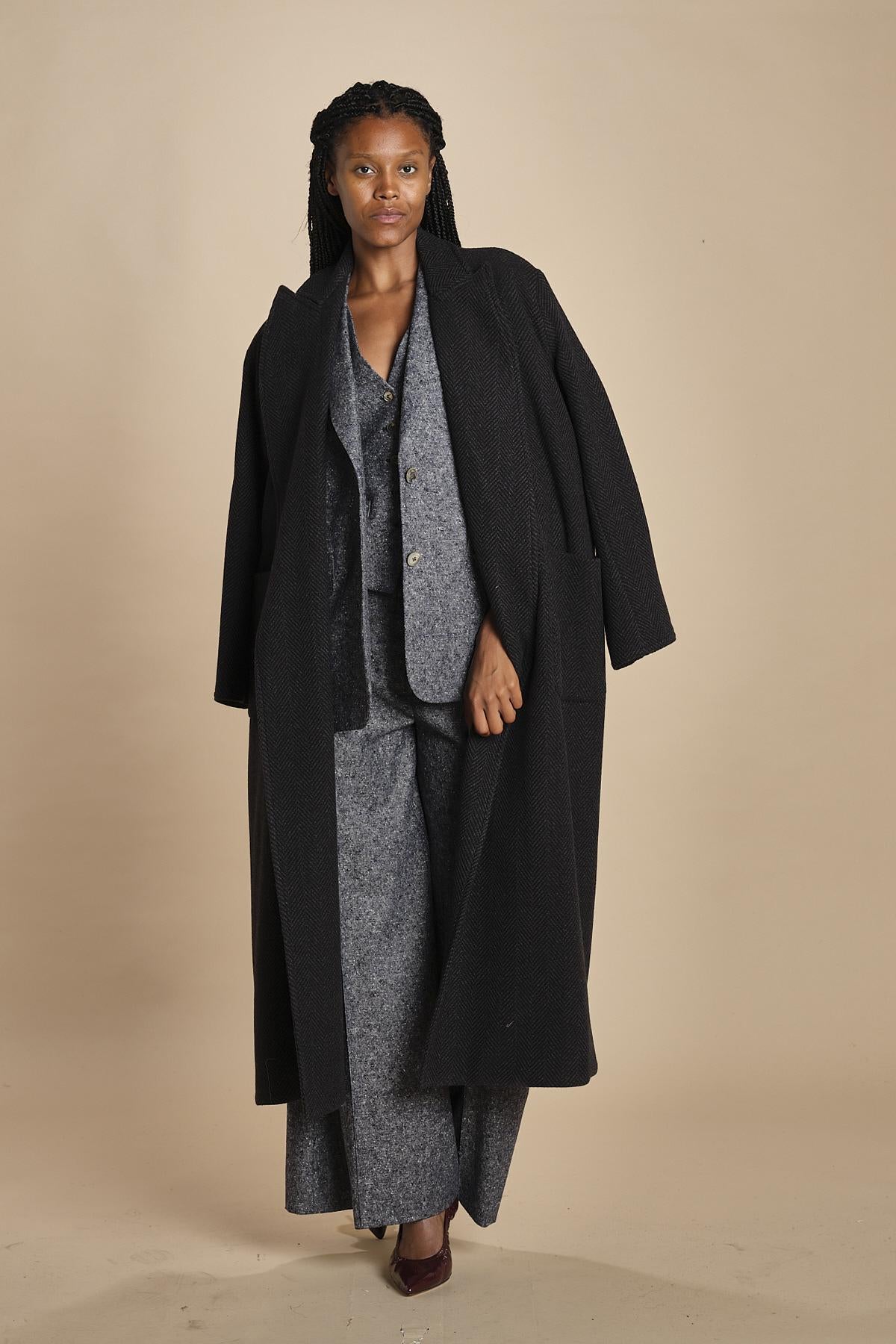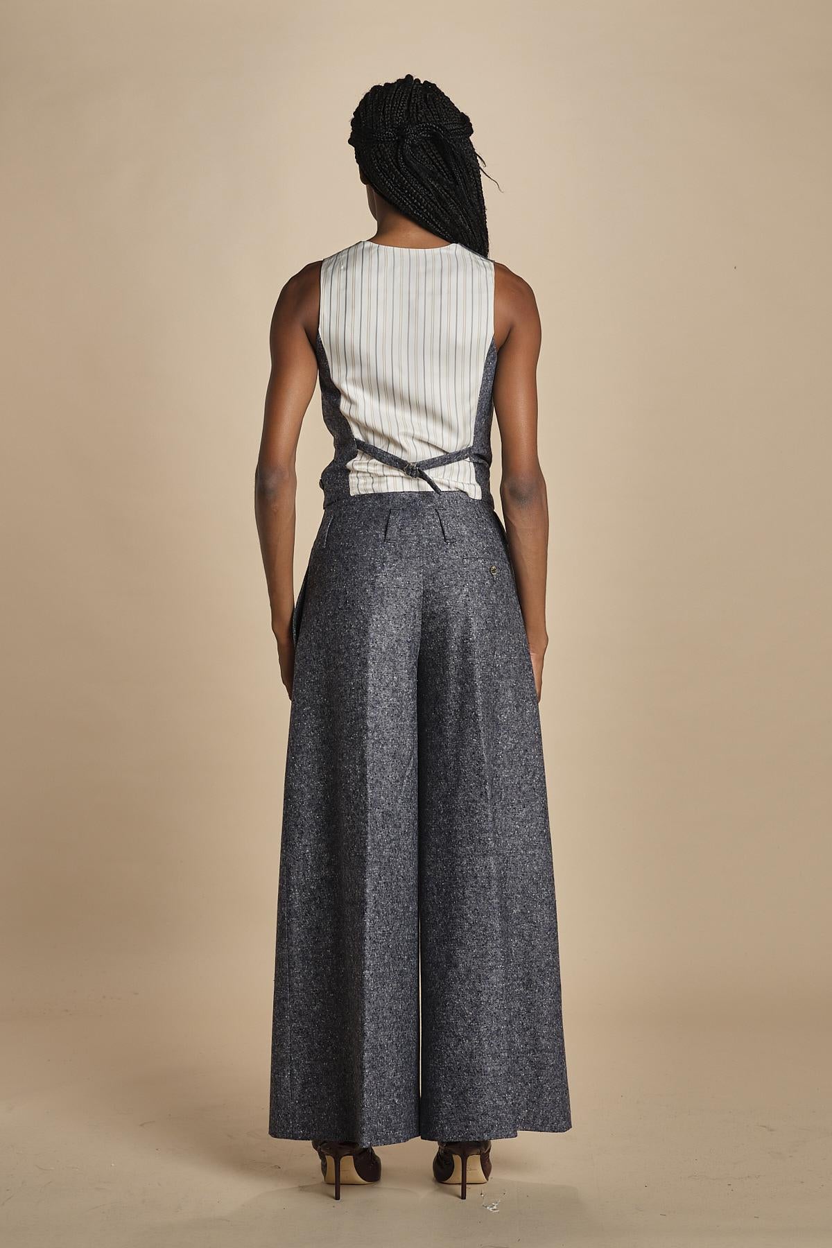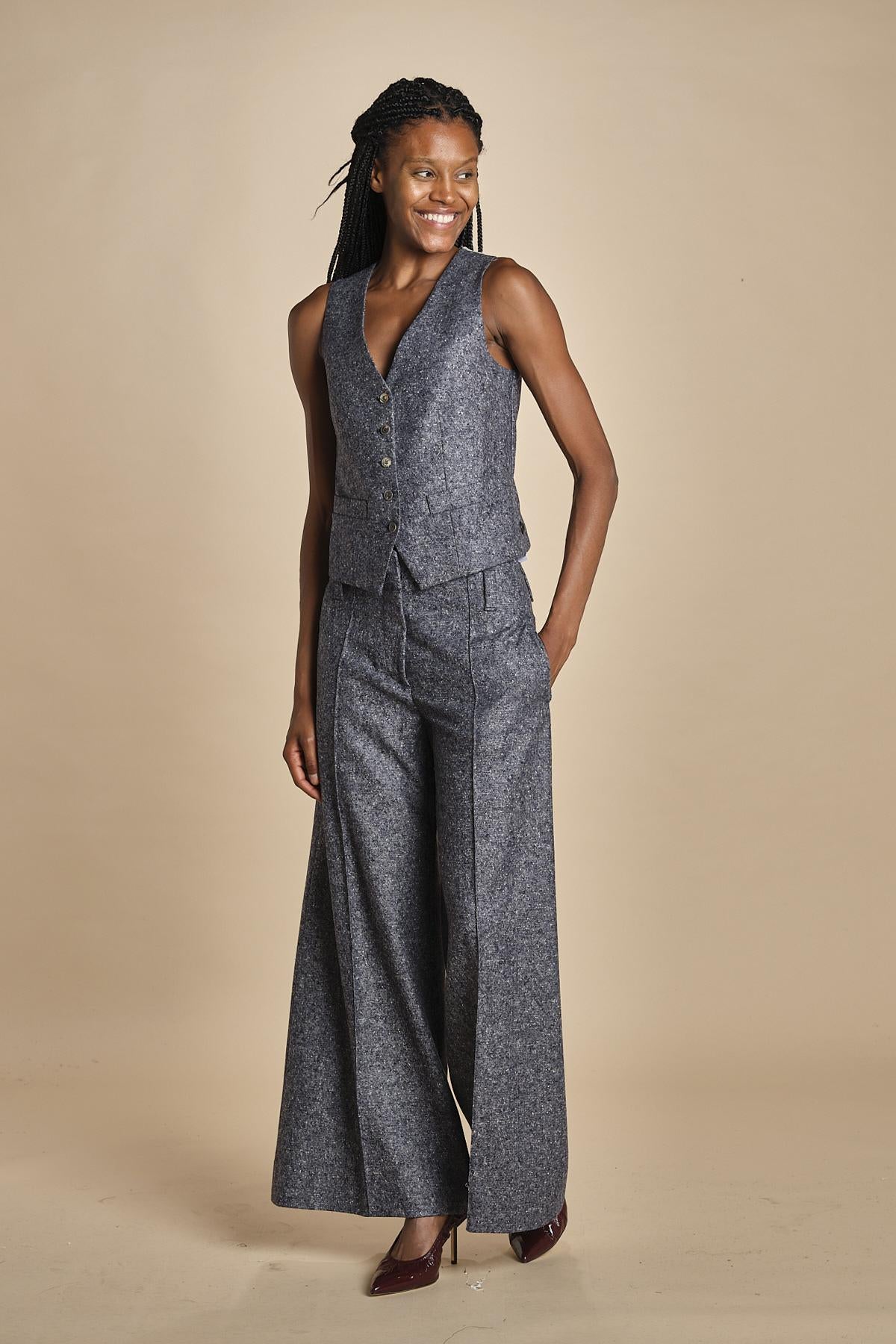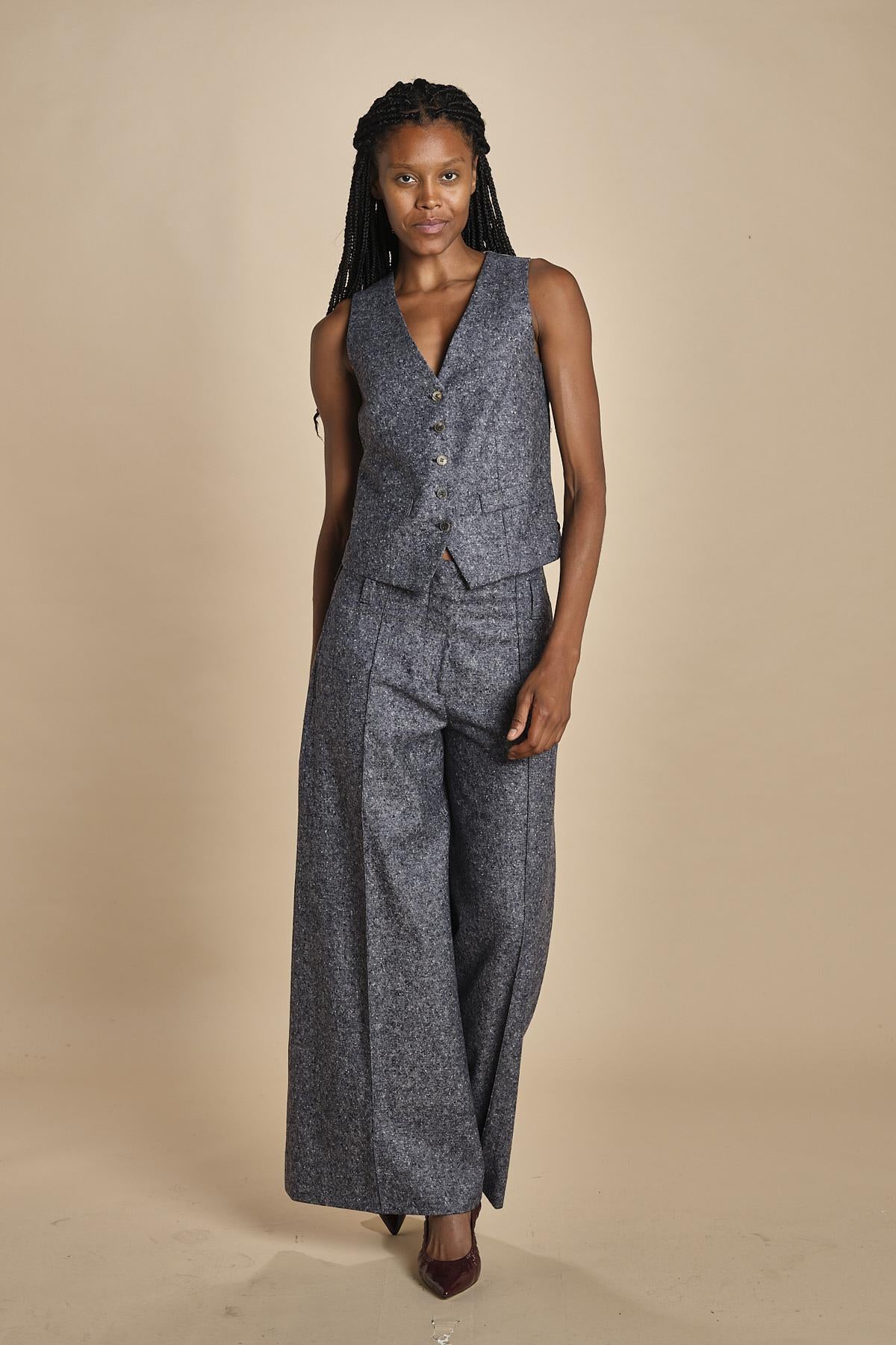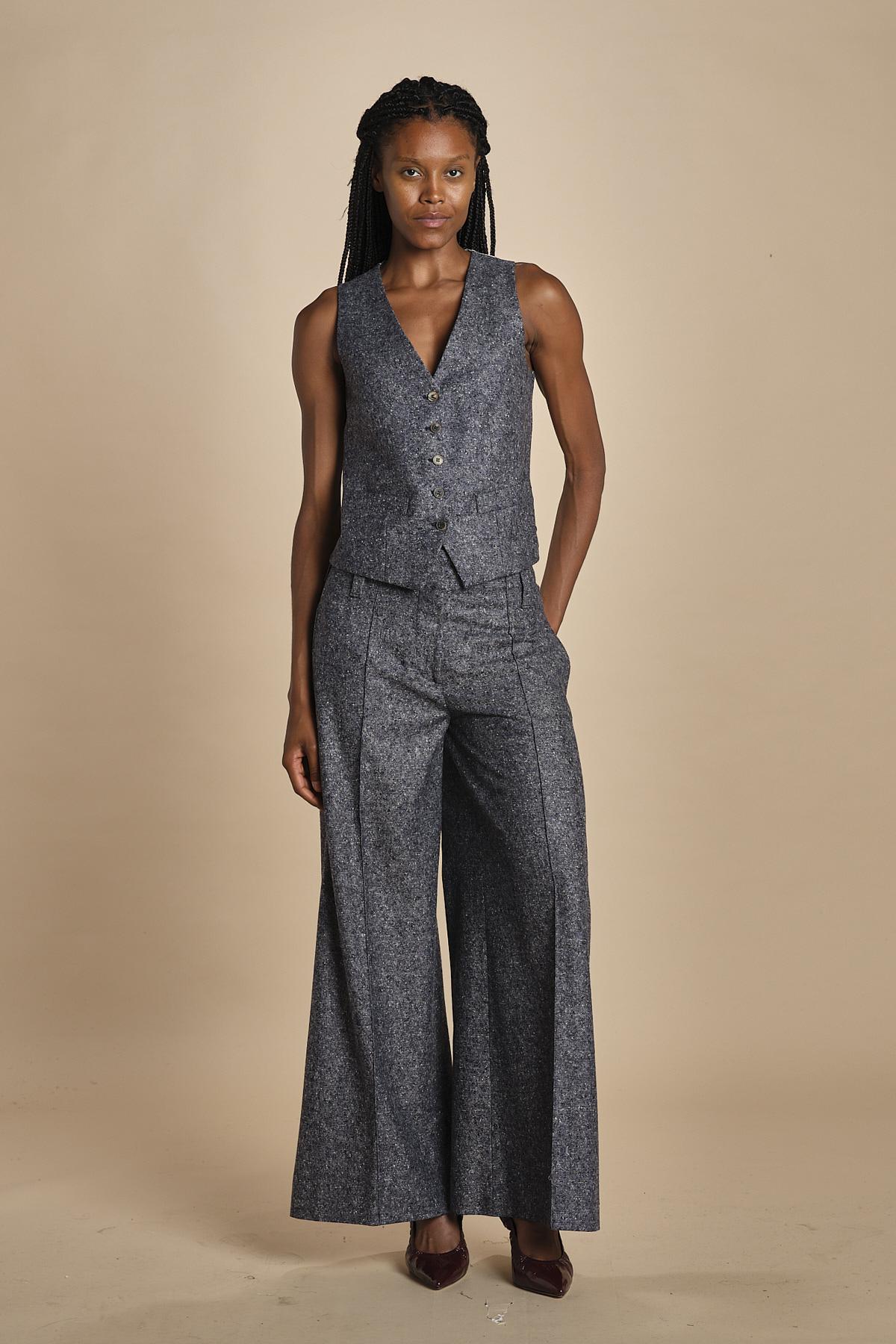 pantalone over con nervature in occhio di pernice by quelledue. La modella è alta 174 cm e indossa una taglia S. Composizione: 100% lana vergine.