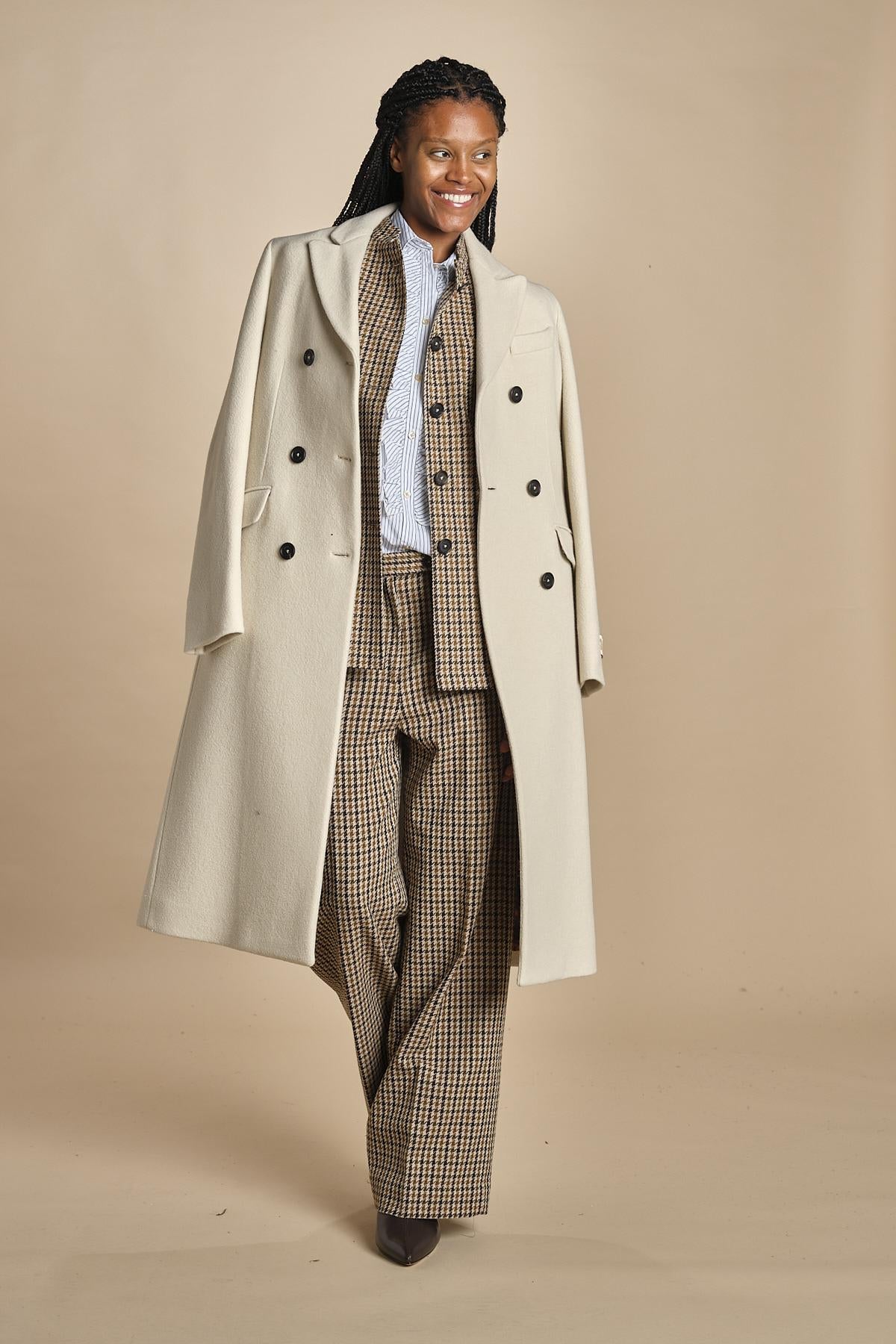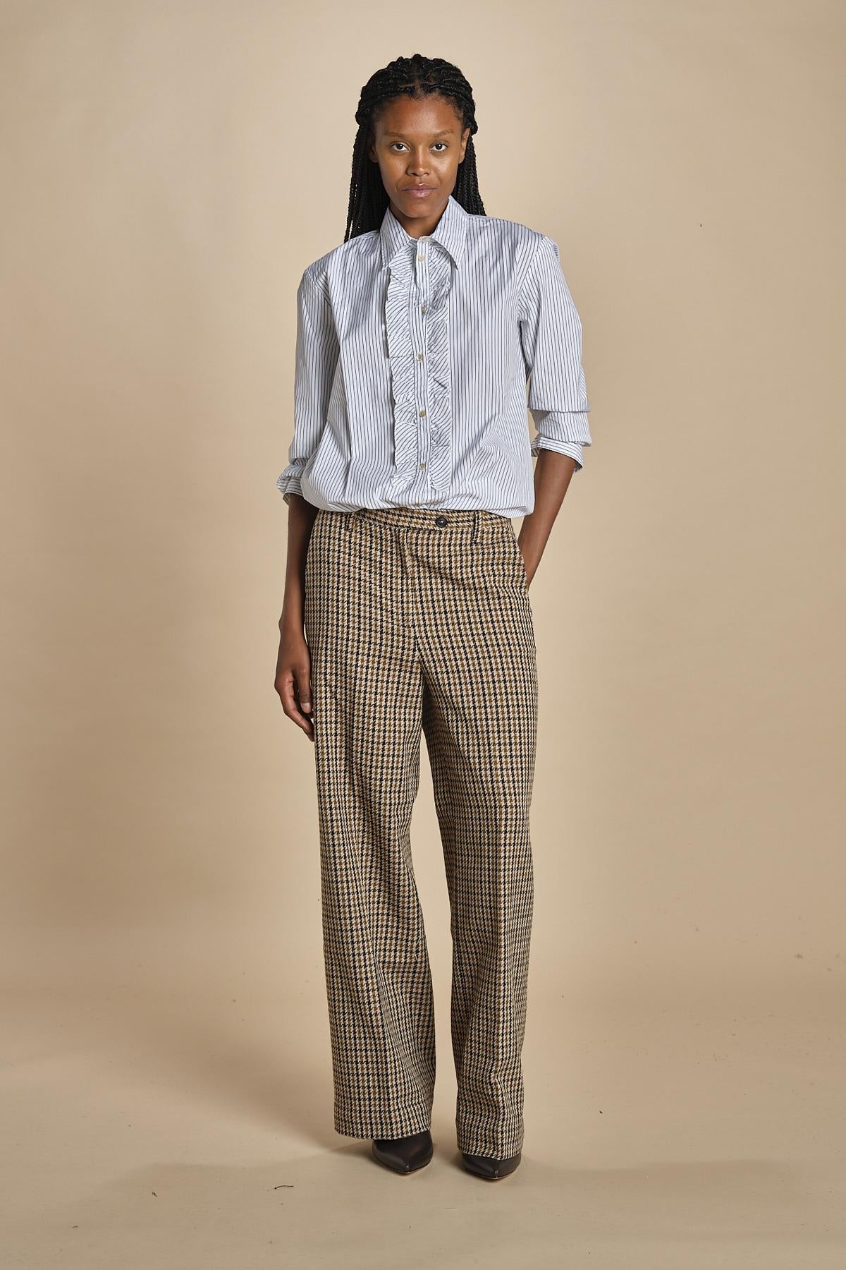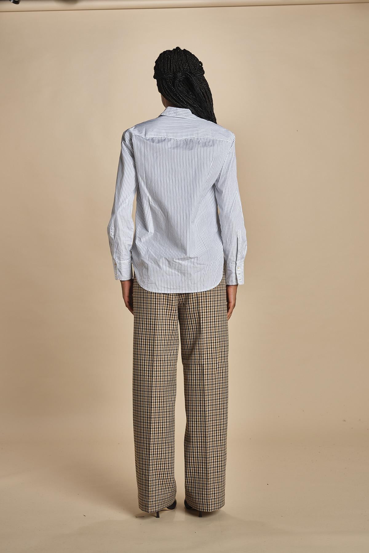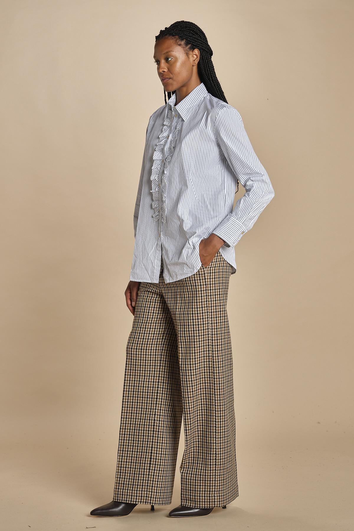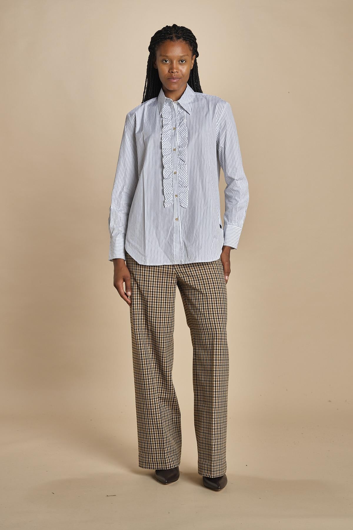 Camicia con rouches a righe. La modella è alta 174 cm e indossa una taglia S. Composizione: 92% cotone, 8% casmere.