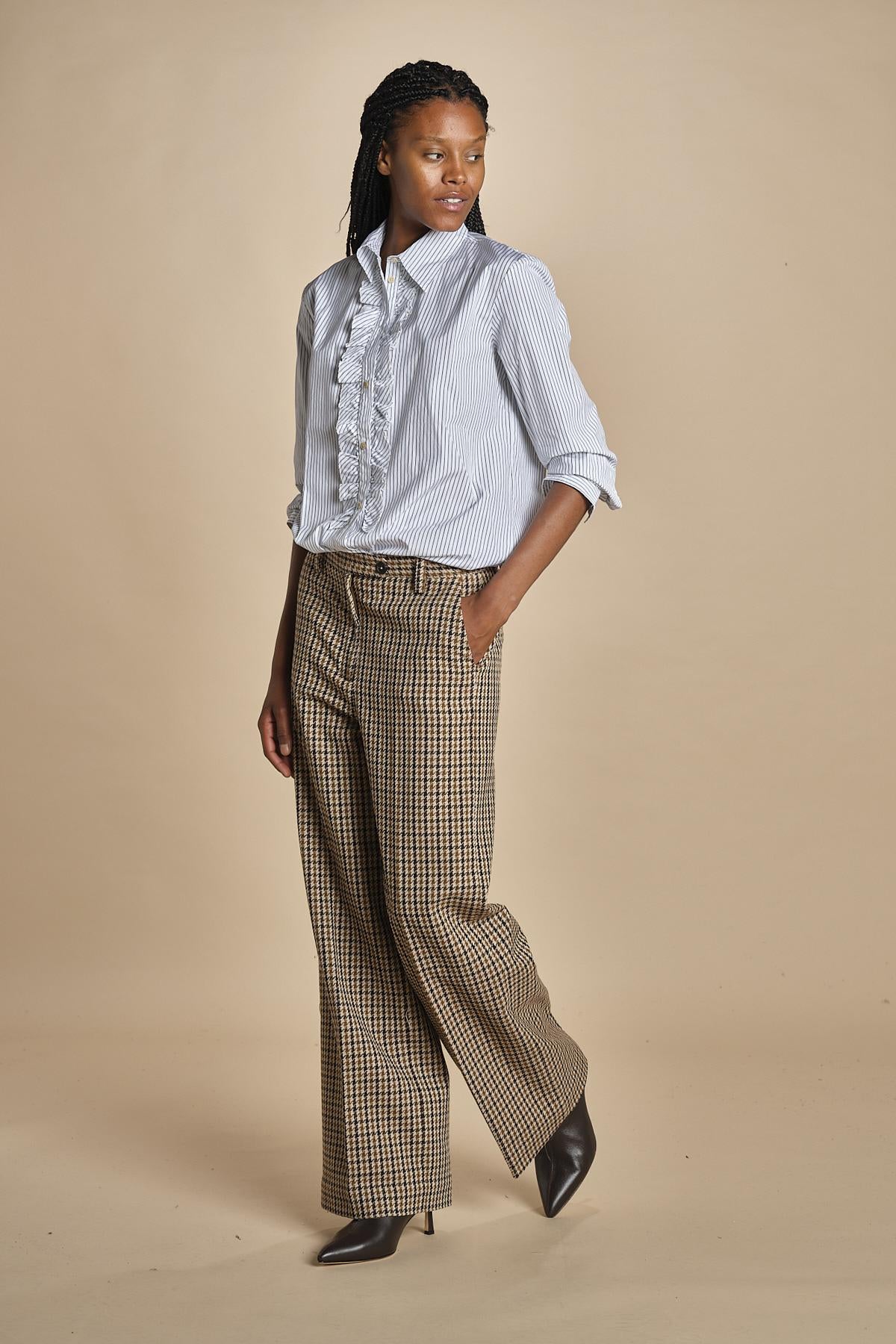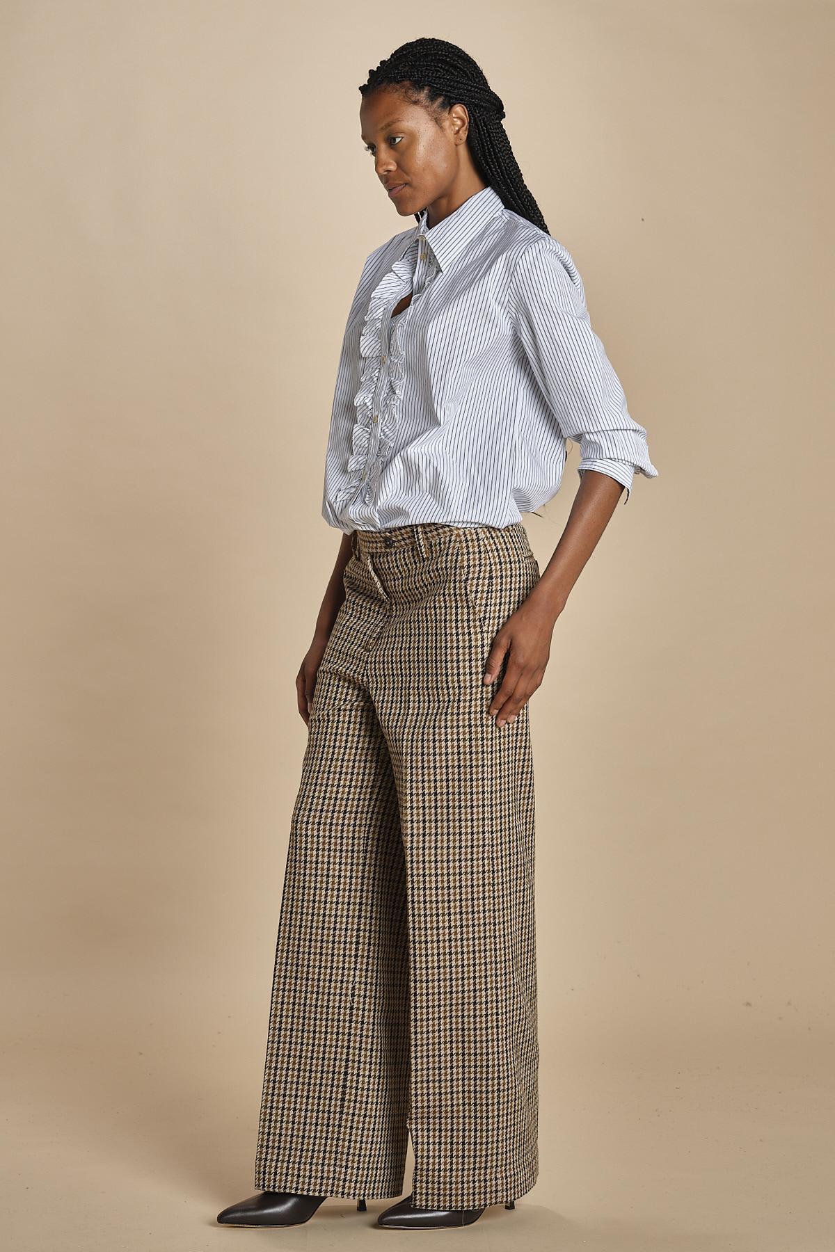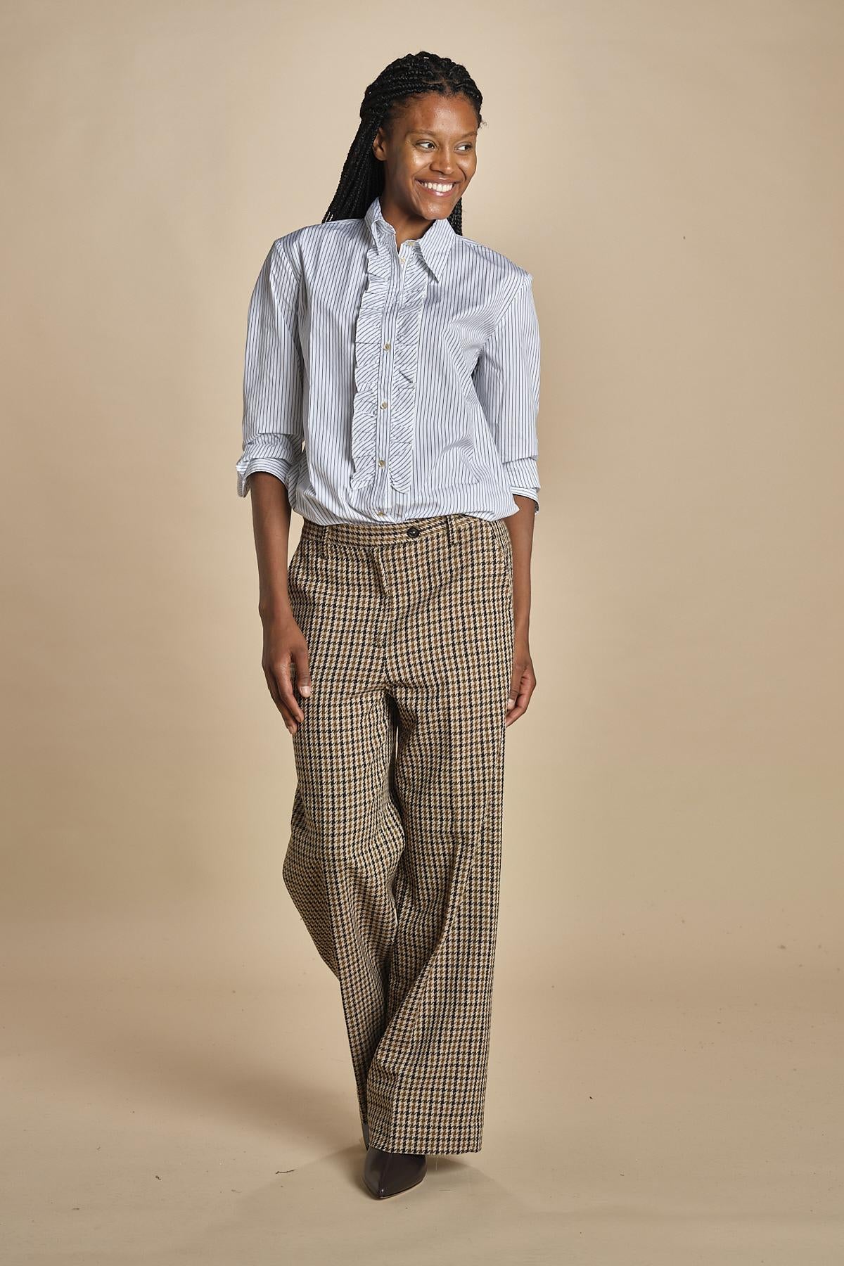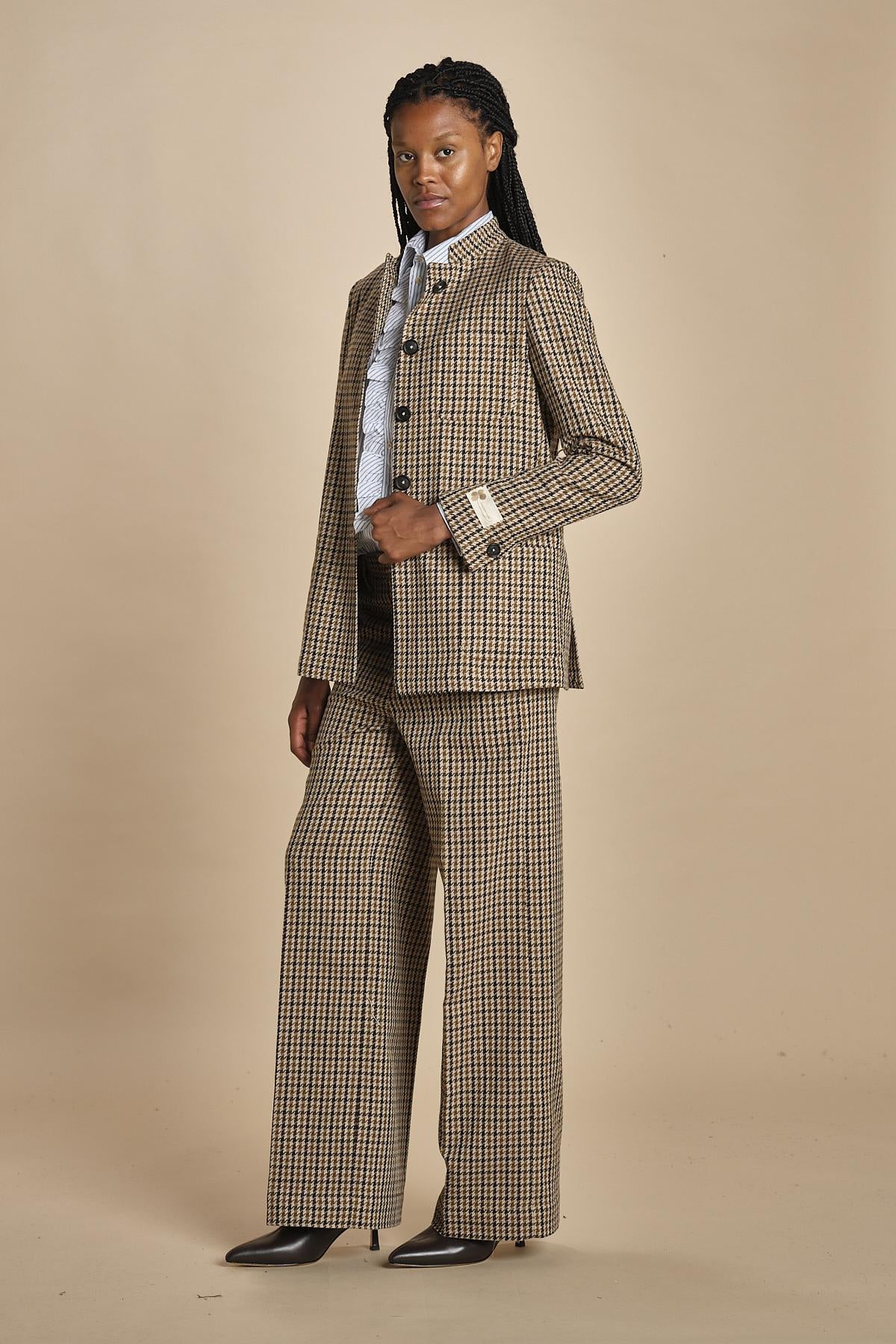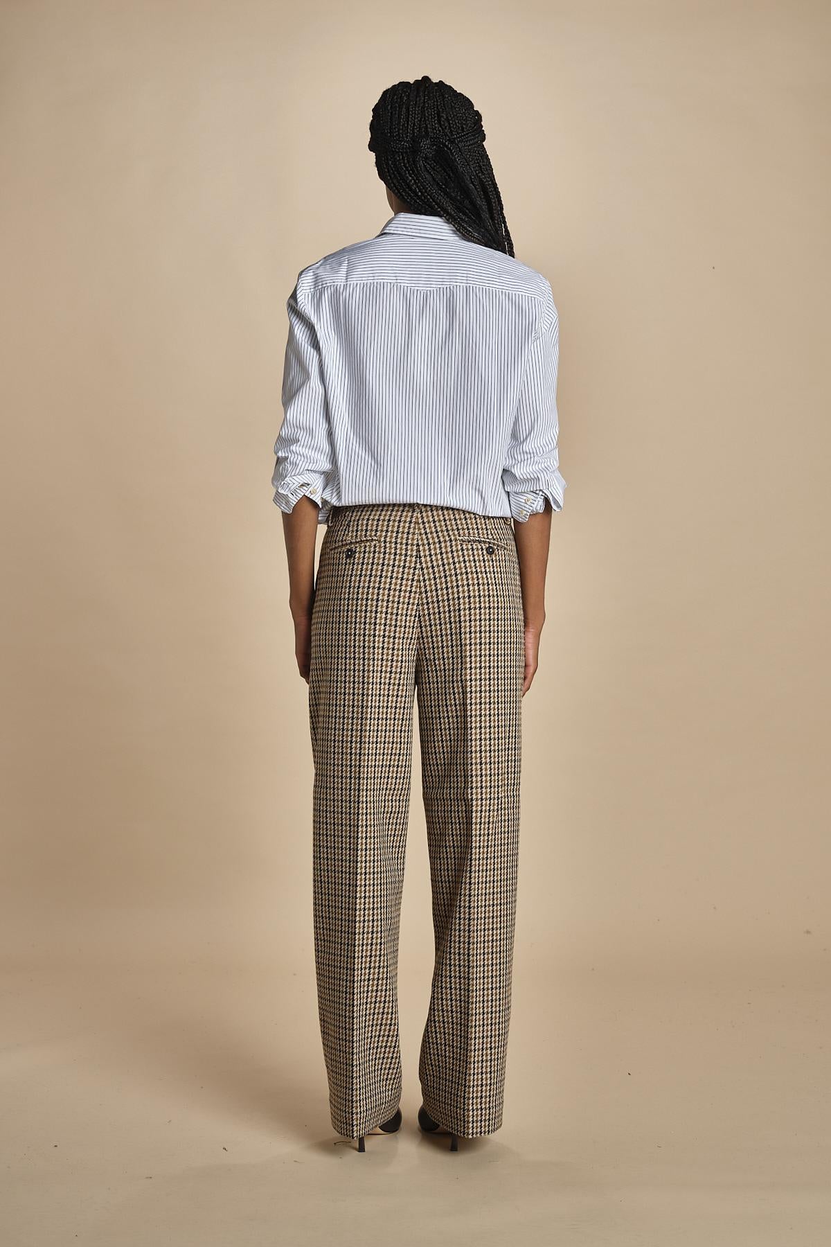 Pantalone in piedepoule by massimo alba. La modella è alta 174 cm e indossa una taglia S. Composizione: 55% lana vergine, 45% cotone.