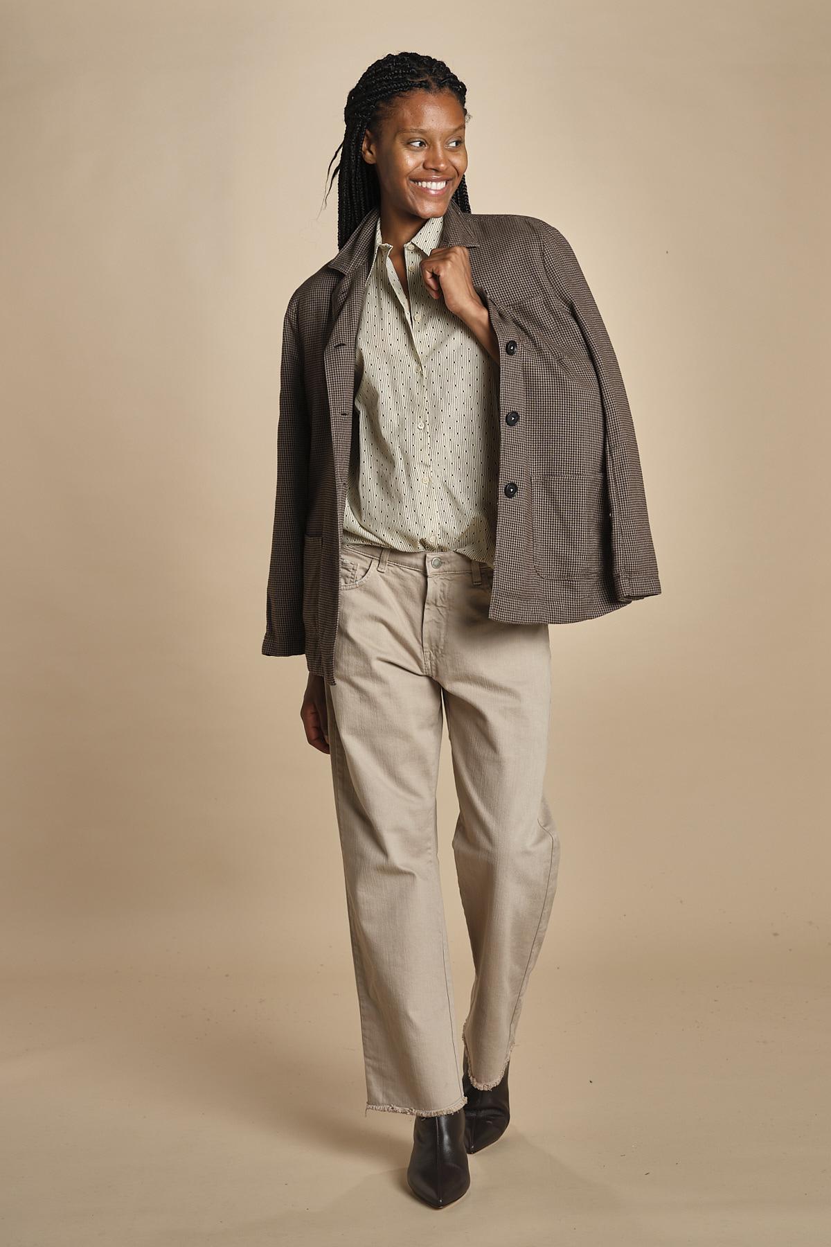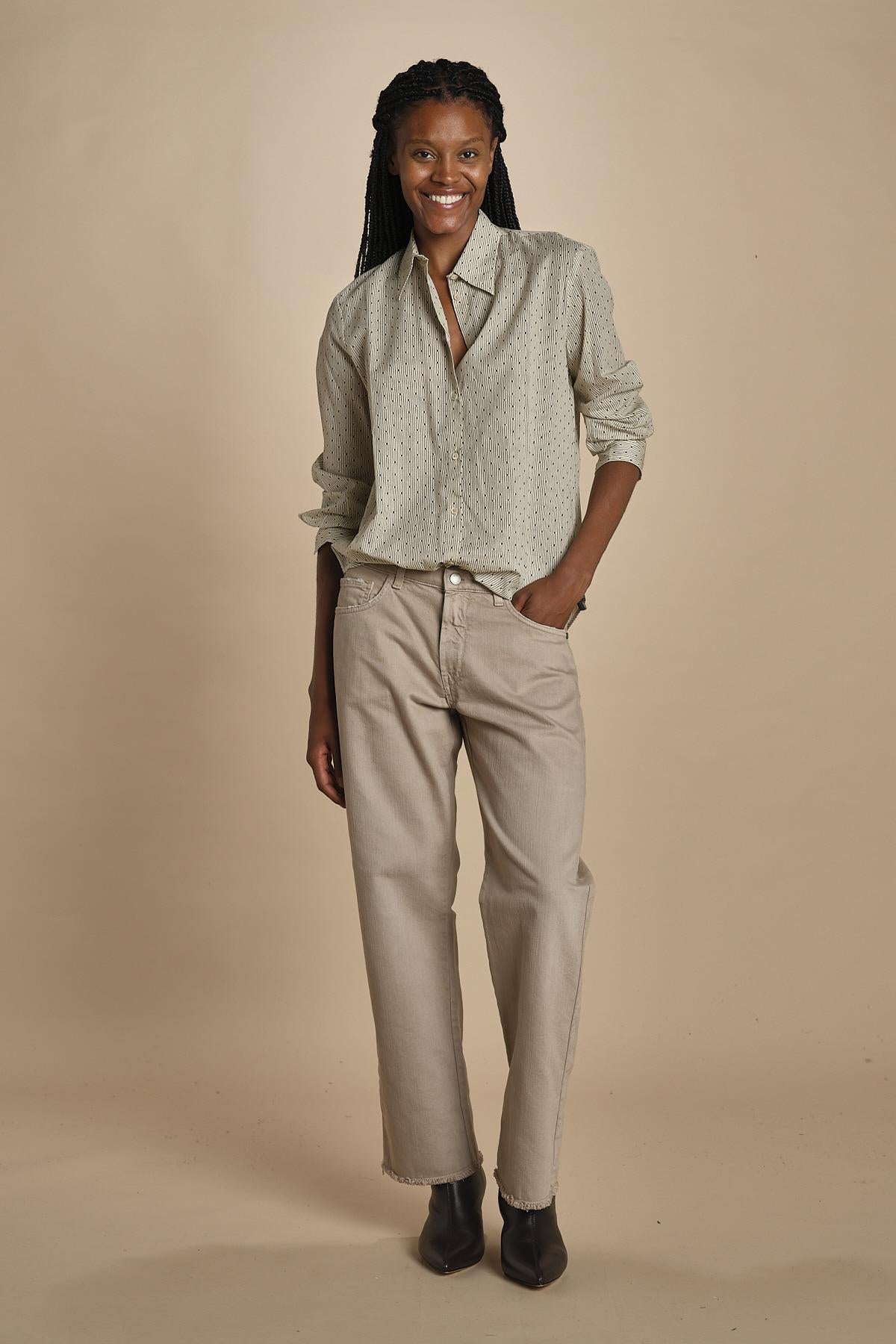 Camicia SELMA microstampa by massimo alba. La modella è alta 174 cm e indossa una taglia S. Composizione: 92% cotone, 8% casmere.