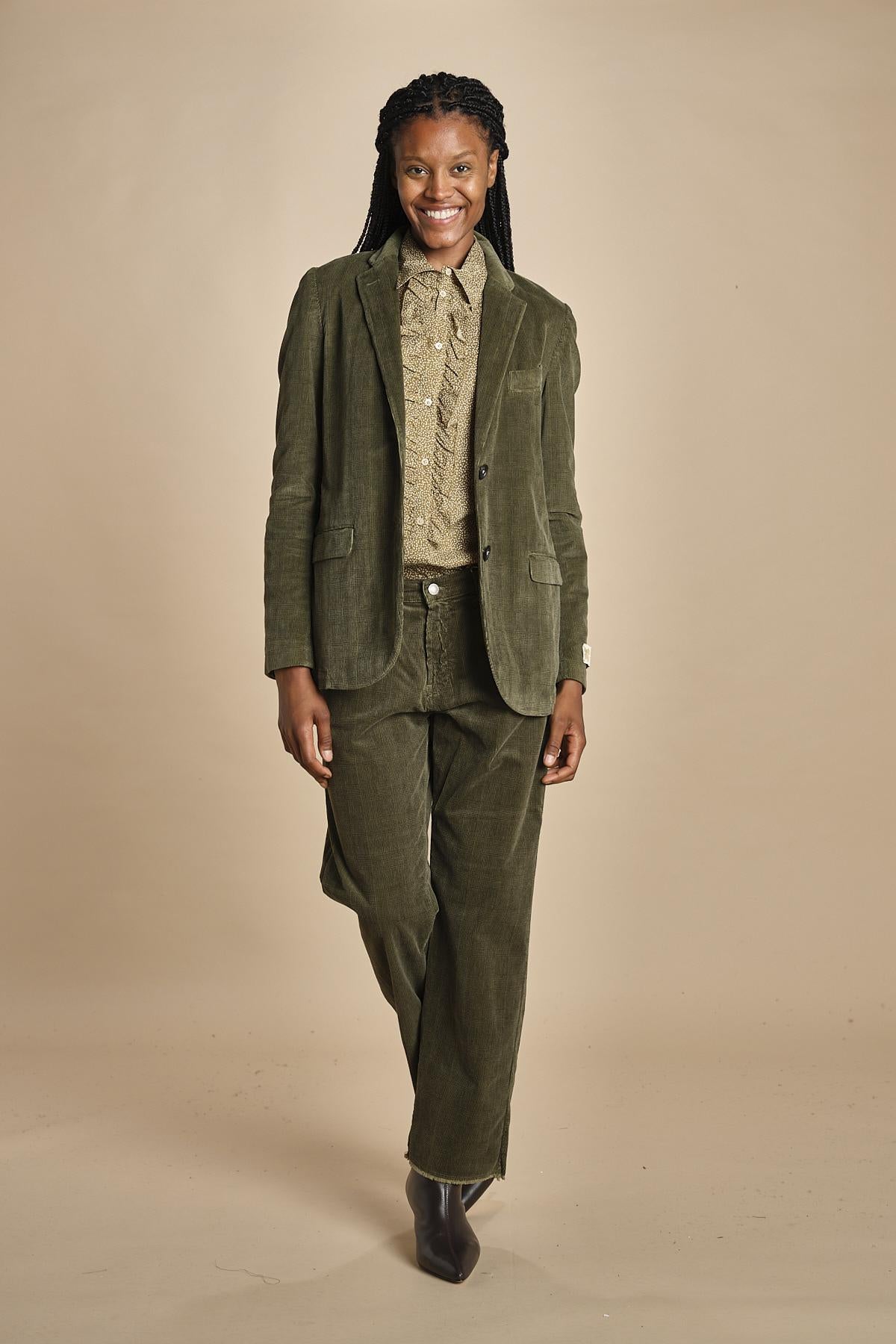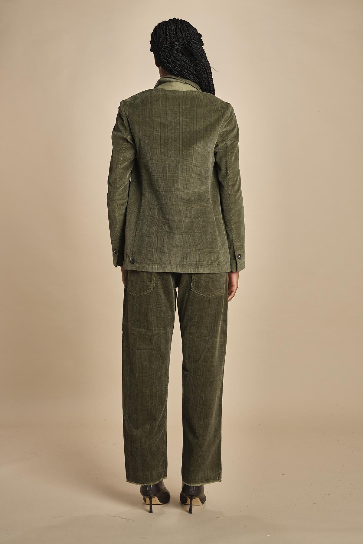 giacca in velluto galles by masismo alba. La modella è alta 174 cm e indossa una taglia S. Composizione: 63% cotone, 35% modal.