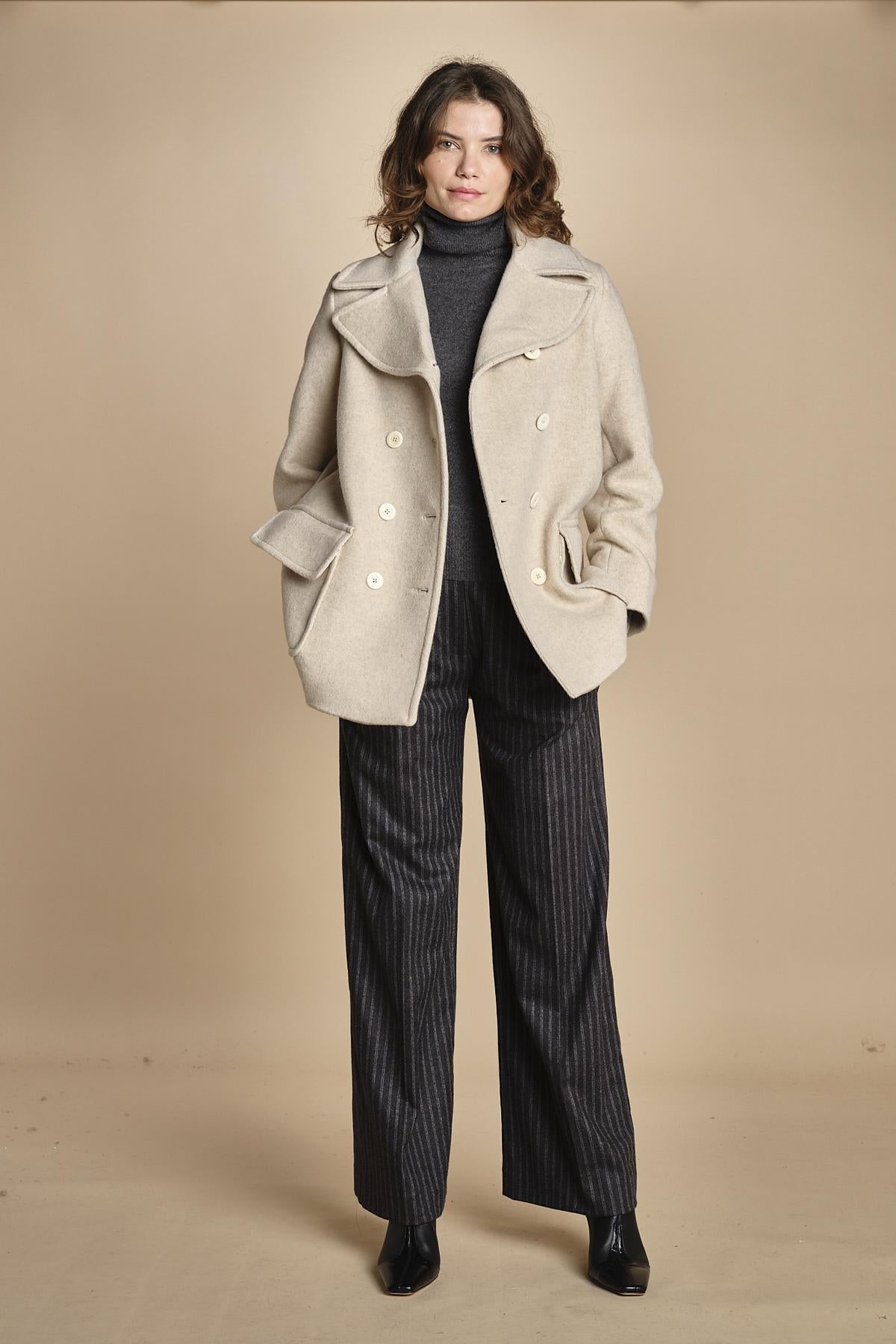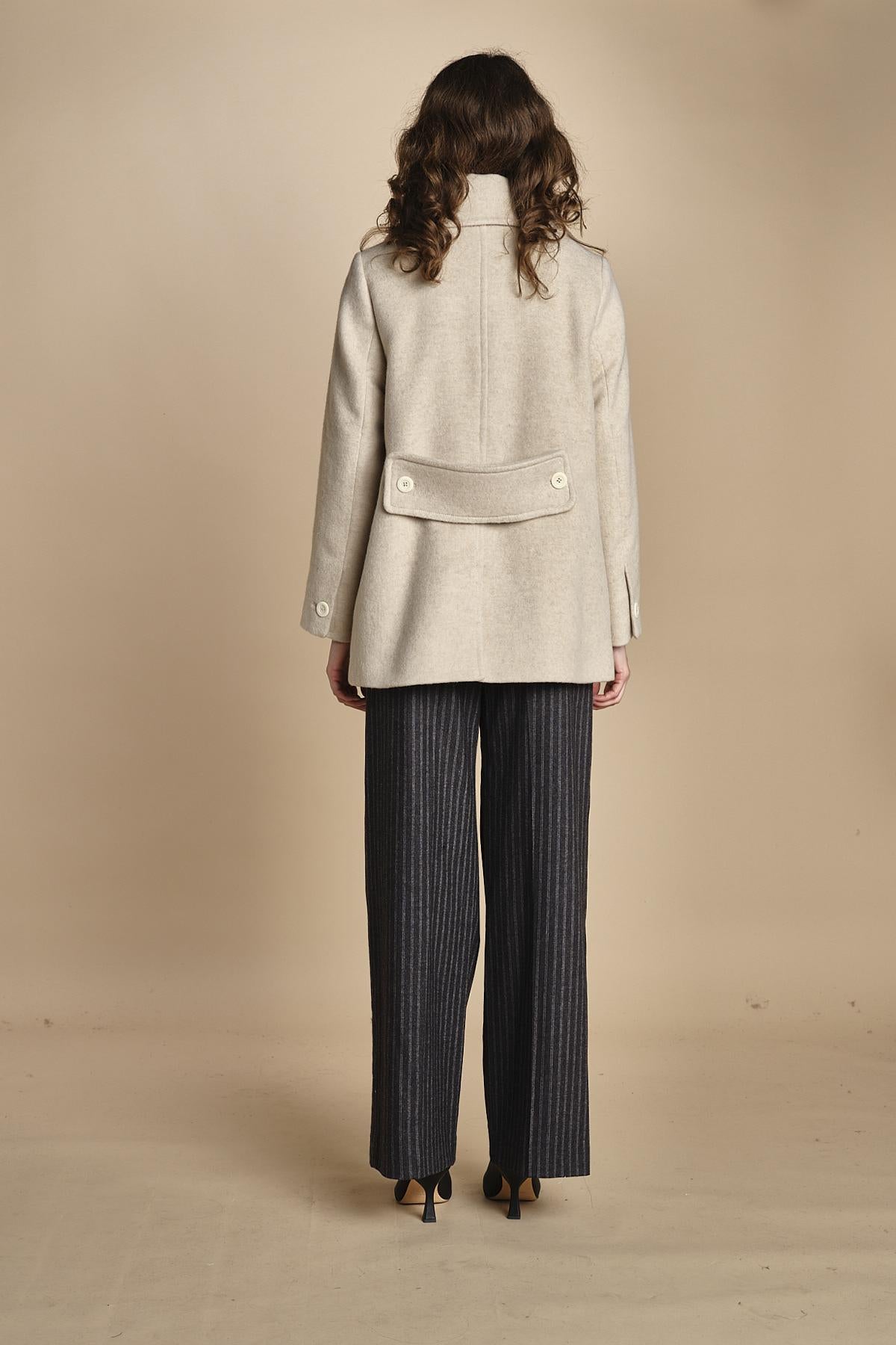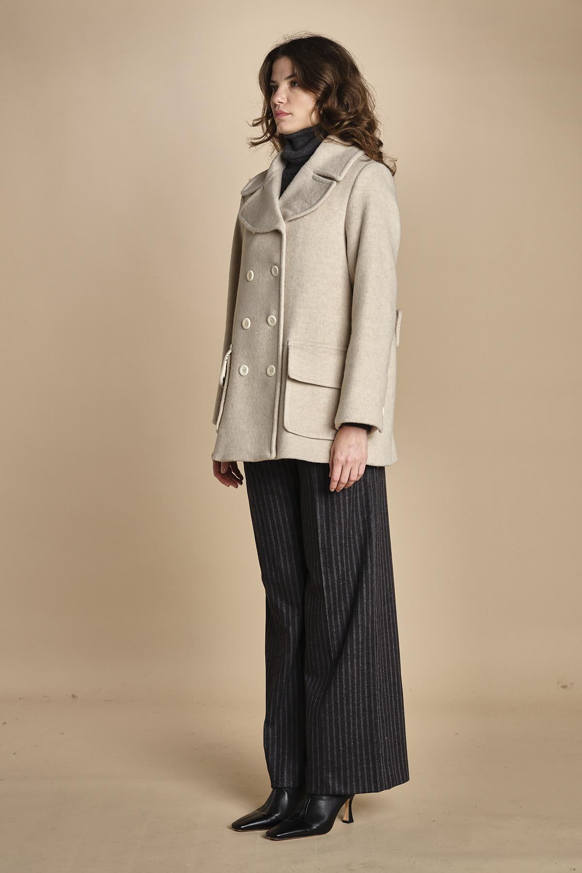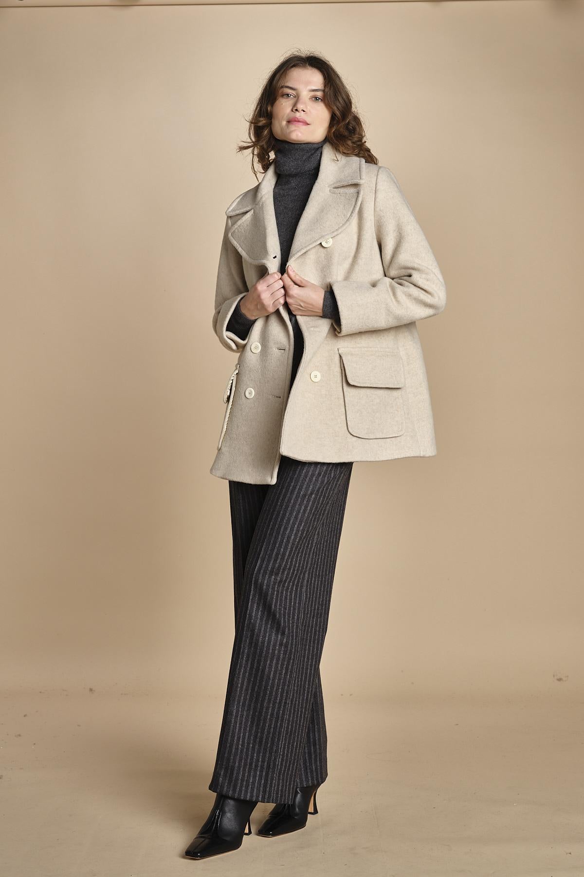 peacoau doppiopetto. La modella è alta 176 cm e indossa una taglia S. 33% lana 33% pc 27% pl 5% of " pa