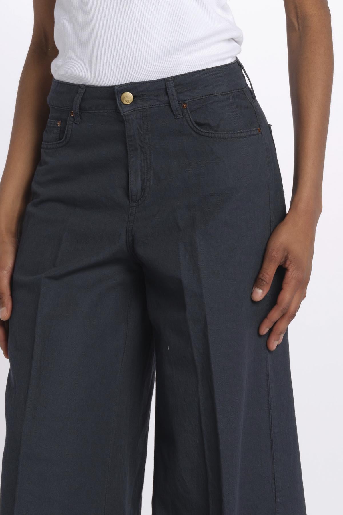 SERENA 4-pocket linen blend trousers by ps don't forget me. The model is 174 cm tall and wears a 27 (IT42). Composition: 43% cotton, 32% linen, 23% tencel, 2% elastane.