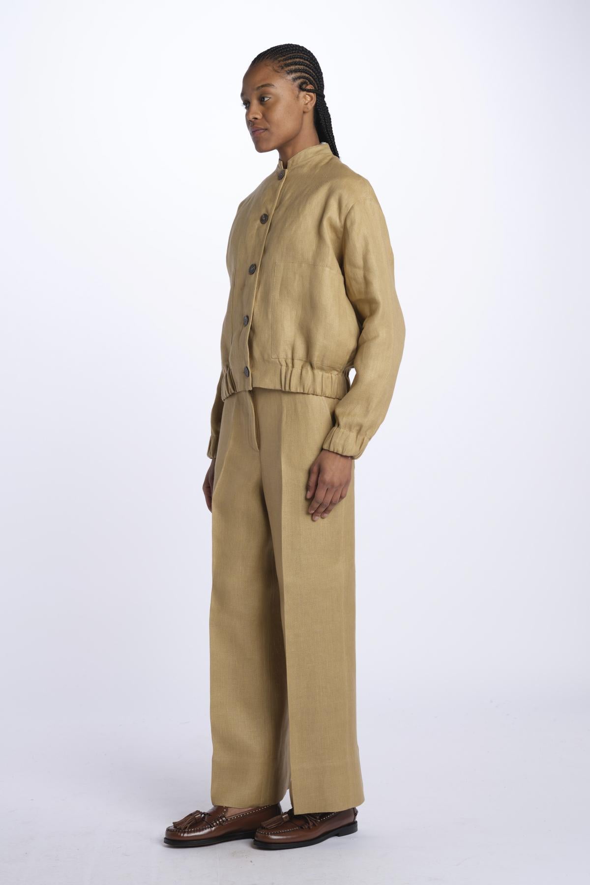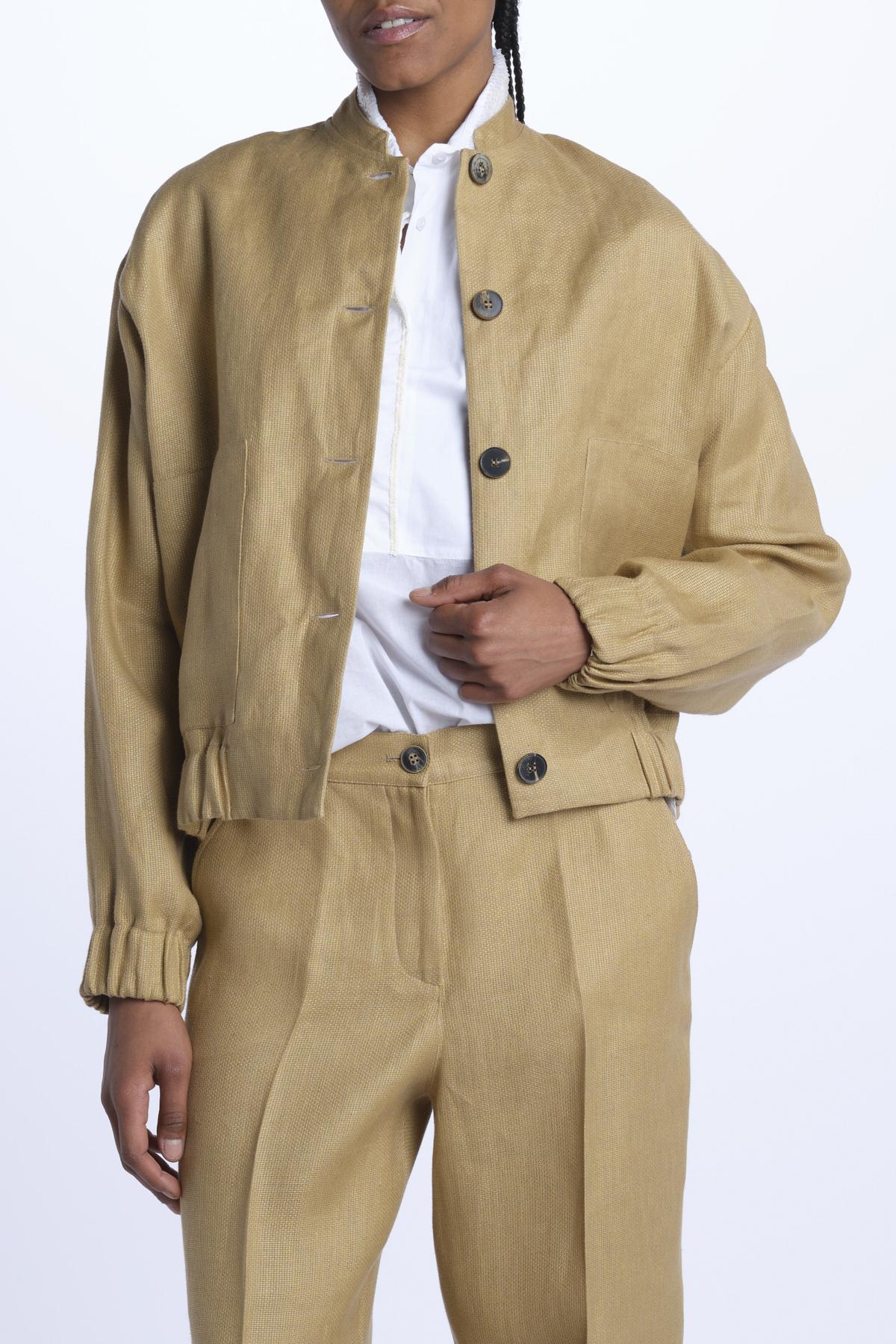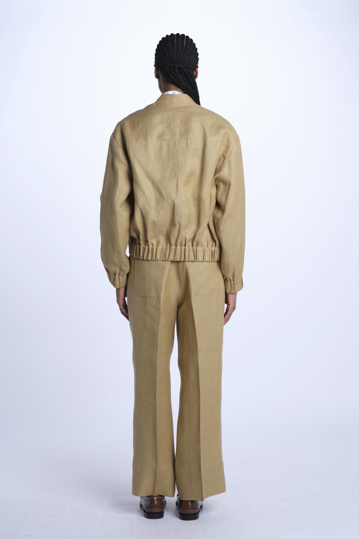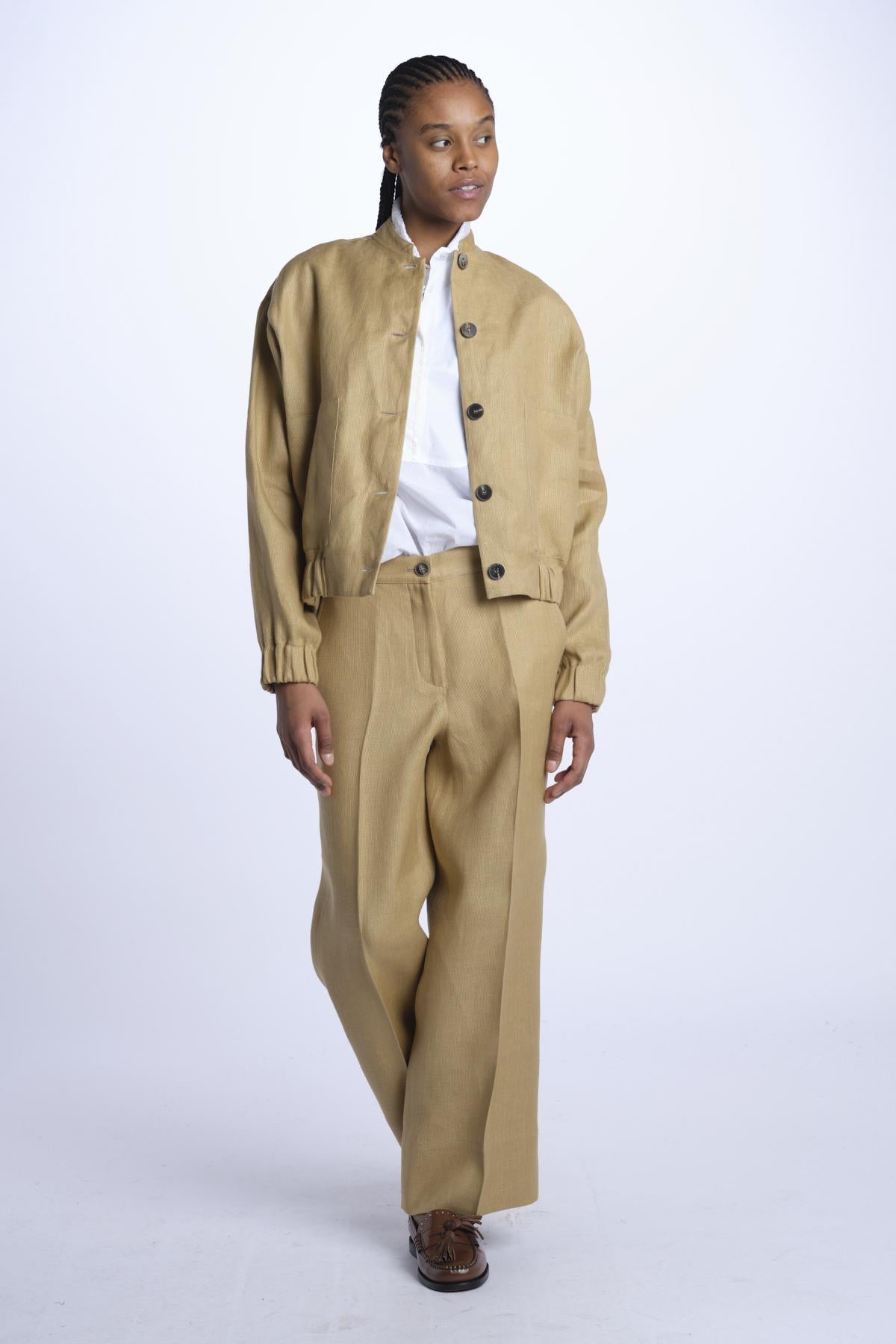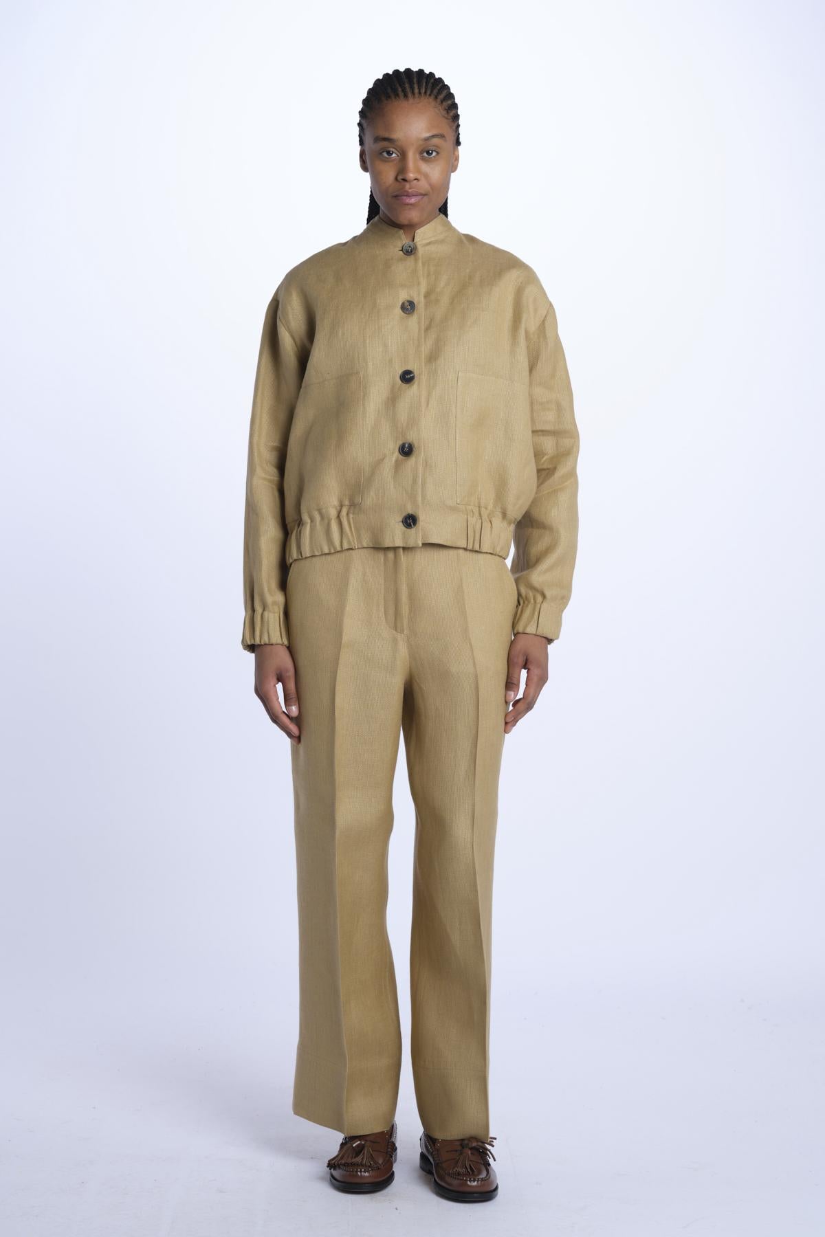 Bomber BEN linen hemp by quelledue. The model is 174 cm tall and wears a size 40. Composition: 100% hemp.