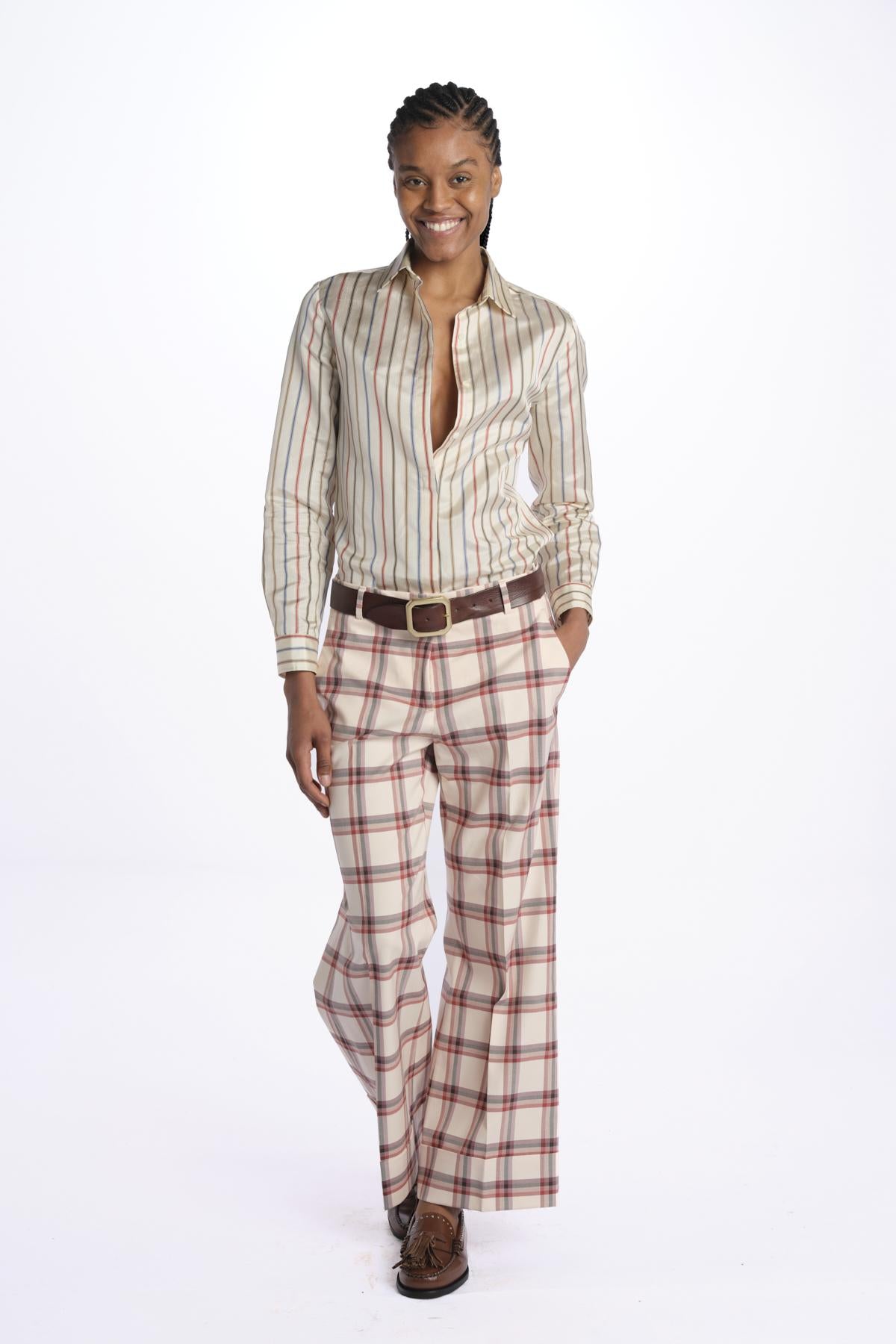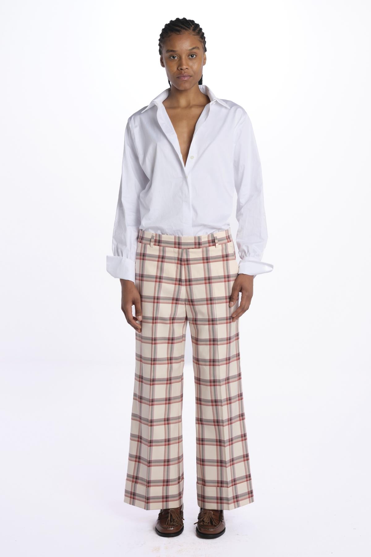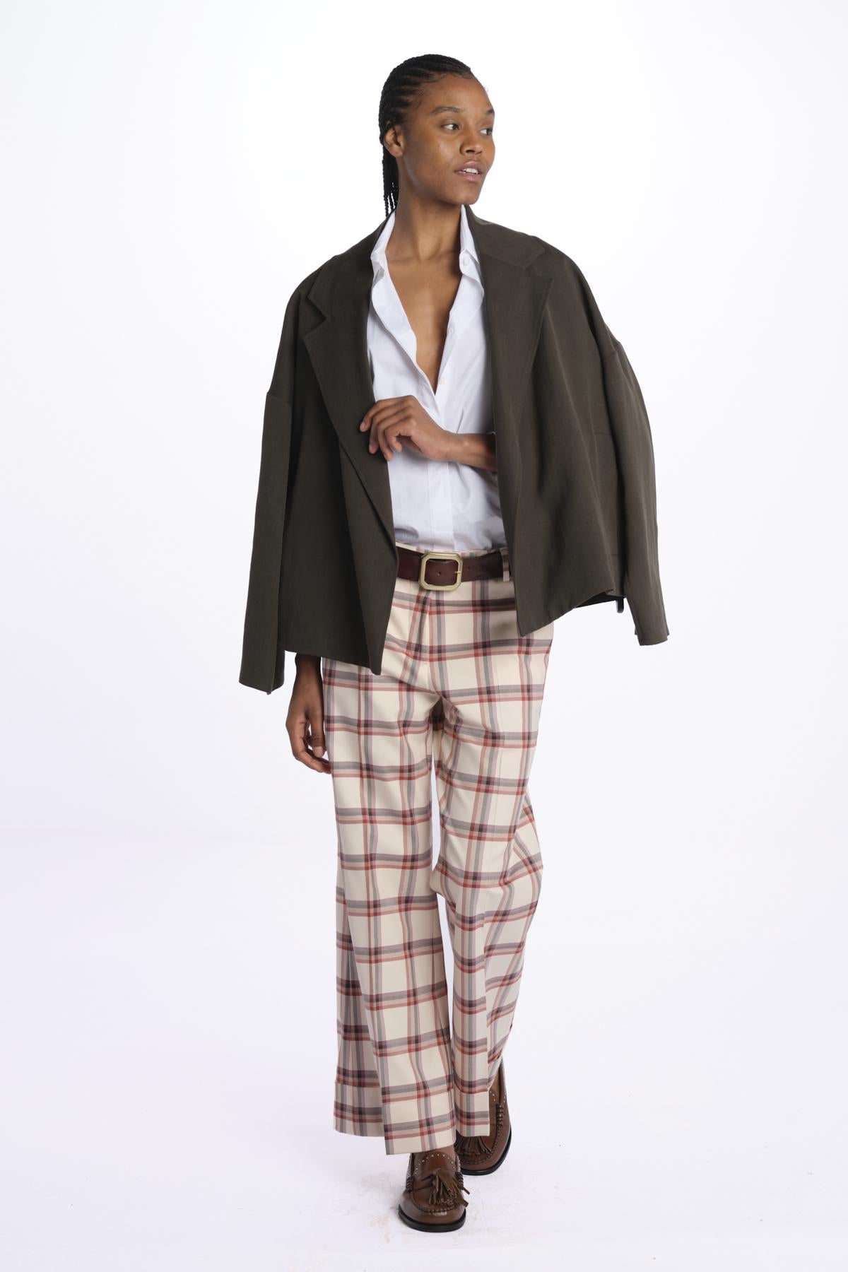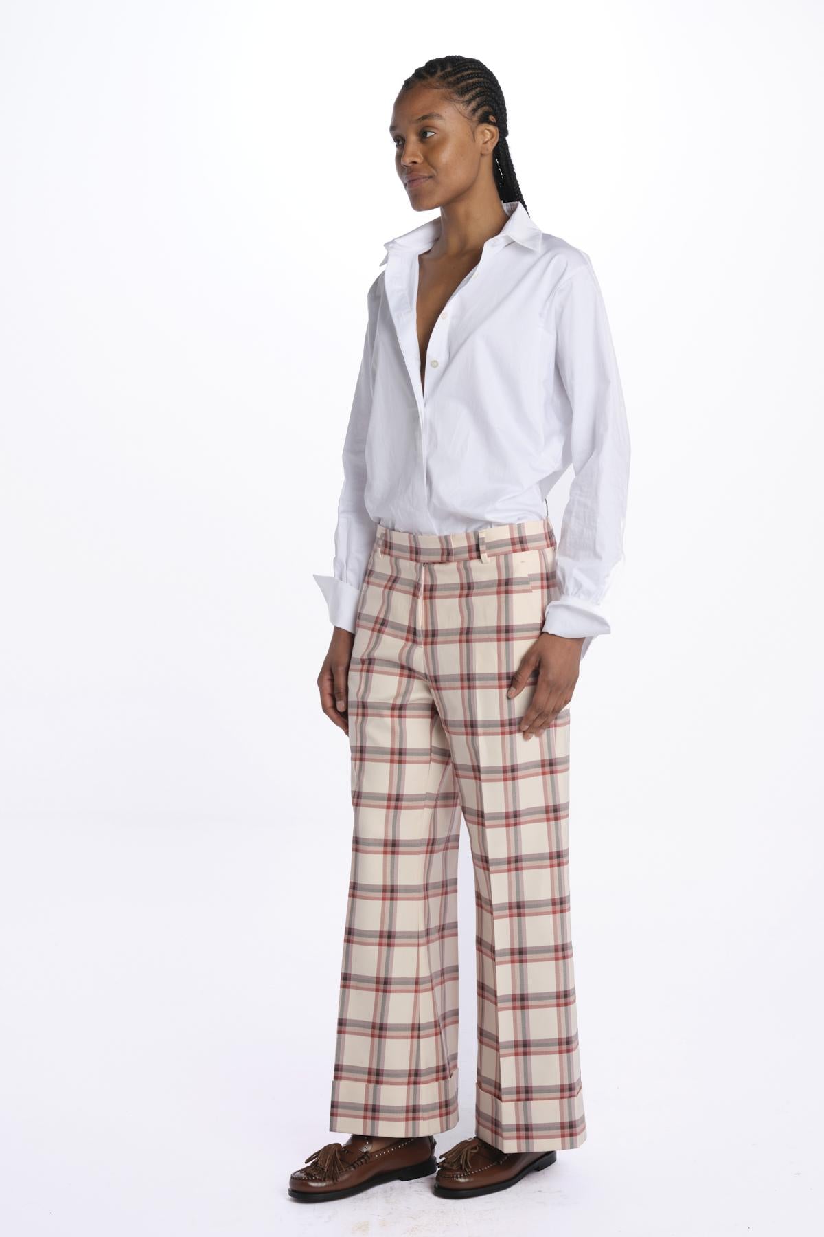 MELODIA checked trousers with cuff by quelledue. The model is 174 cm tall and wears a size 38. Composition: 98% cotton, 2% elastane.