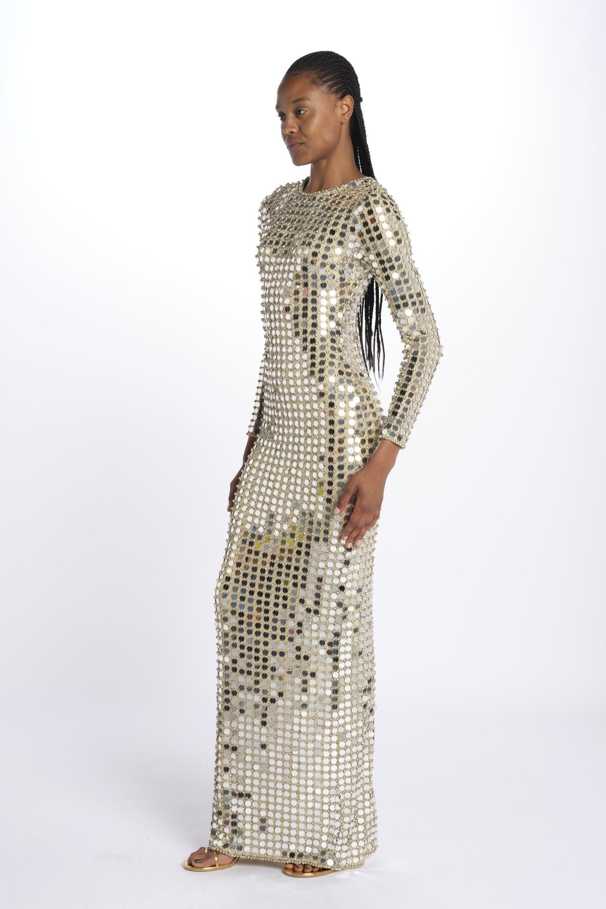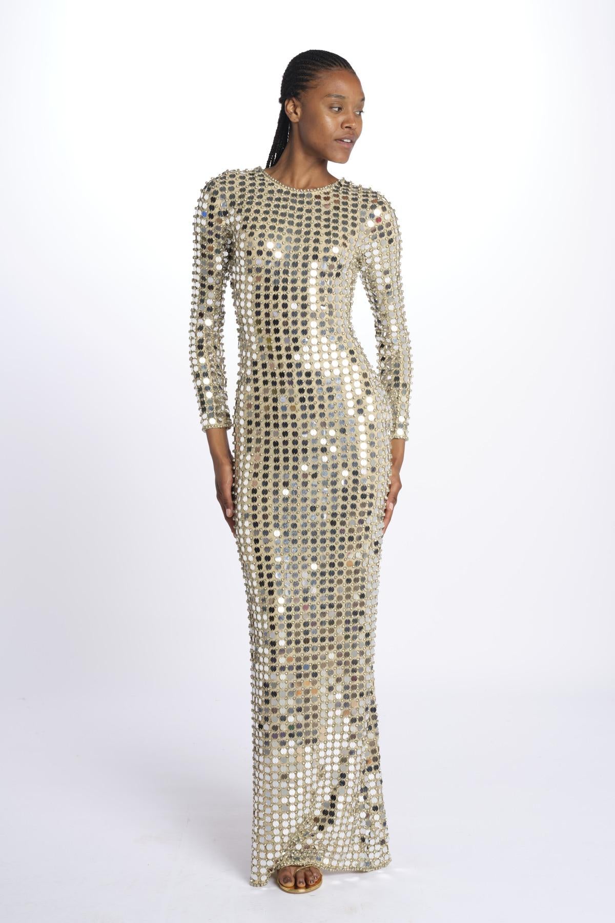RIALTA large paillette long dress by retrofete. The model is 174 cm tall and wears a size XS. Composition: 95% nylon, 5% spandex.