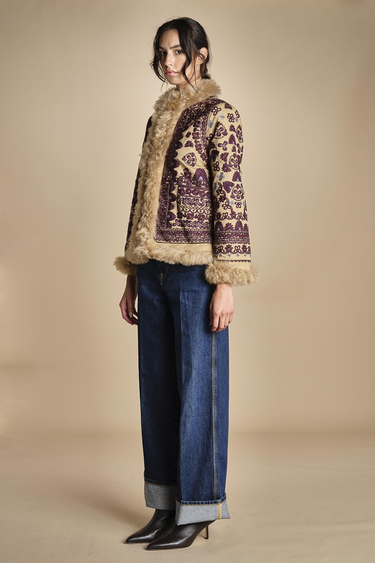 giacca ricamata con montone, La modella è alta 180 cm e indossa una taglia XS. 100% COTONE