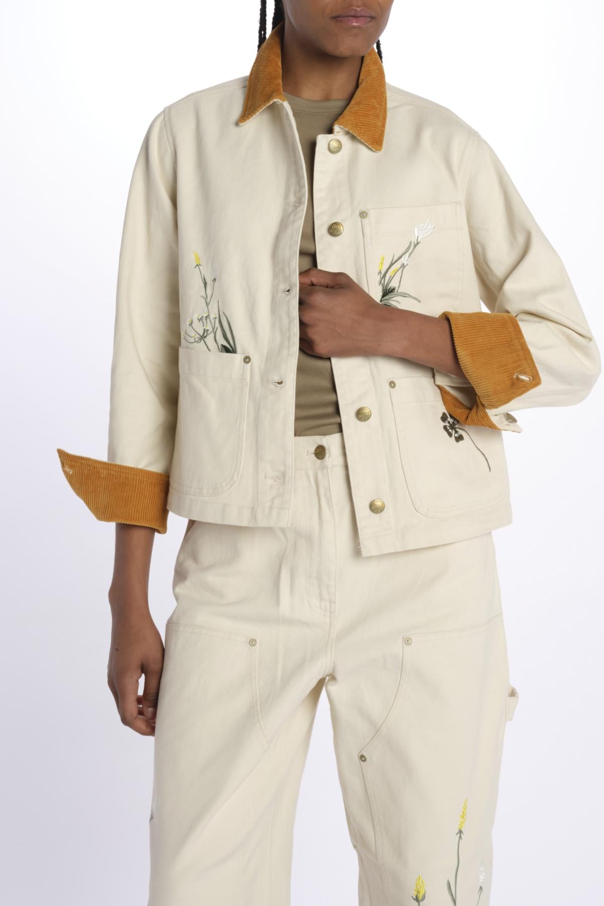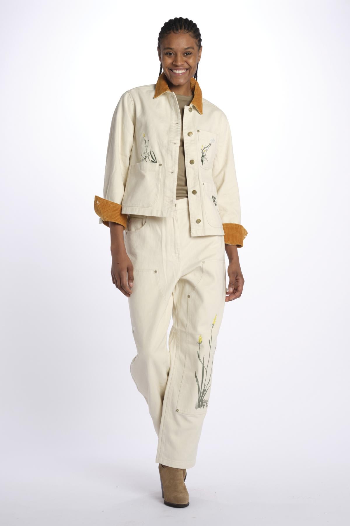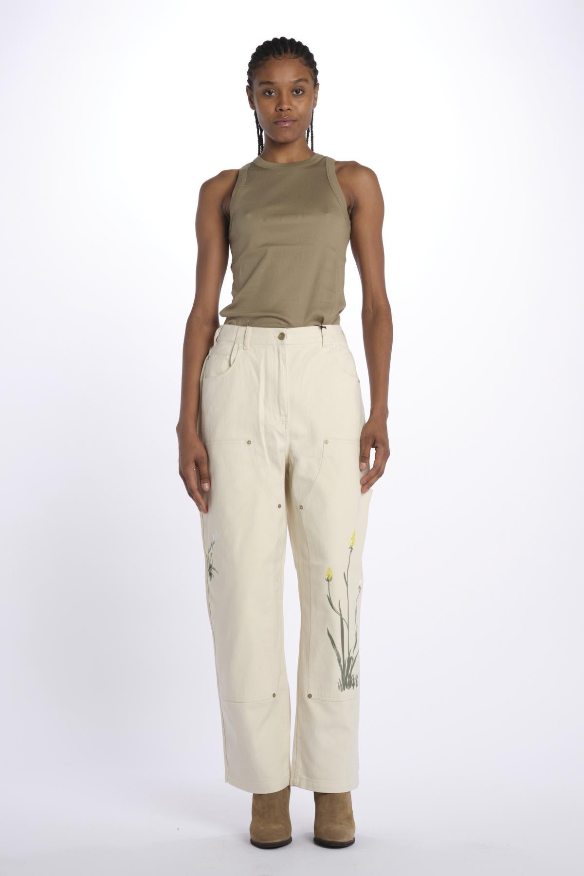 RAINE high-waisted wide leg trousers with embroidery by sctoch&soda. The model is 174 cm tall and wears a size 26. Composition: 100% cotton.