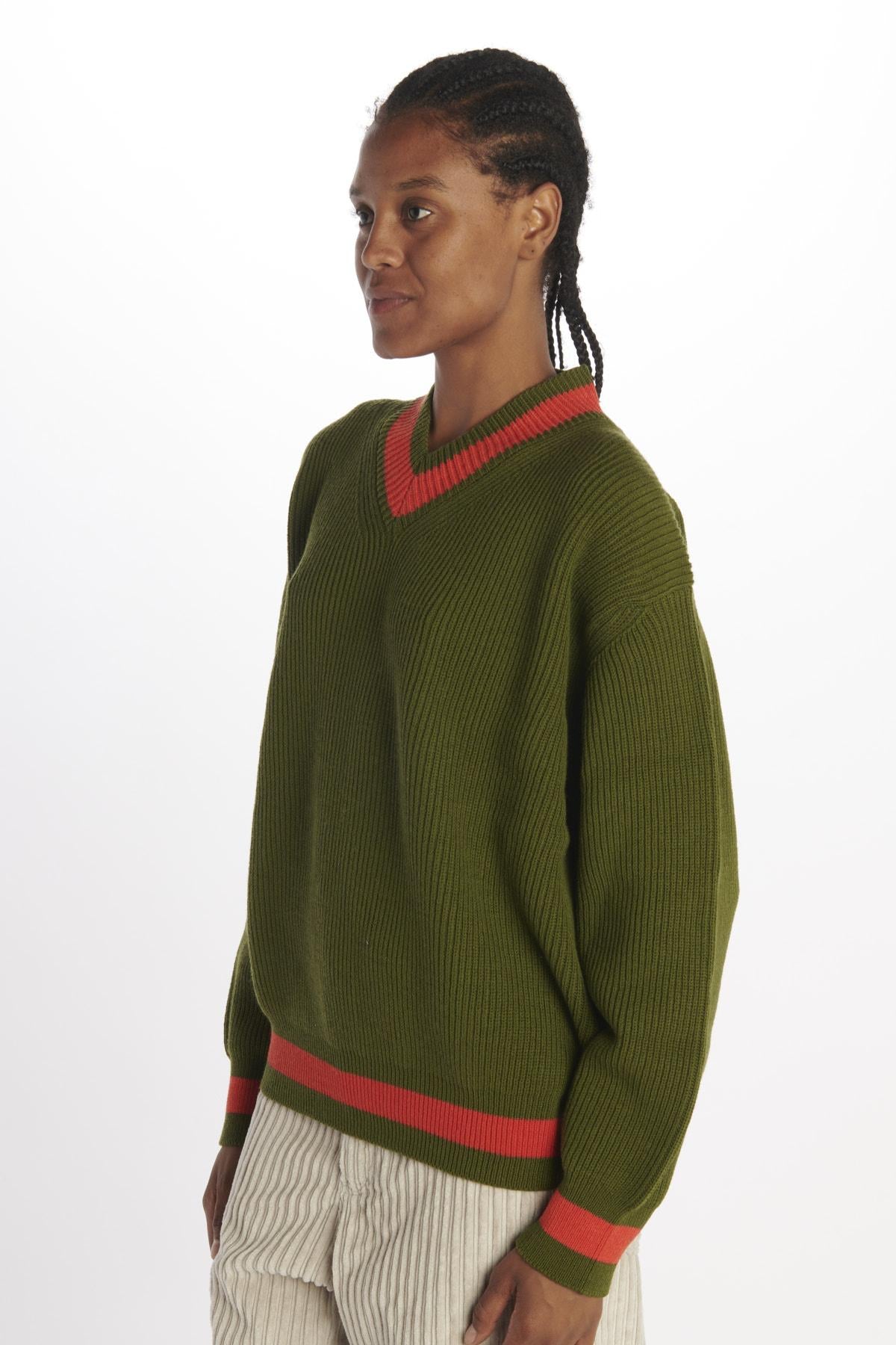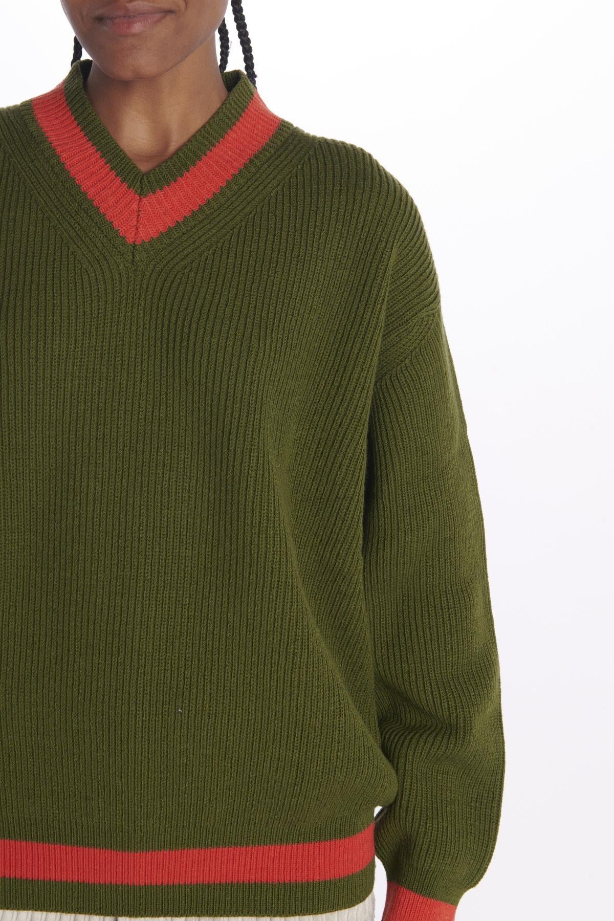 Sweater by Sofie D'Hoore V-neck with contrasting edges. The model is 174 cm tall and wears size S. Composition: 100% Wool.