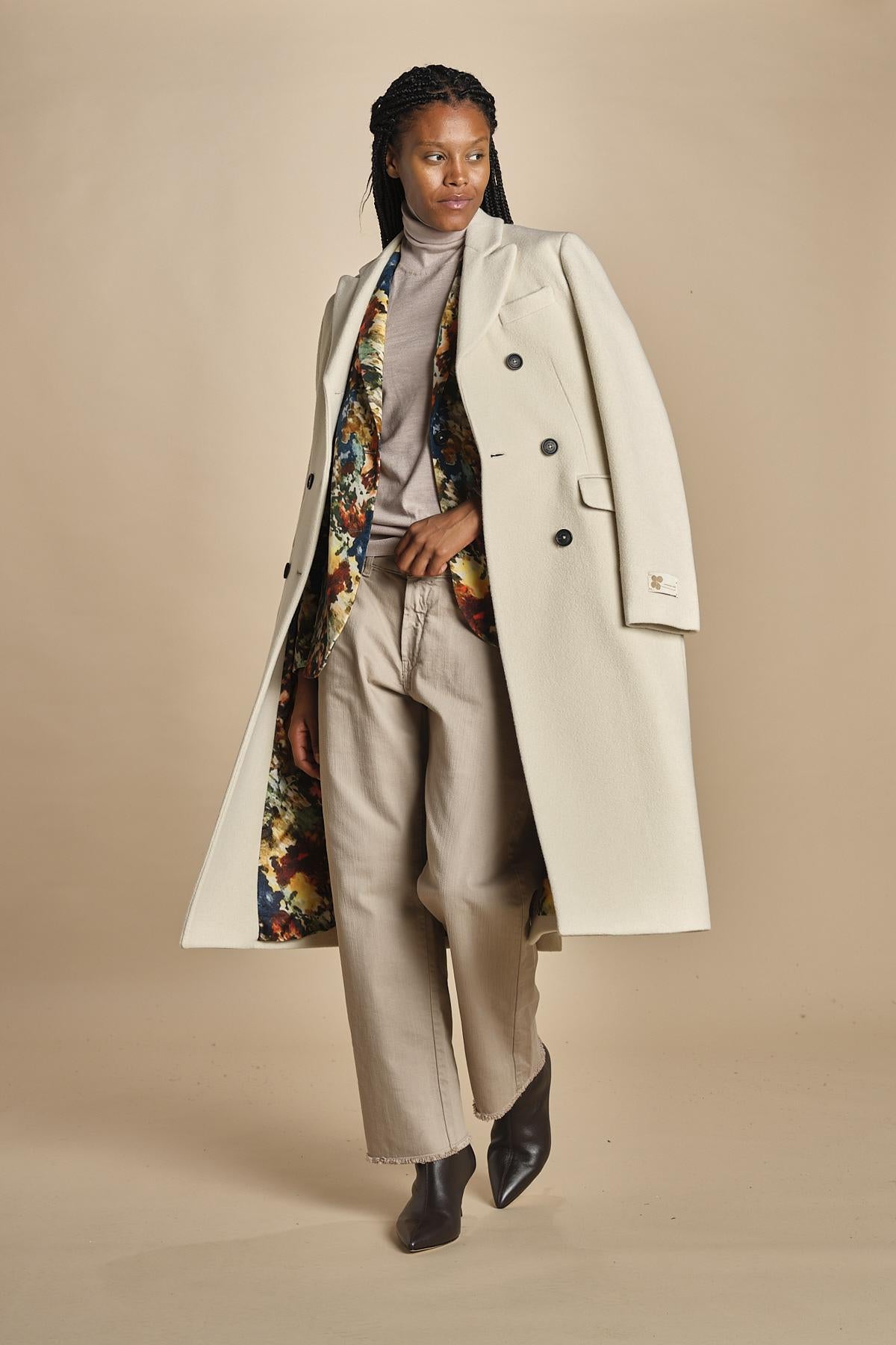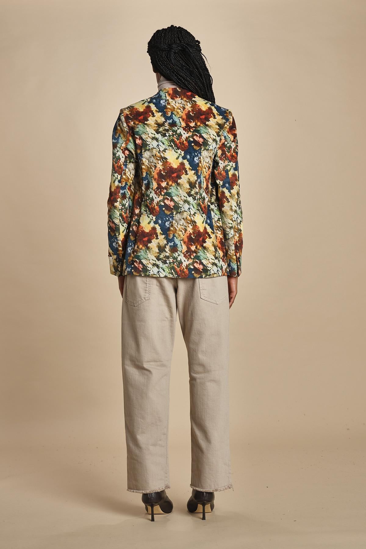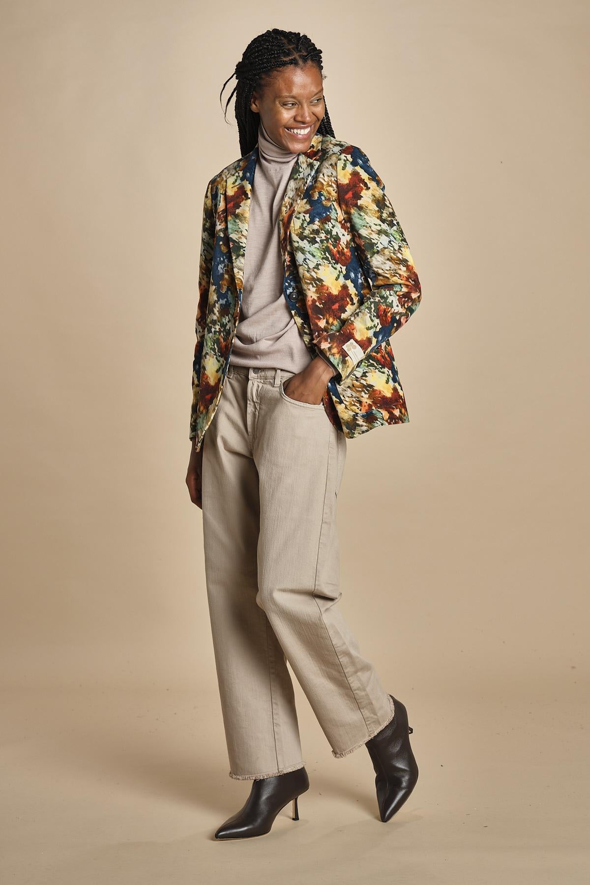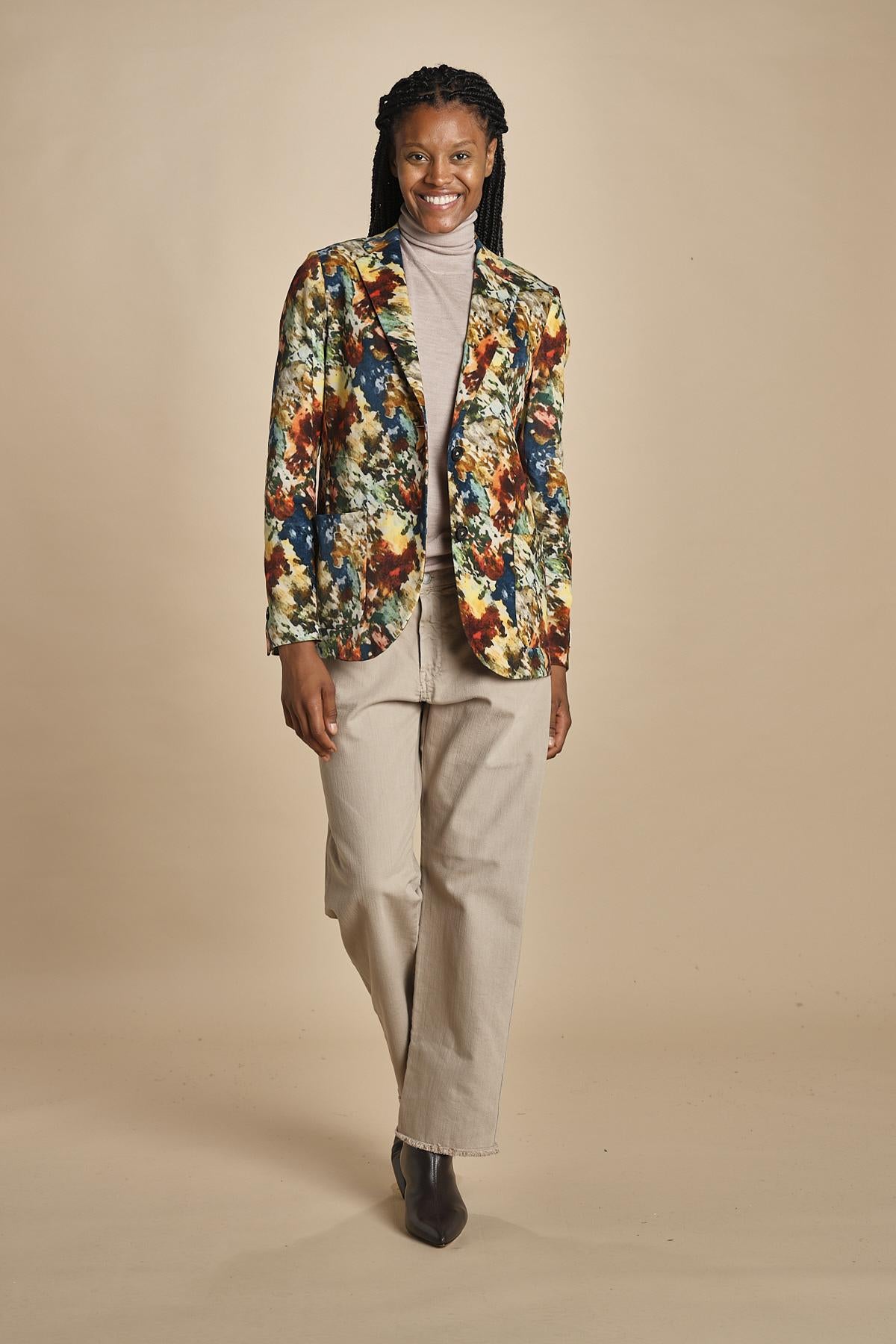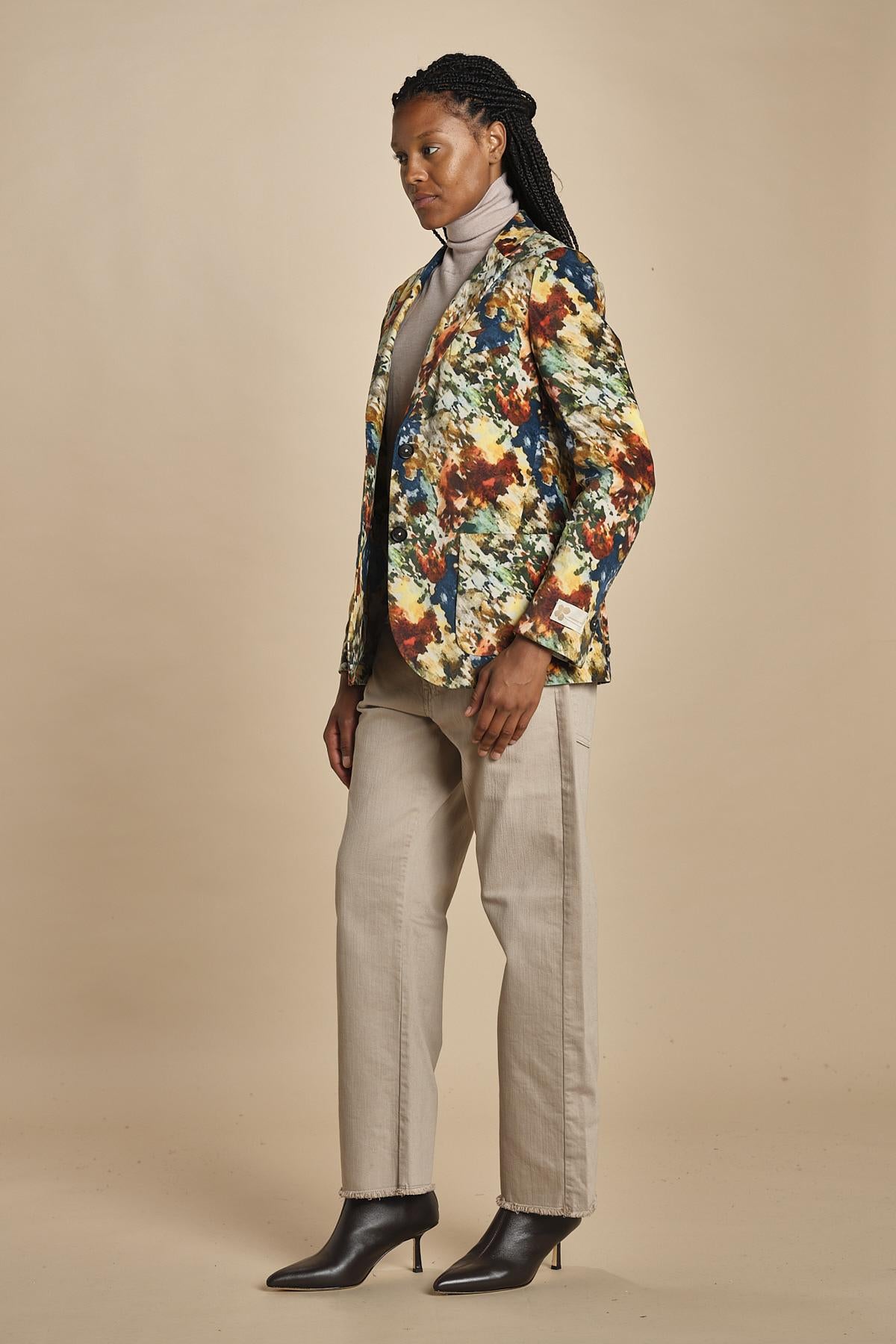 giacca velluto stampato by massimo alba. La modella è alta 174 cm e indossa una taglia S. Composizione: 98%cotone, 2%elastan.