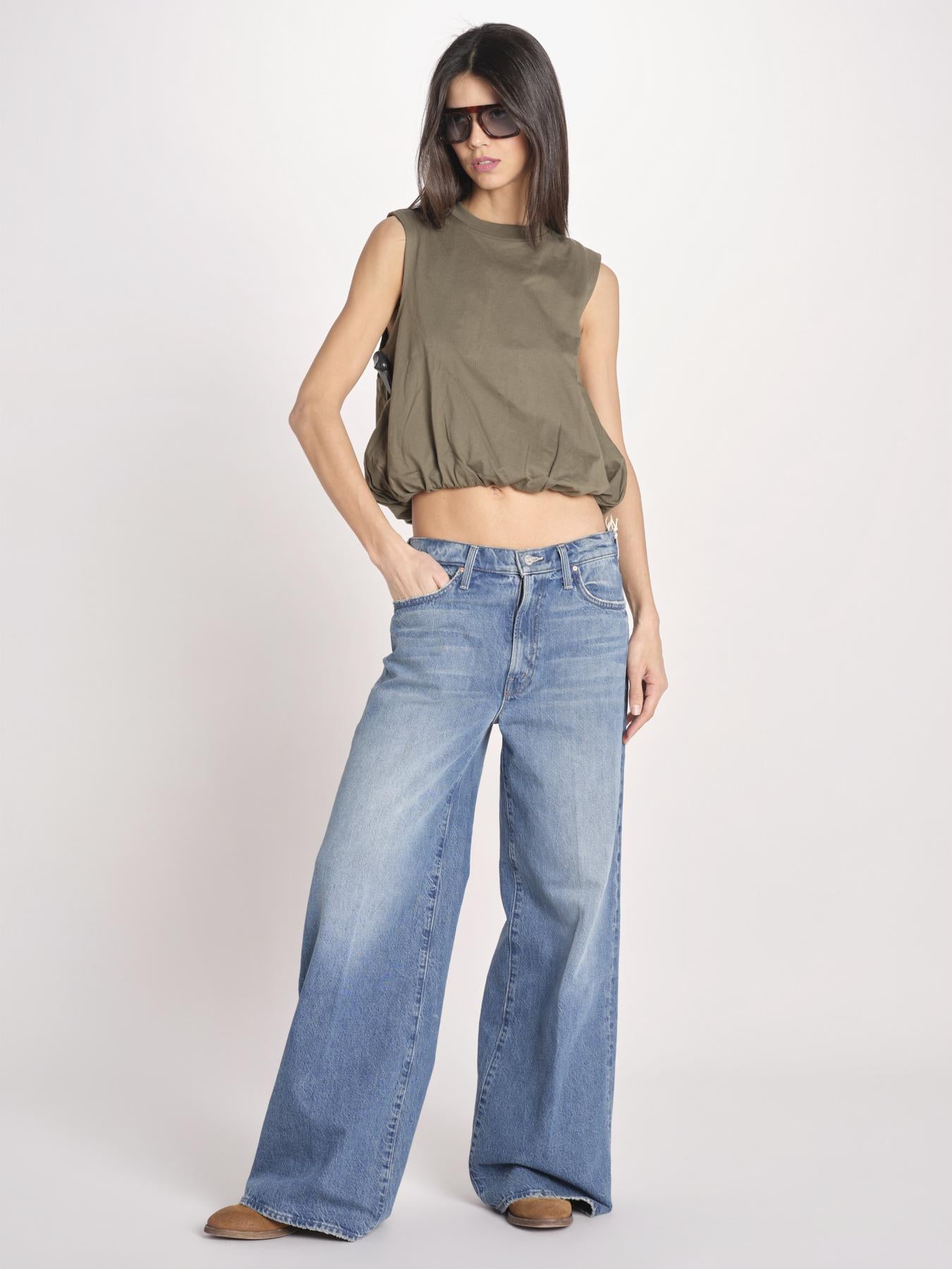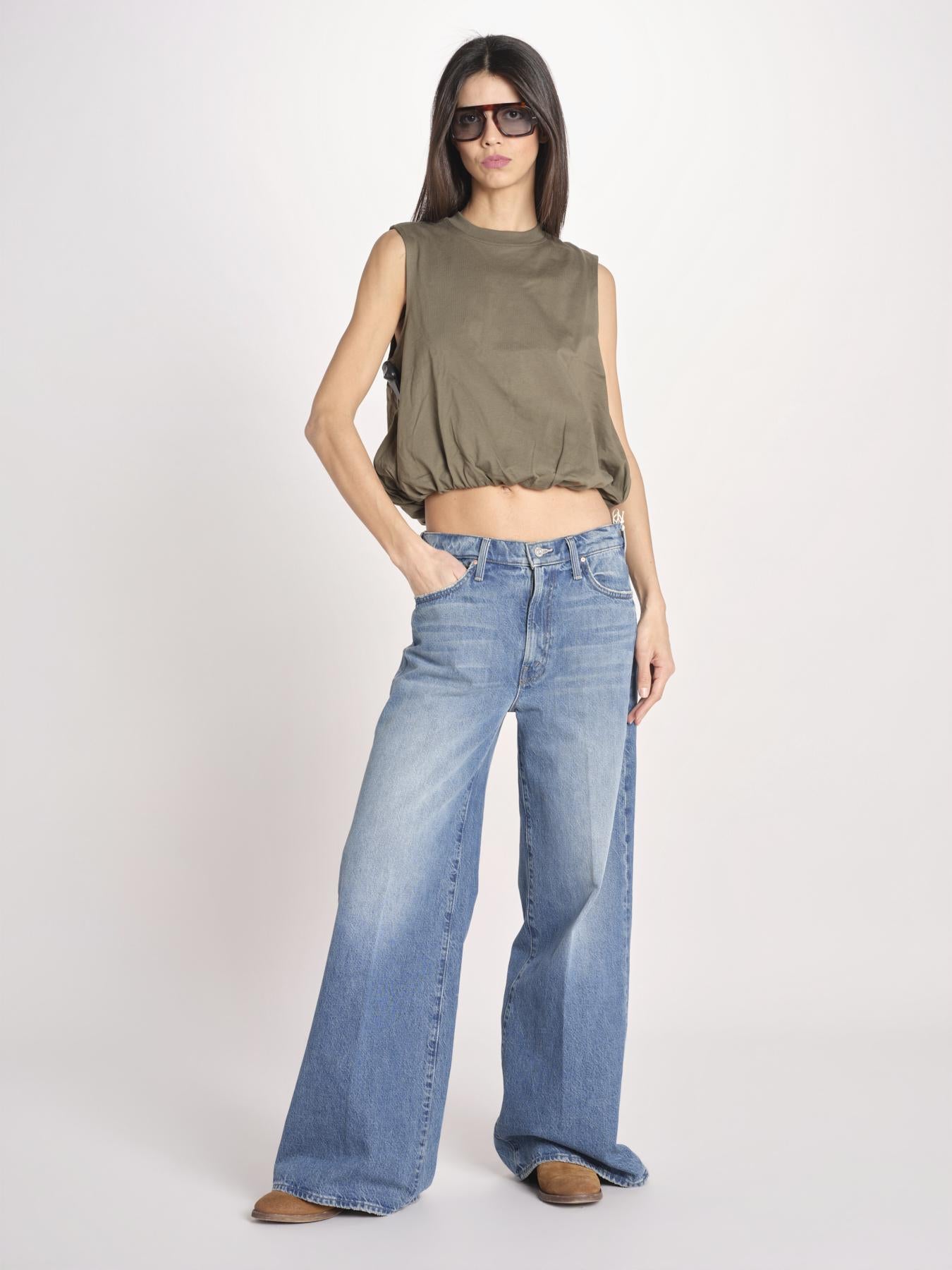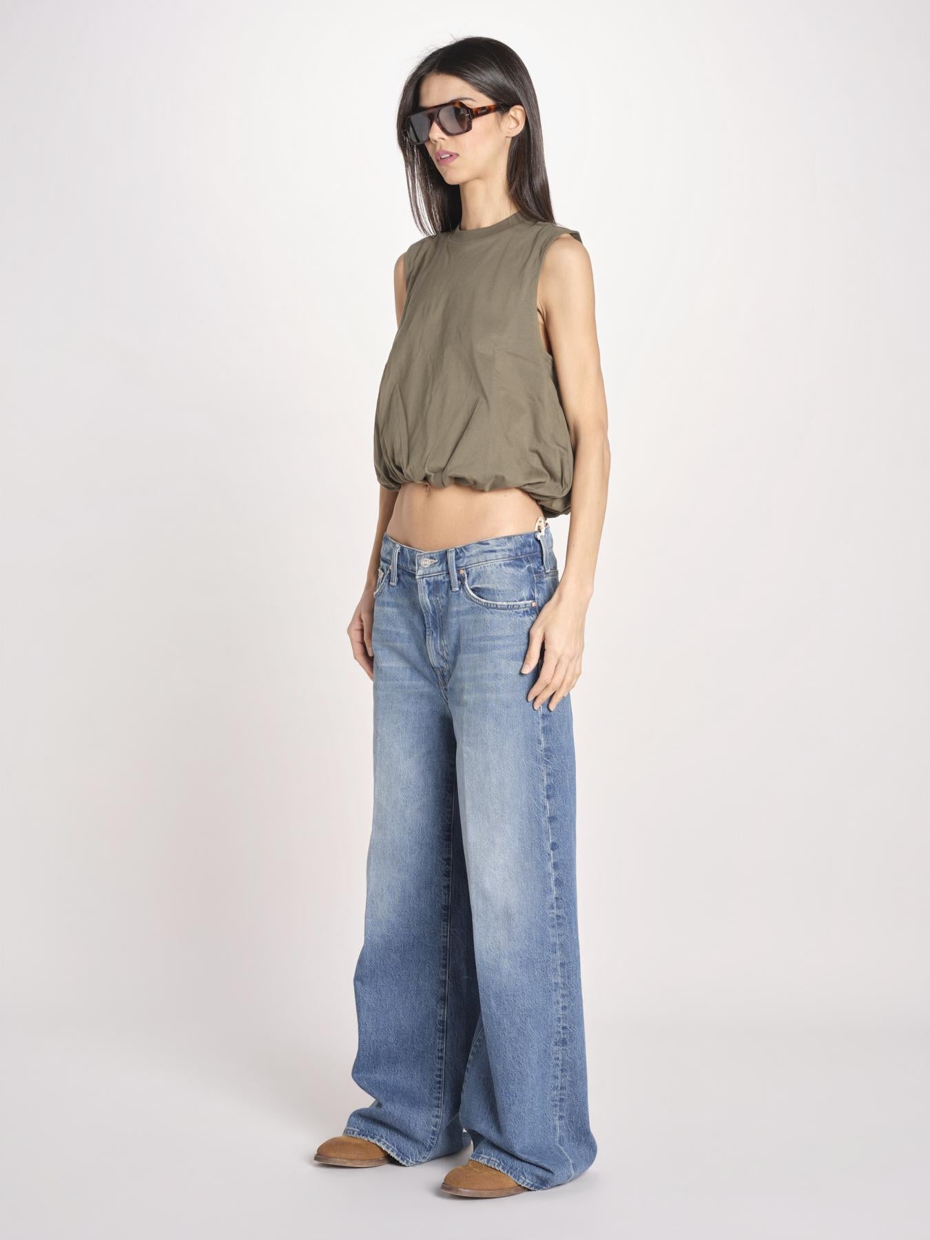 T-shirt smanicato con elastico fondo. La modella è alta 180cm e indossa una taglia S. Composizione: 100% cotone.