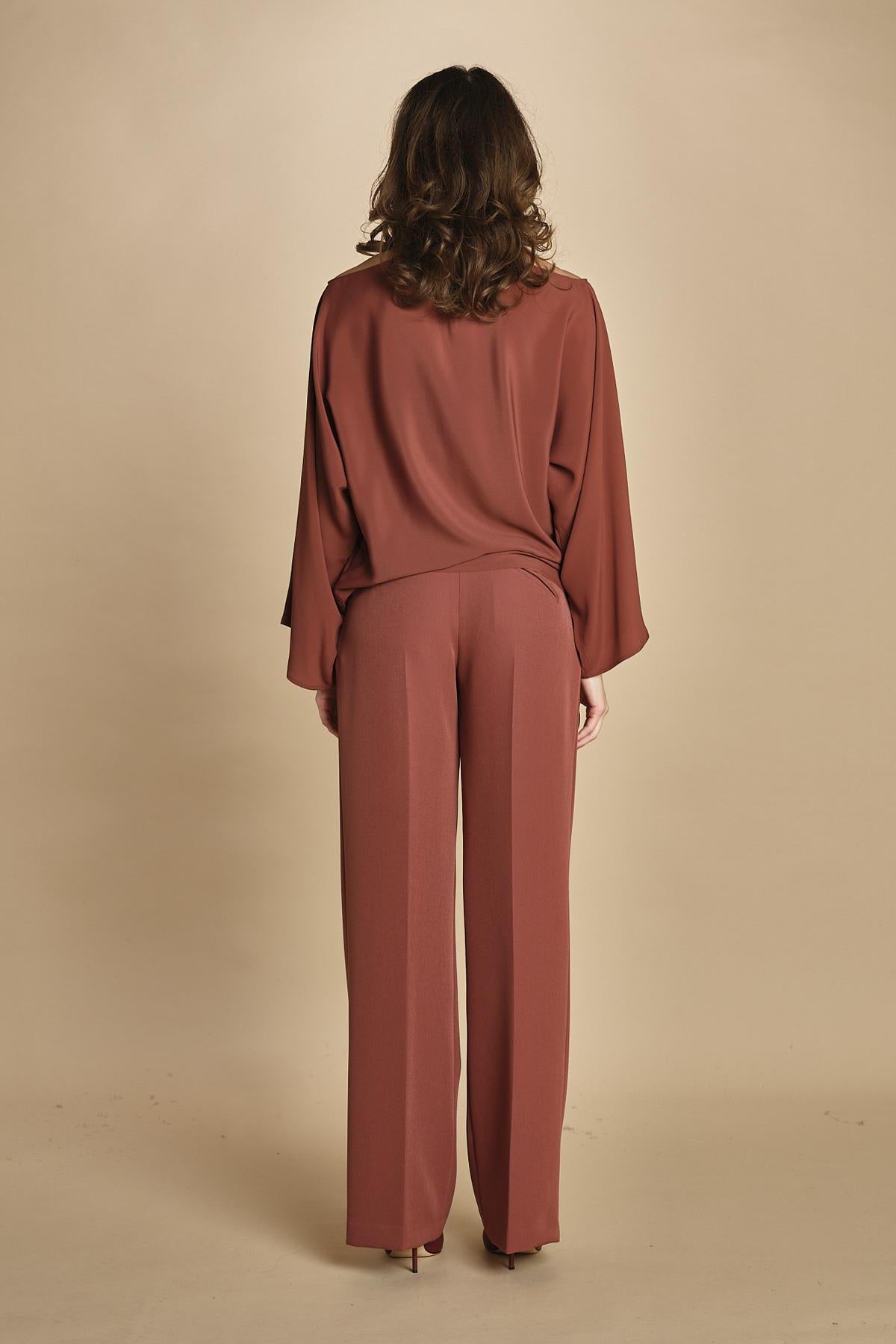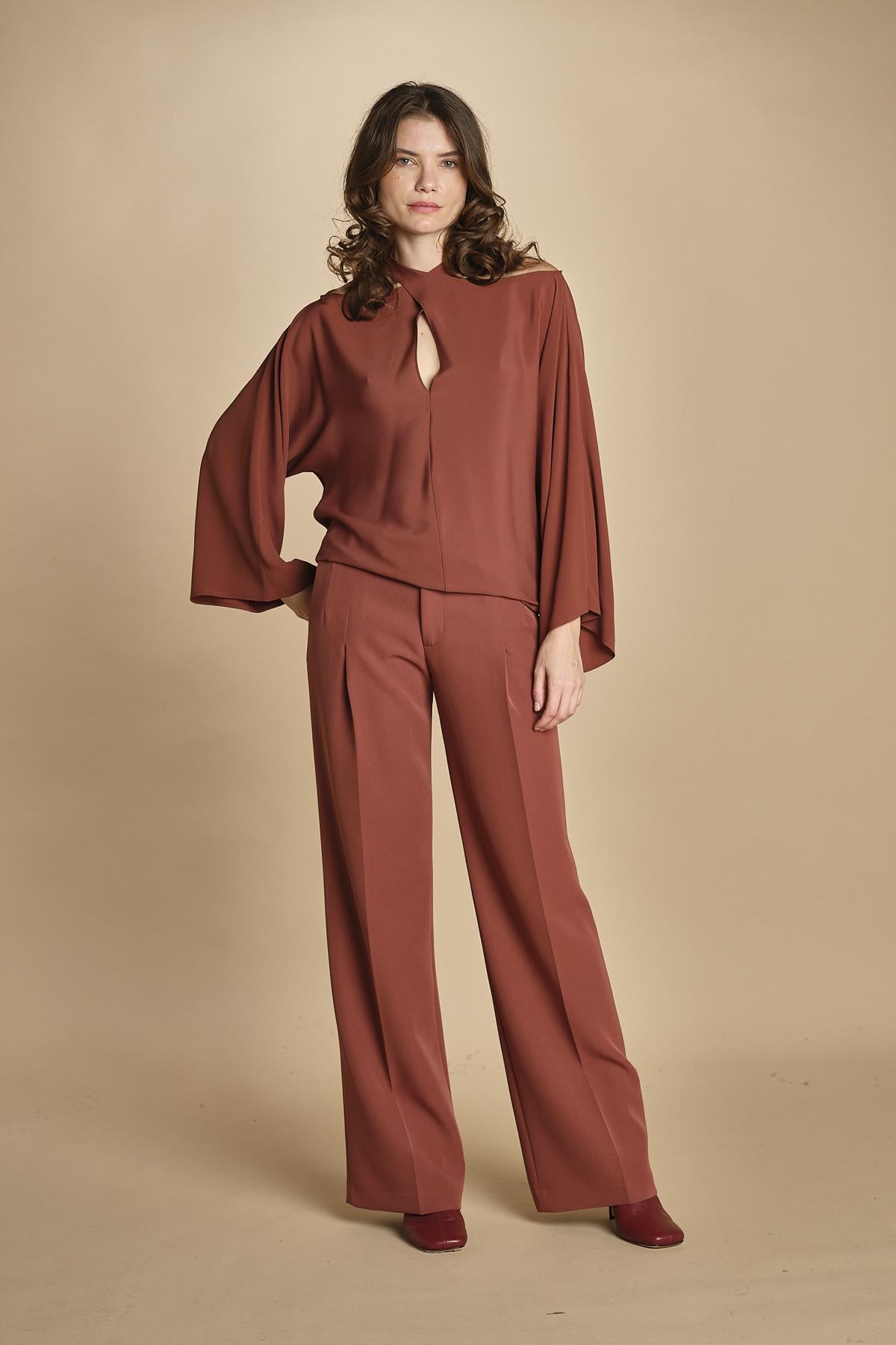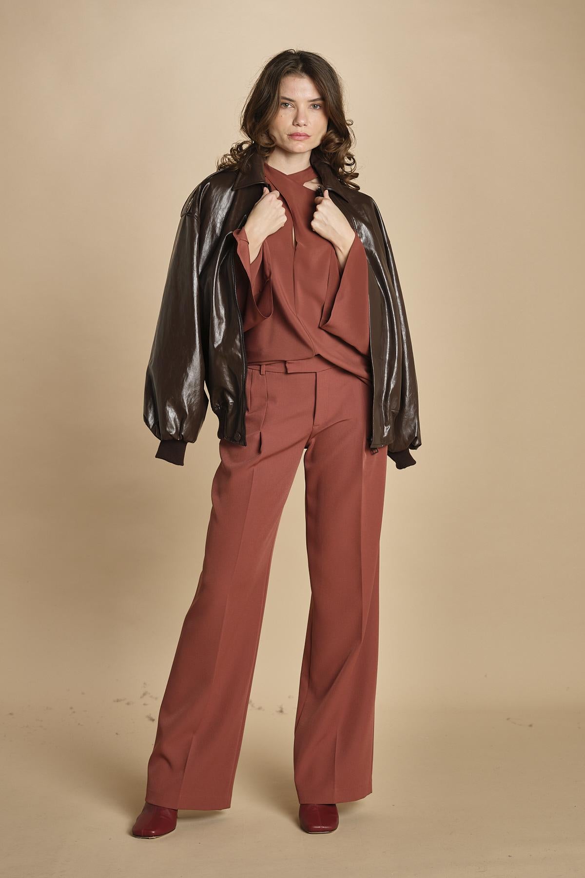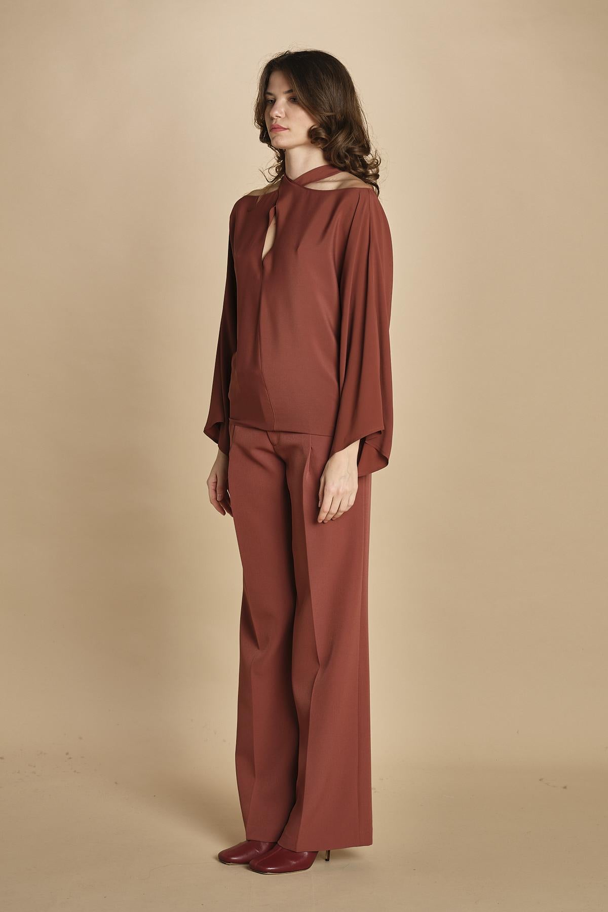 top in seta incrociato. La modella è alta 174 cm e indossa una taglia 38. 69% acetato 31% seta