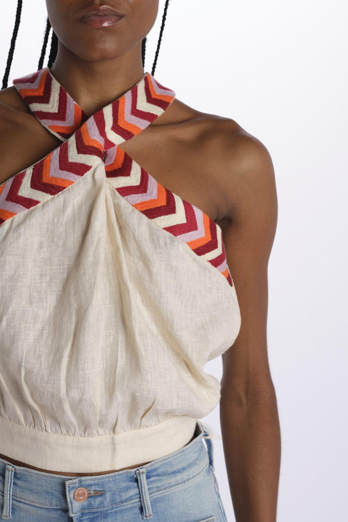 Top by Chufy ricamo. La modella è alta 174 cm e indossa una taglia S. Composizione: 100% Lino.