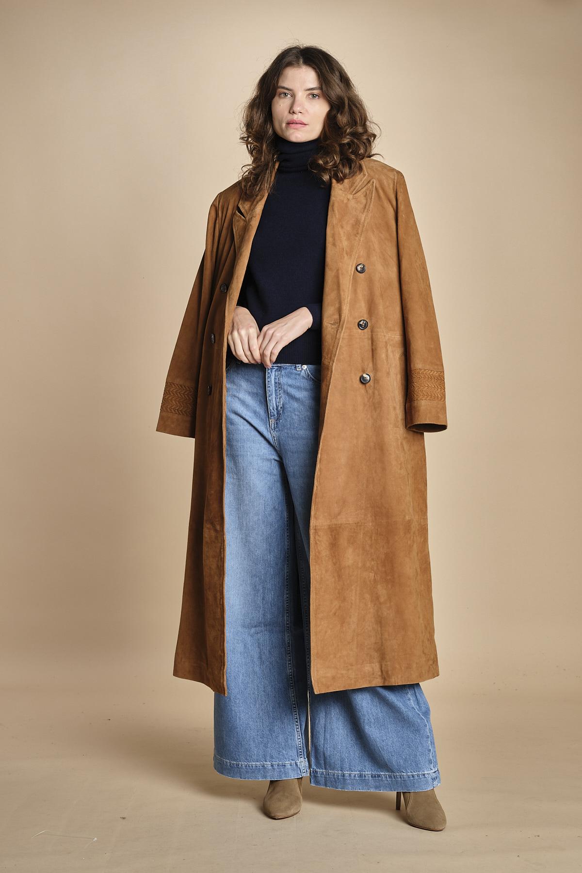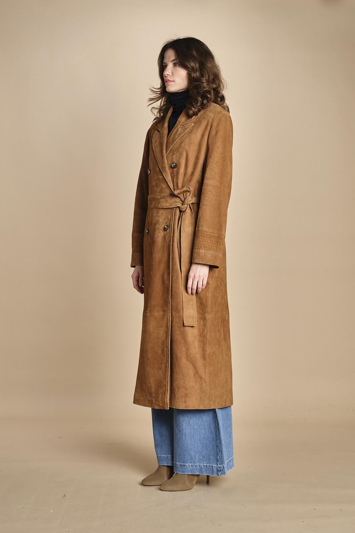 trench in camoscio. La modella è alta 176 cm e indossa una taglia 2. 100% pelle