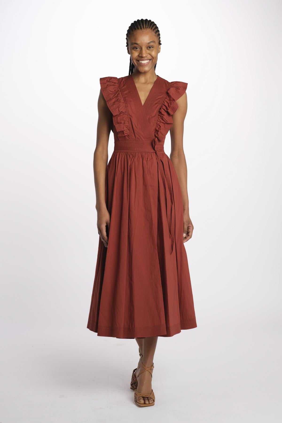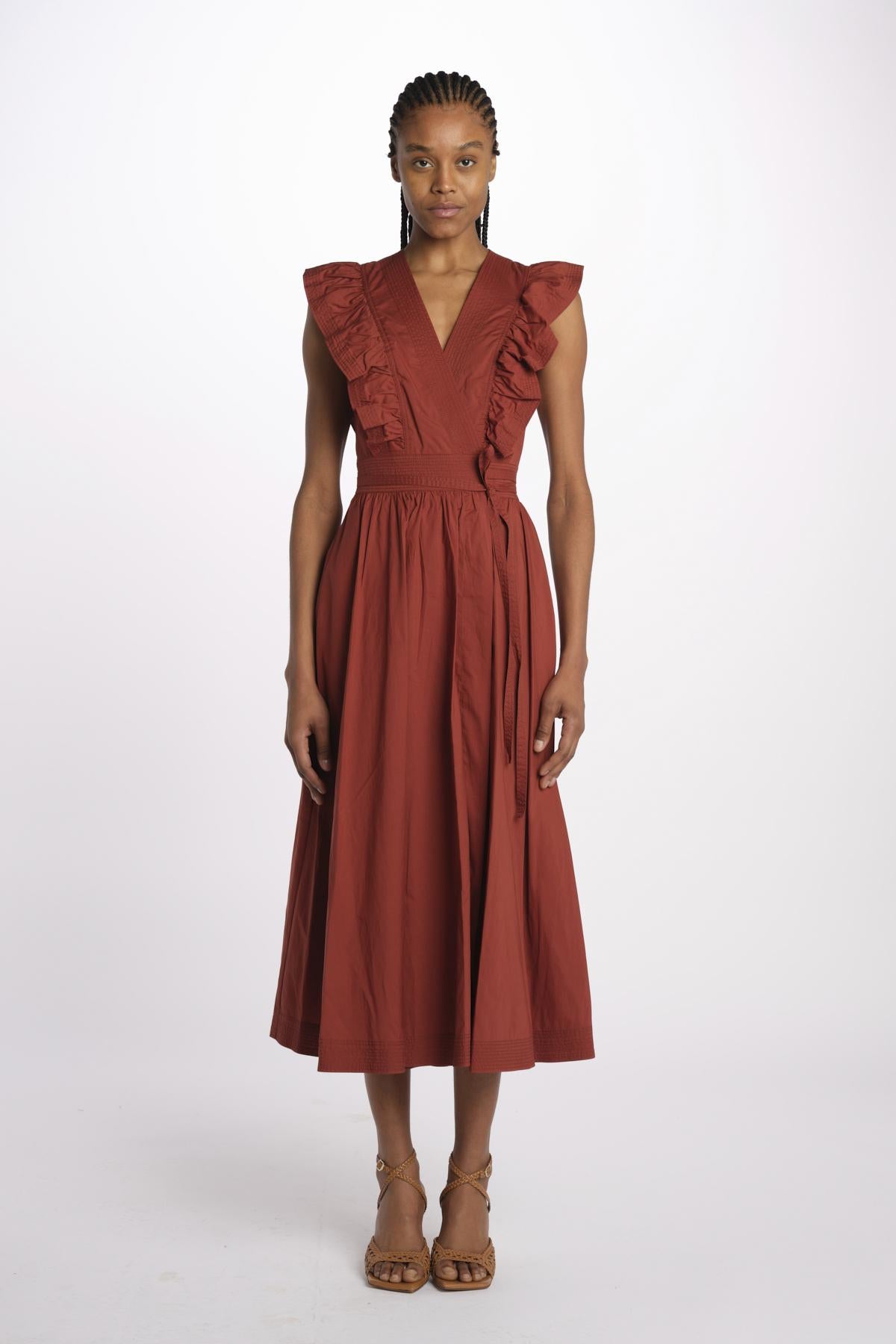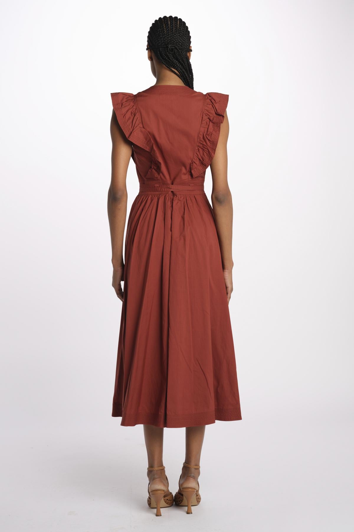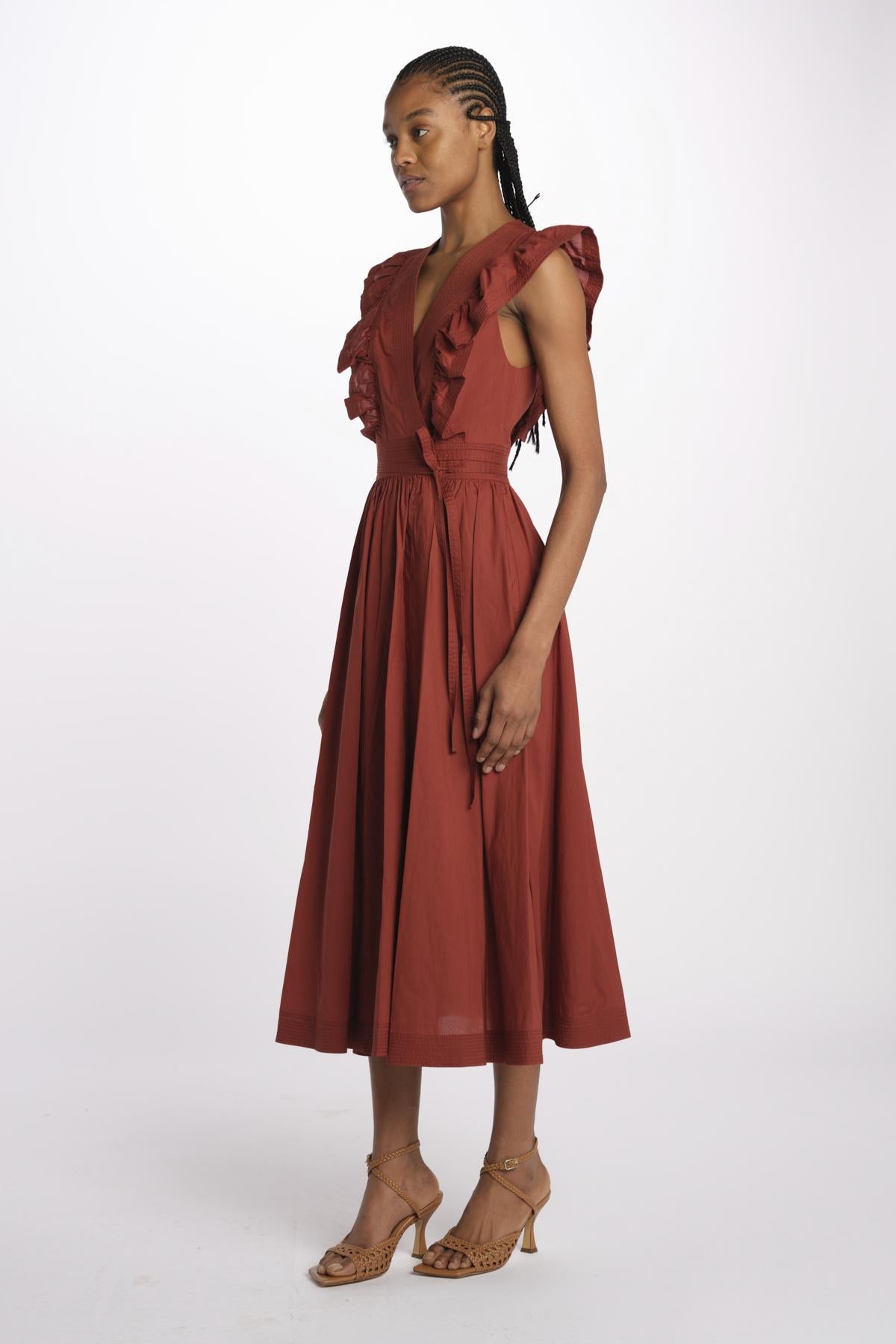 ERMIONE embroidered dress with ruffles by vanessa bruno. The model is 174 cm tall and wears a size 34. Composition: 55% lyocell, 45% cotton.
