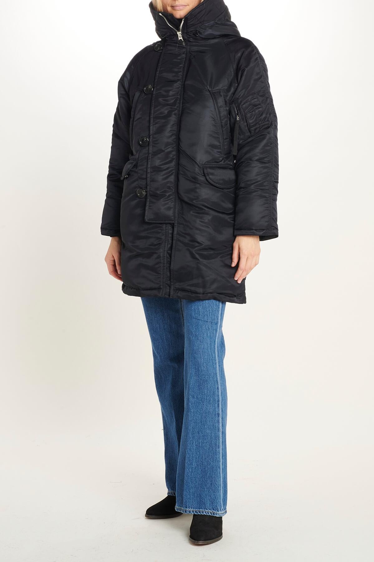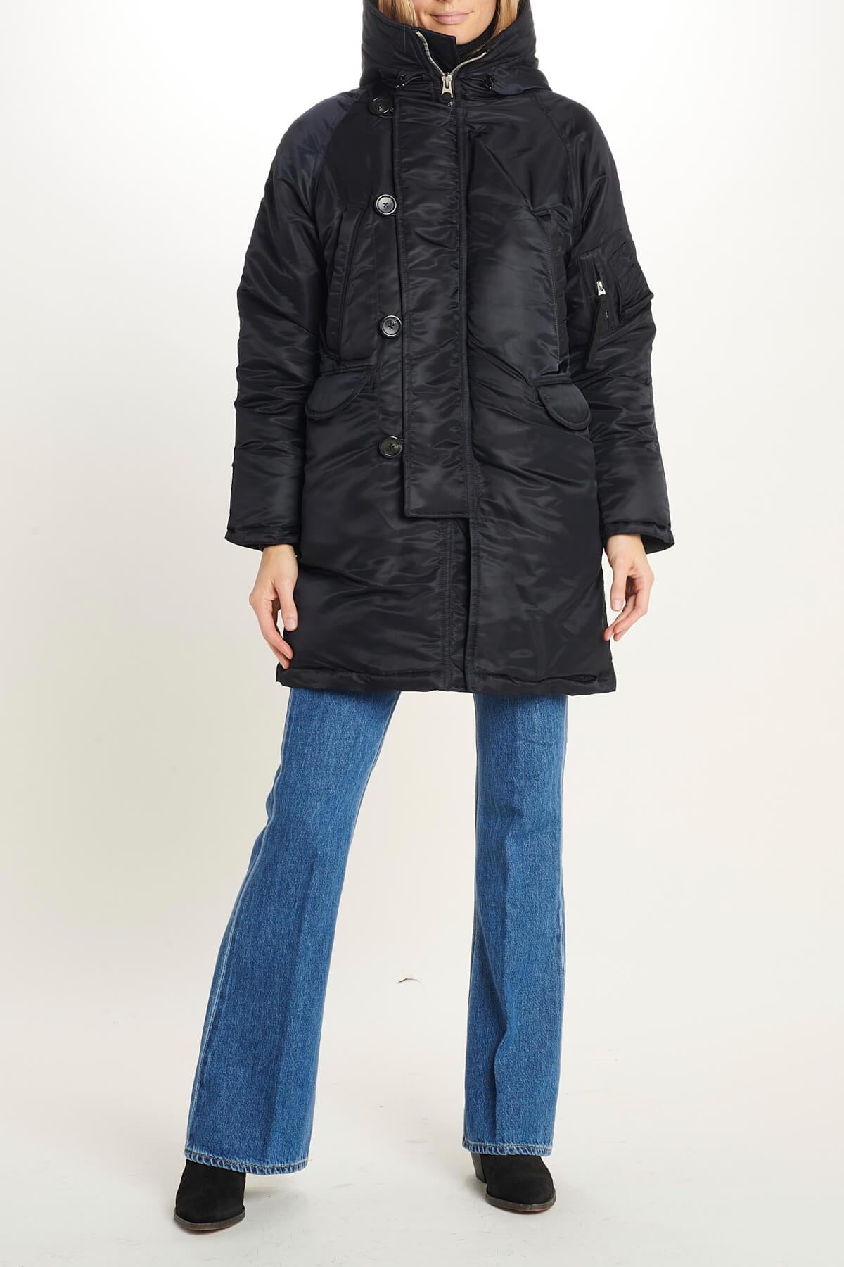 Parka by Vis a Vis with asymmetric closure, maxi buttons, hood with internal teddy, internal drawstring waist. The model is 1.77m tall and wears size 1. Composition: Body: 100% Nylon, Filler: 100% Polyester, Lining: 100% Polyester, Hood Lining: 80% Acrylic, 20% Polyester