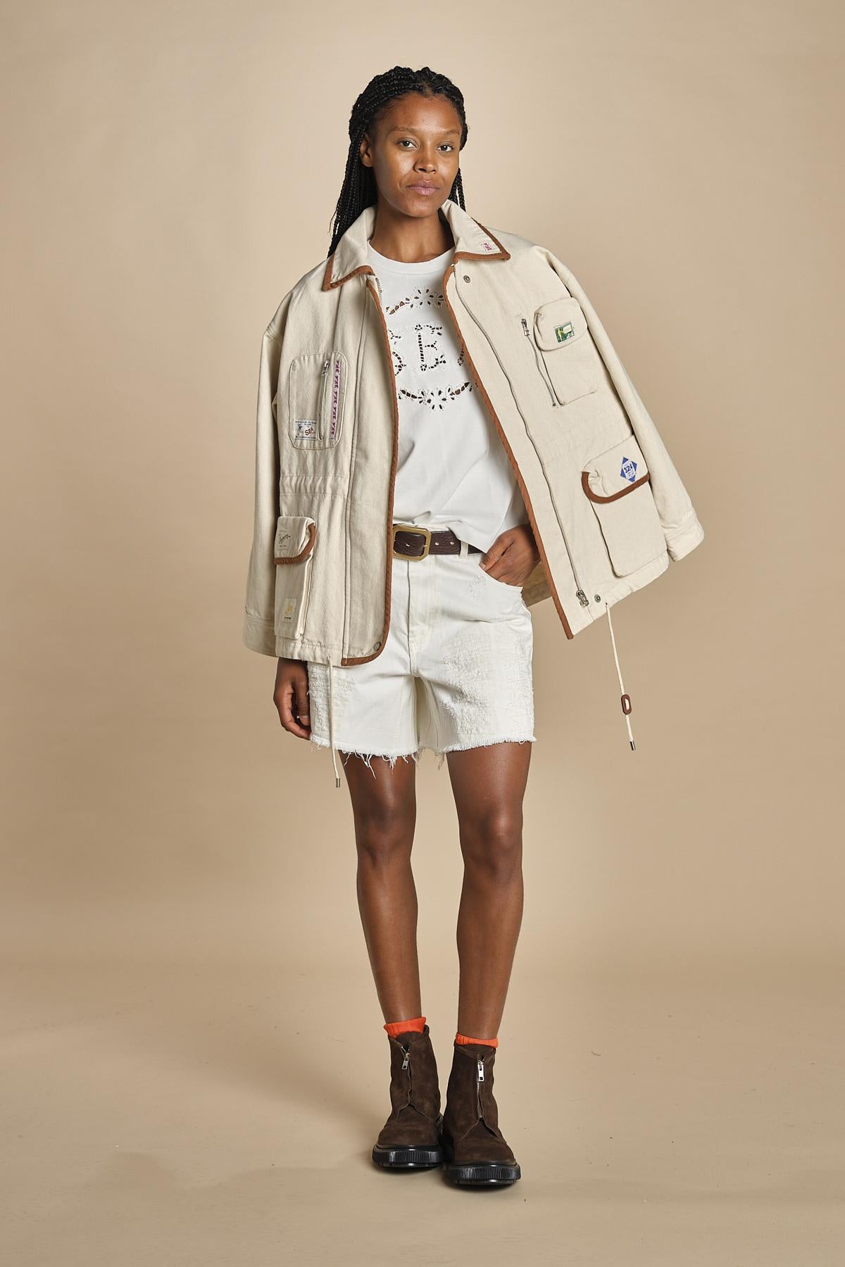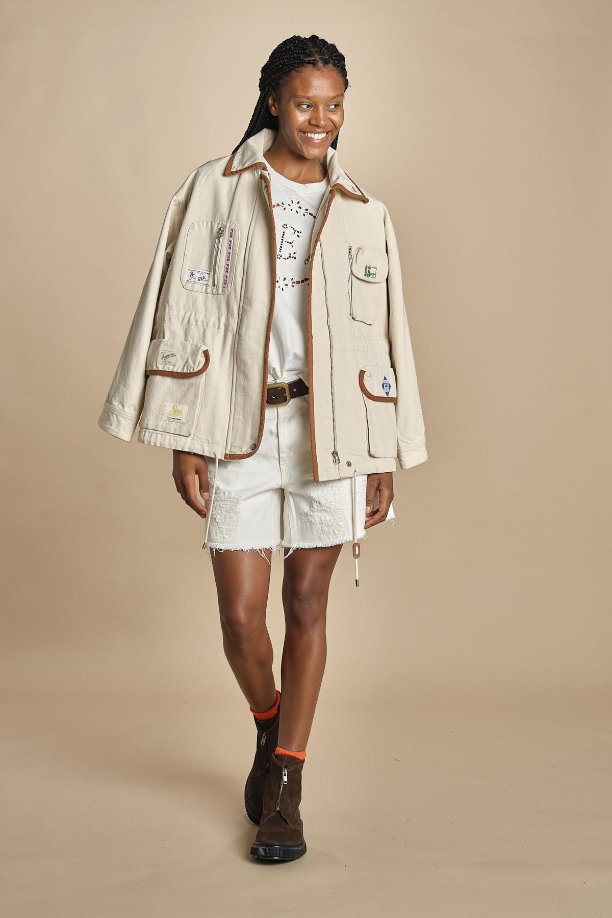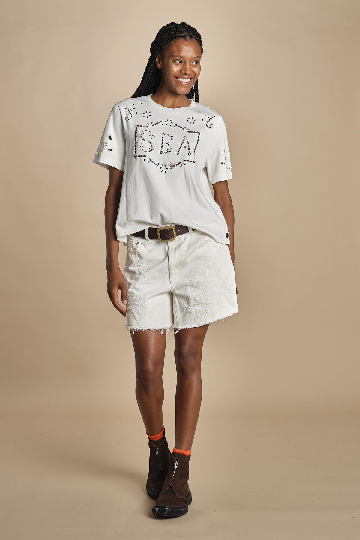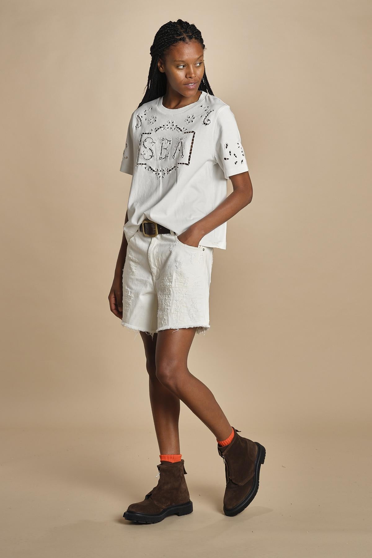 t-shirt con ricamo. La modella è alta 174cm e indossa una taglia s.