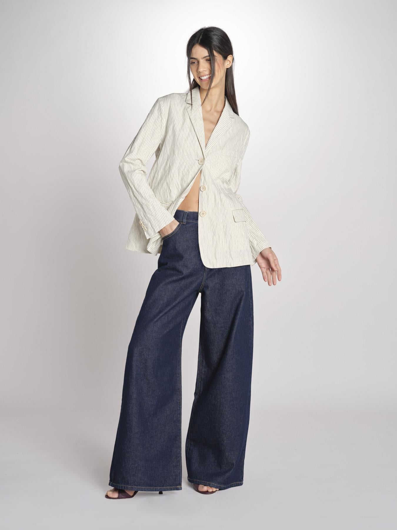 Blazer 3 bottoni gessato. La modella è alta 180cm e indossa una taglia 40. Composizione: 91% cotone, 9%metallo.