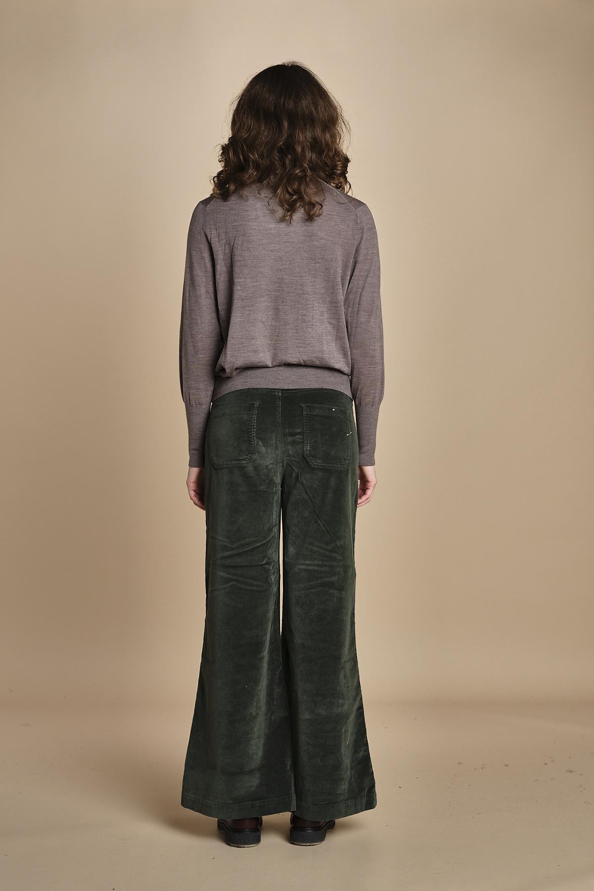 CARLA pantalone cropped a zampa in velluto 2000 righeLa modella è alta 176 cm e indossa una taglia 27. 73% COTONE 25%TENCEL 2% ELASTAN