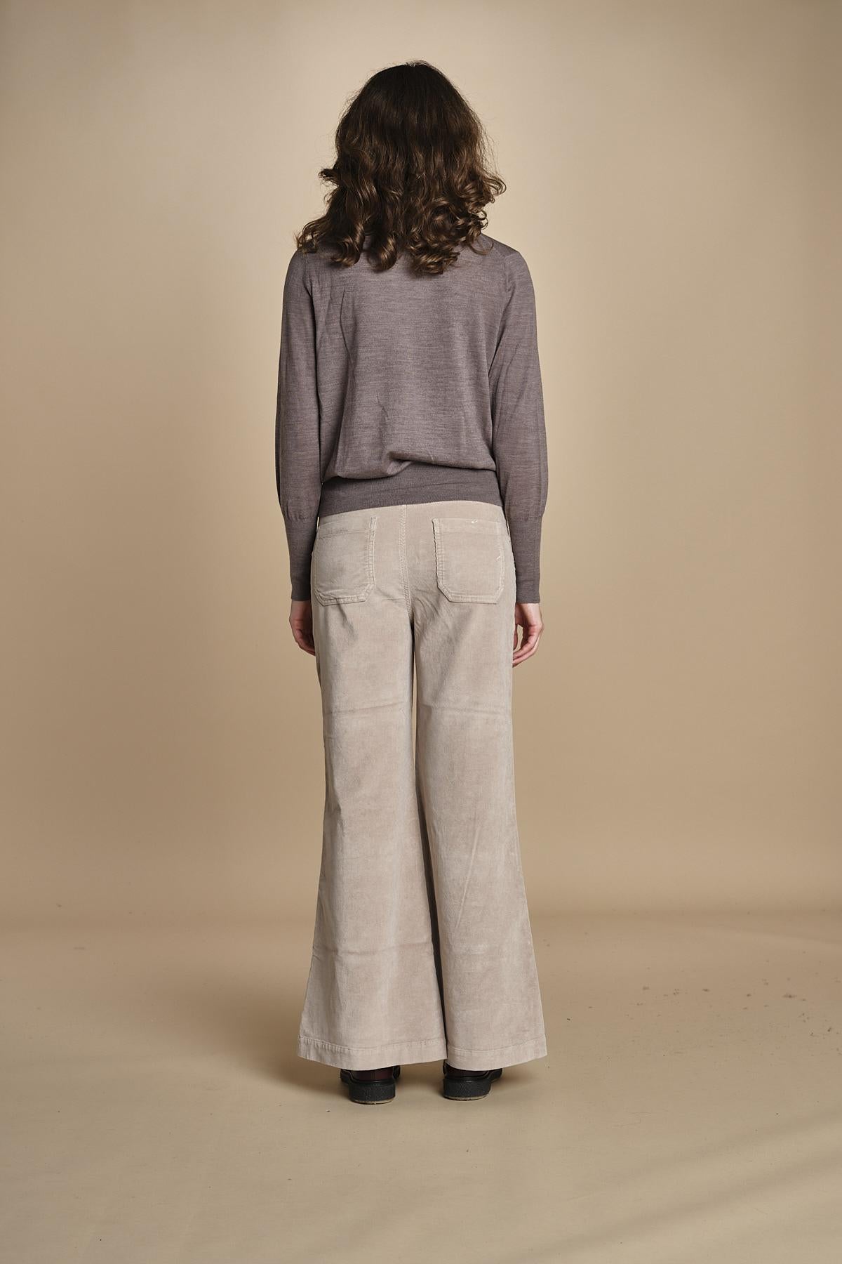 CARLA pantalone cropped a zampa in velluto 2000 righeLa modella è alta 176 cm e indossa una taglia 27. 73% COTONE 25%TENCEL 2% ELASTAN