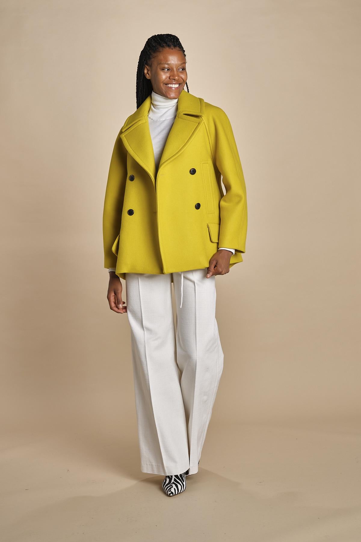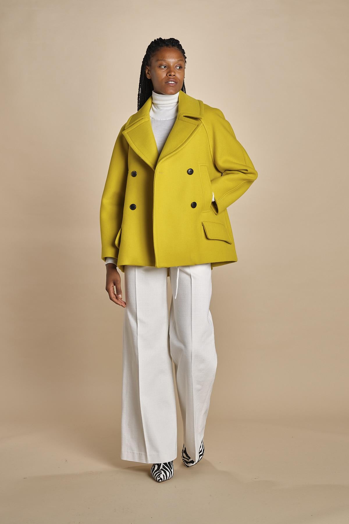 peacot doppiopetto by martin grant. La modella è alta 174 cm e indossa una taglia S.