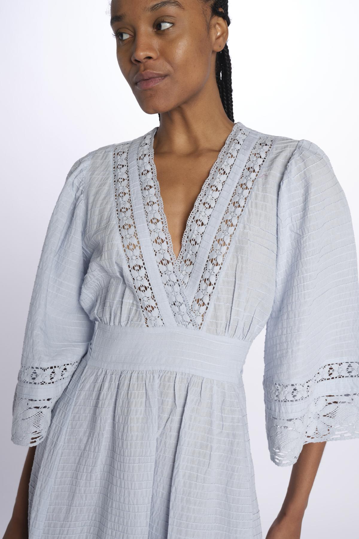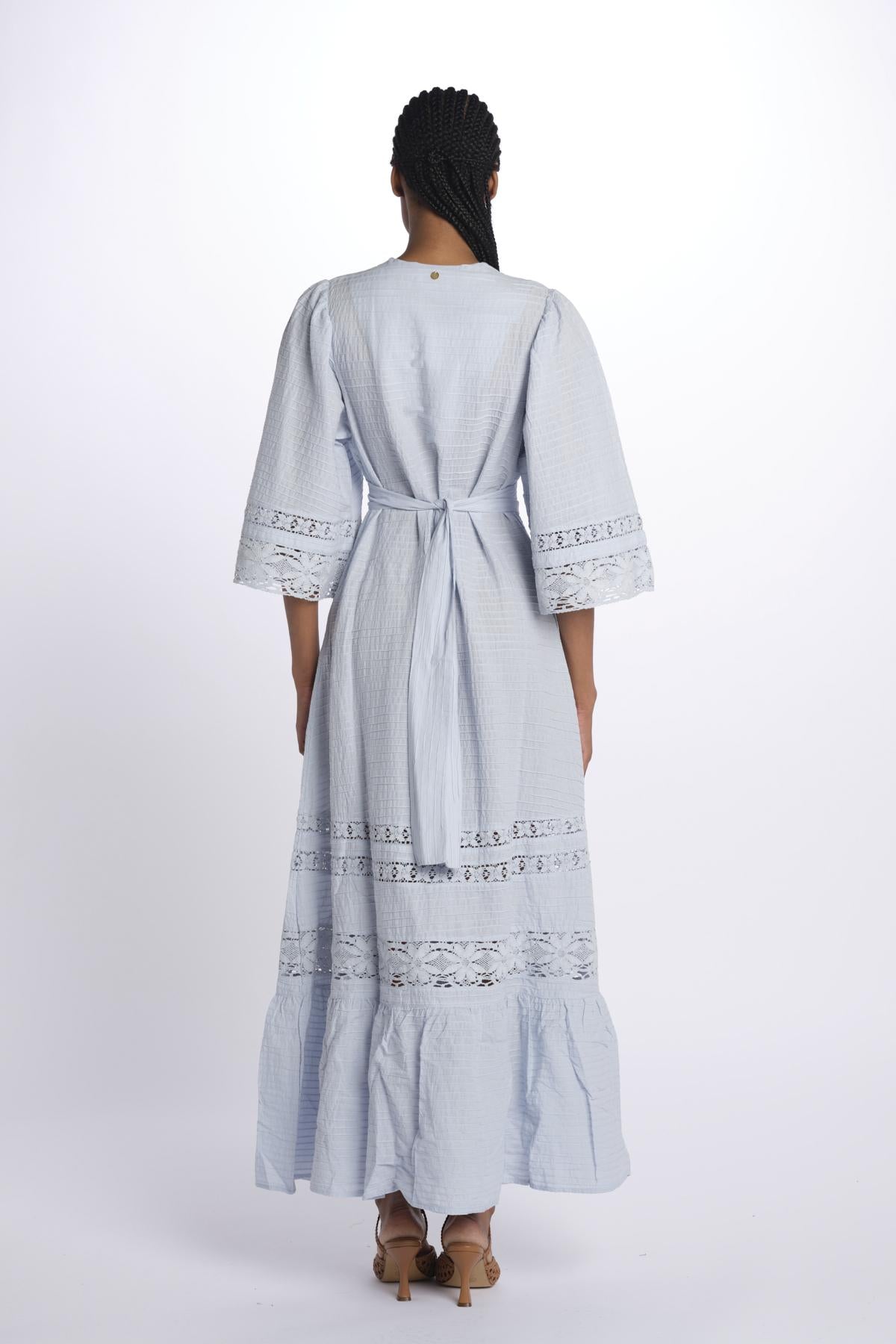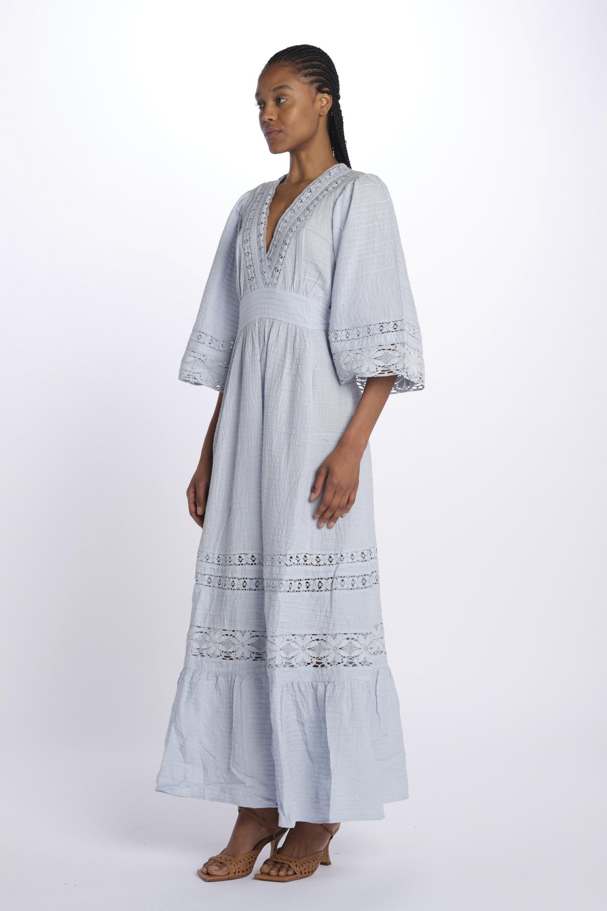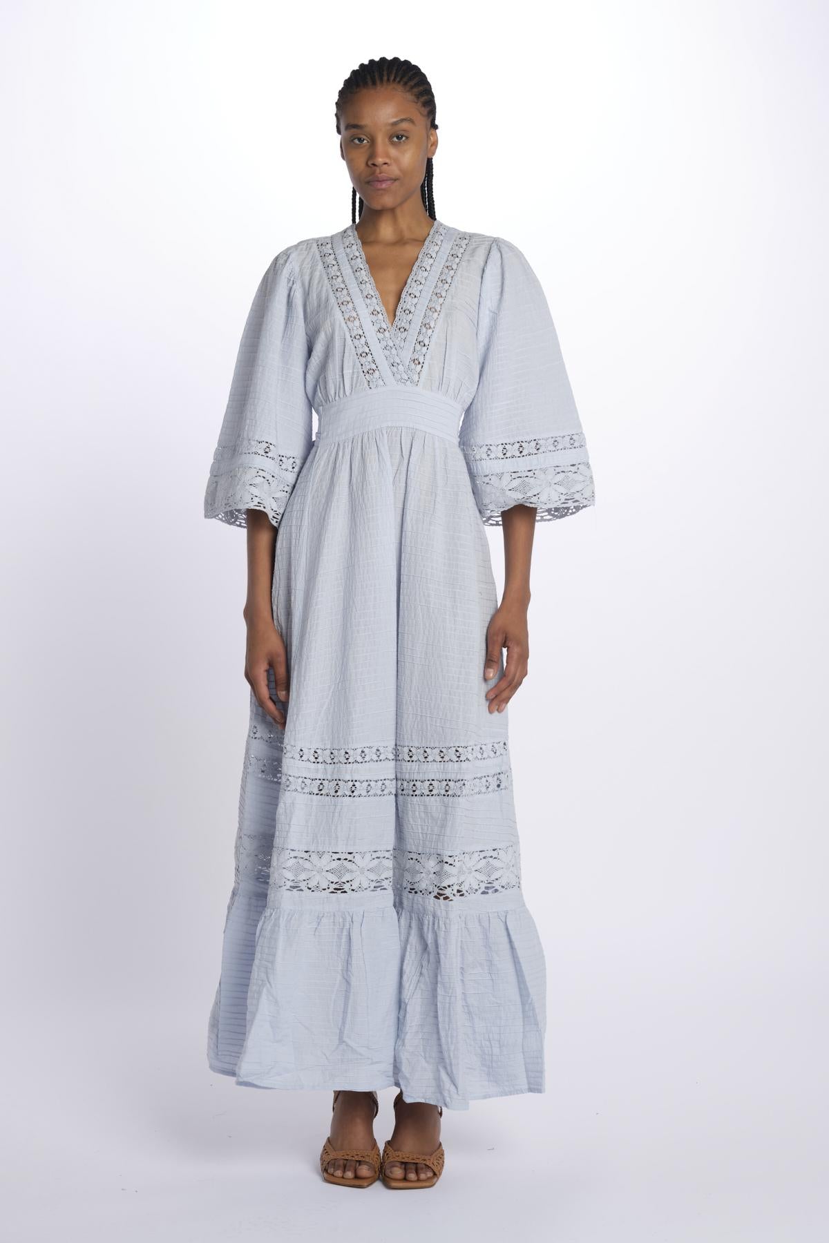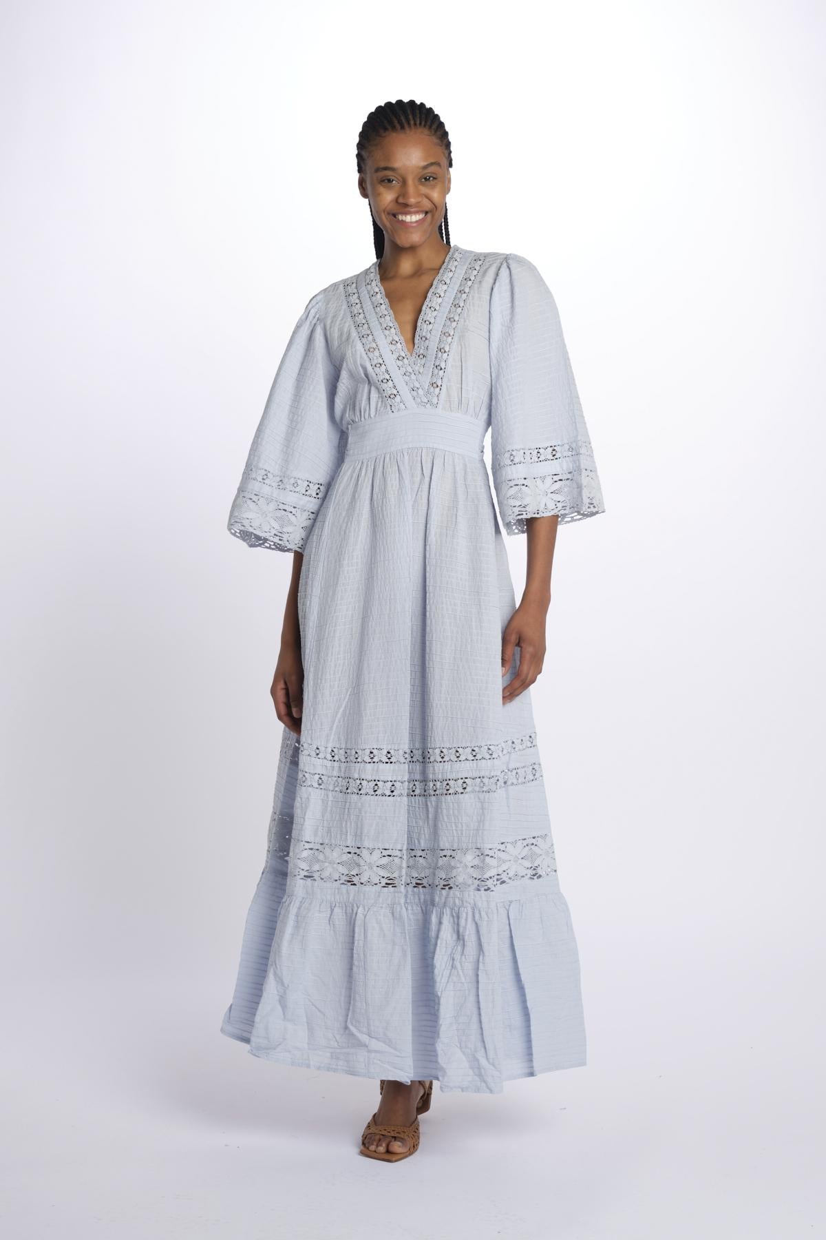 Abito LENA lungo ricamo piuzzo + righe by antik batik. La modella è alta 174 cm e indossa una XS. Composizione: 100% cotone.