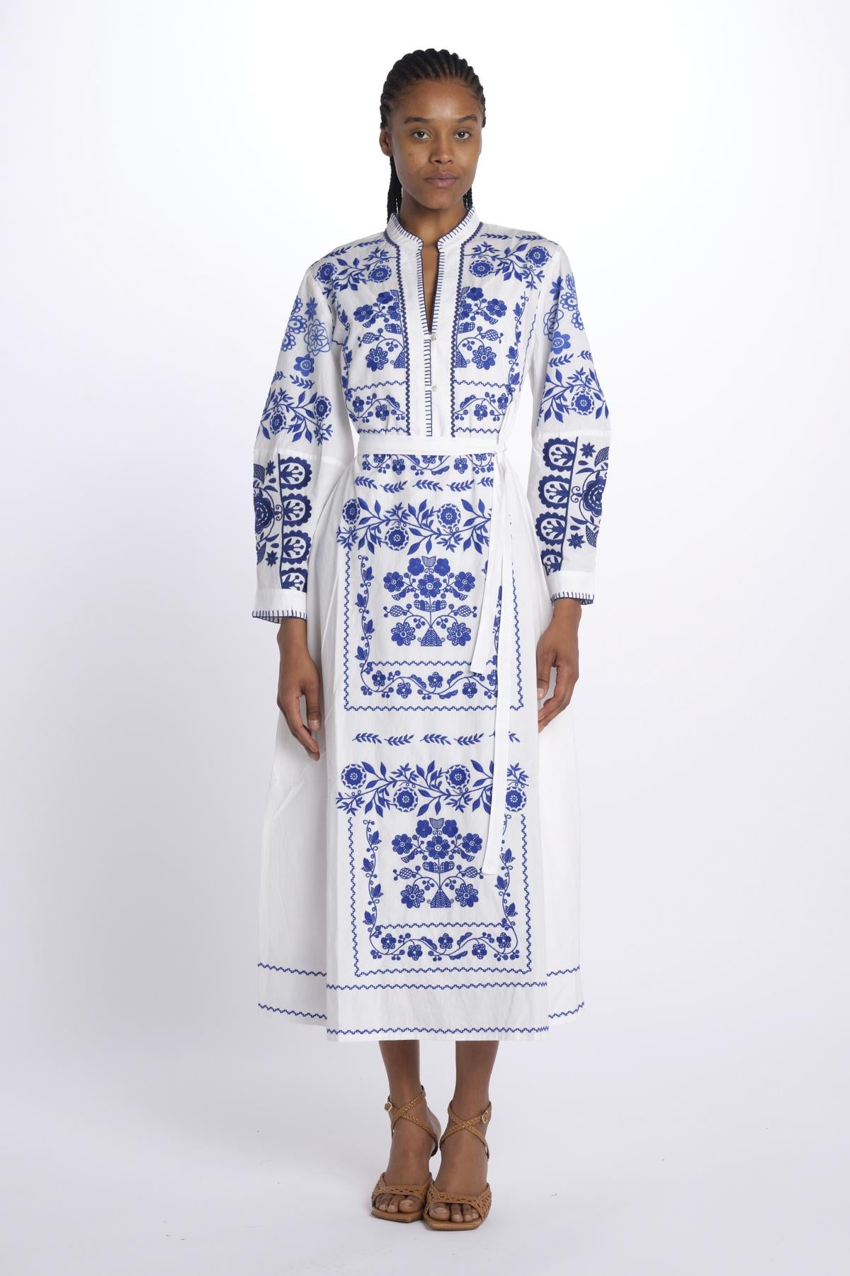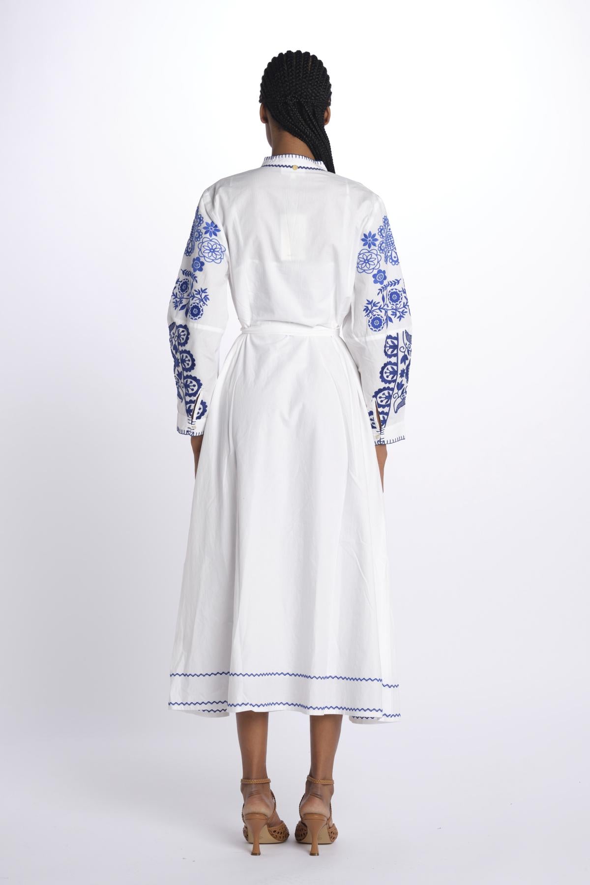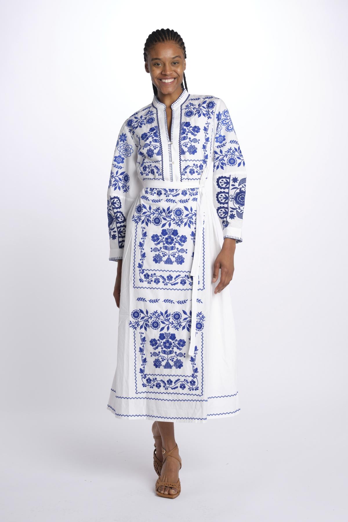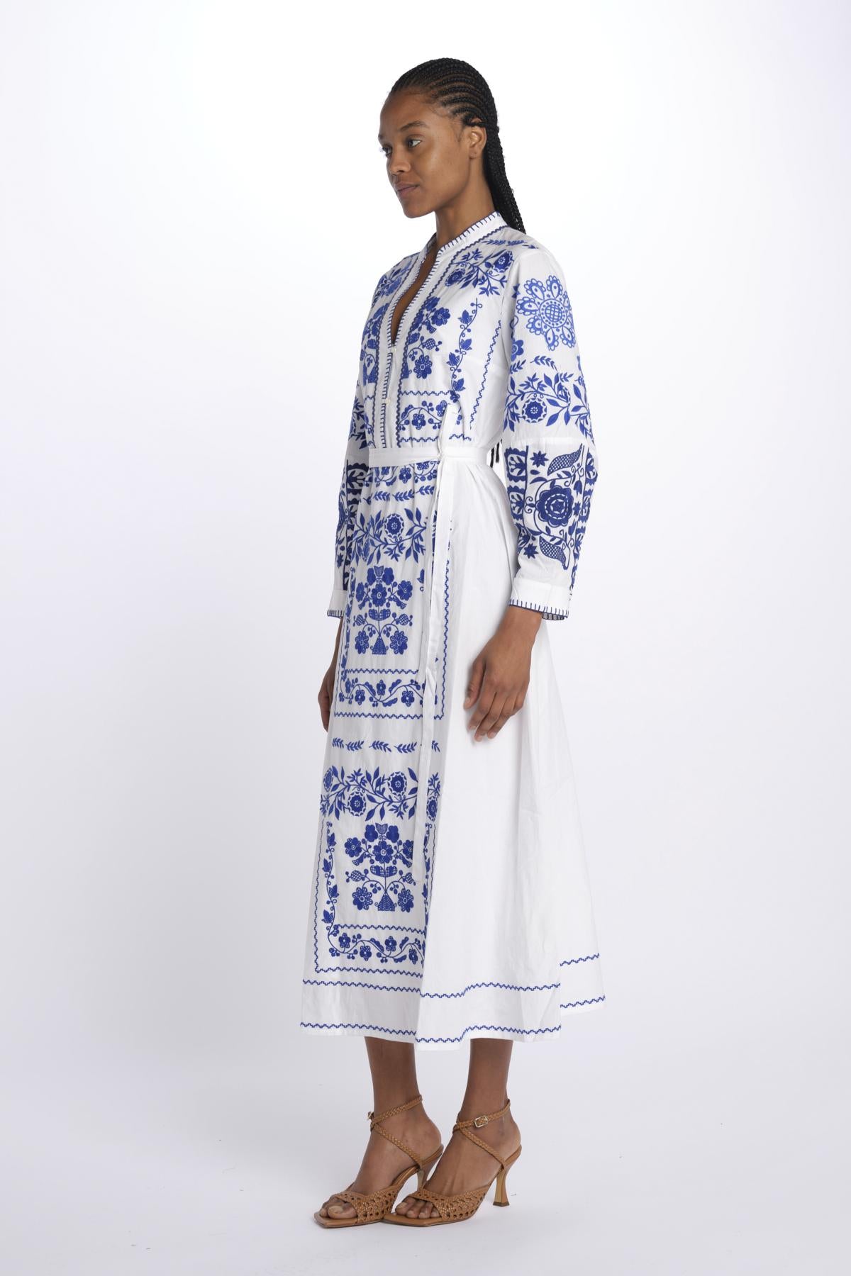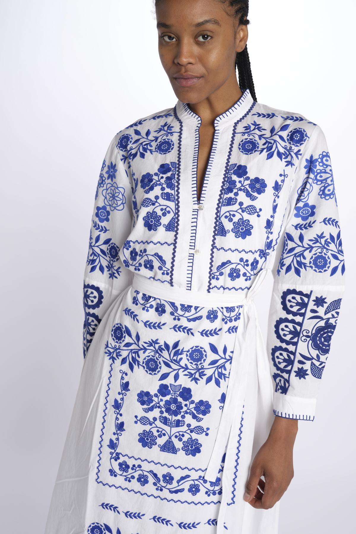 Caftano MAMIE ricamo fiori by antik batik. La modella è alta 174 cm e indossa una XS. Composizione: 100% cotone.