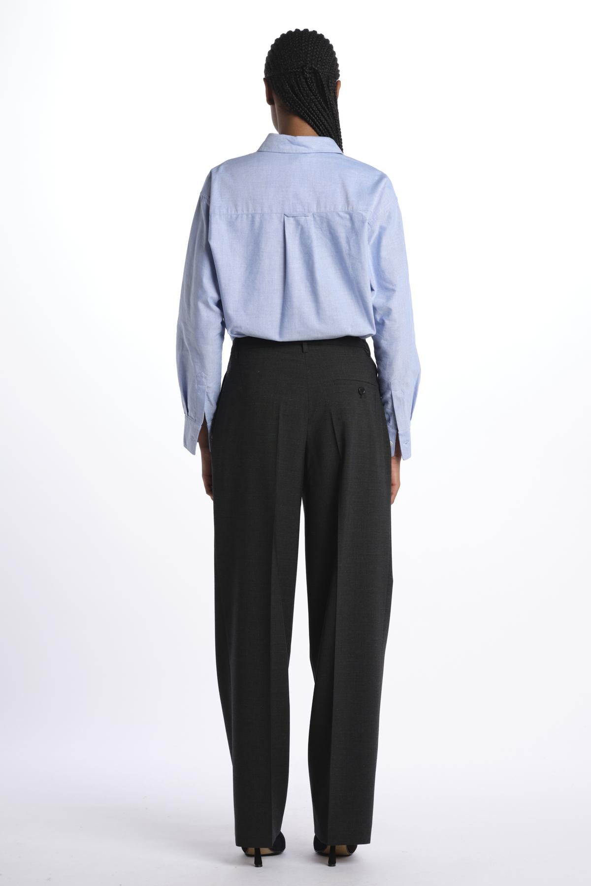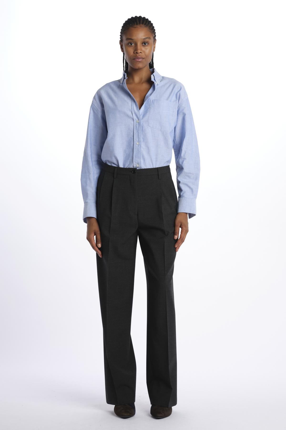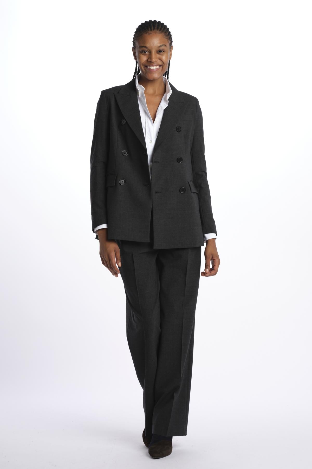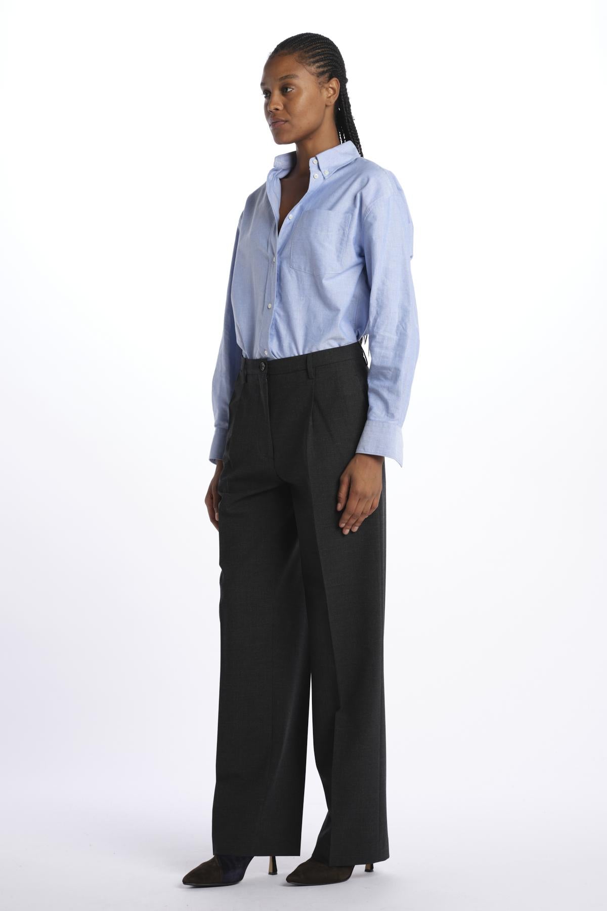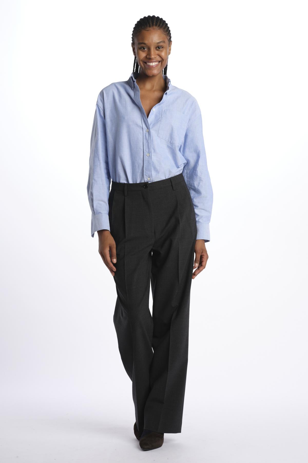 Pantalone 2 pinces tela lana by aspesi. La modella è alta 174 cm e indossa una 38. Composizione: 53% poliestere, 43% lana, 4% elastane.