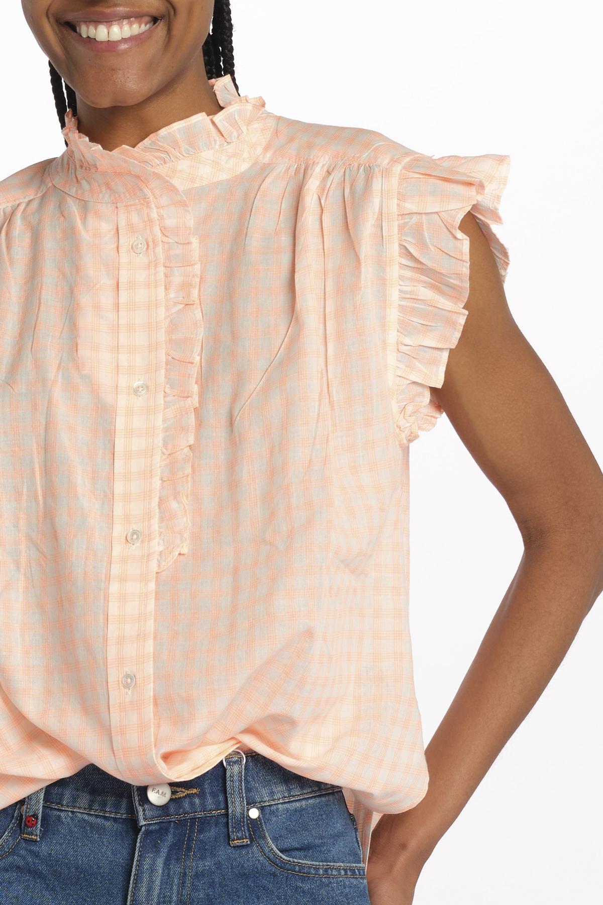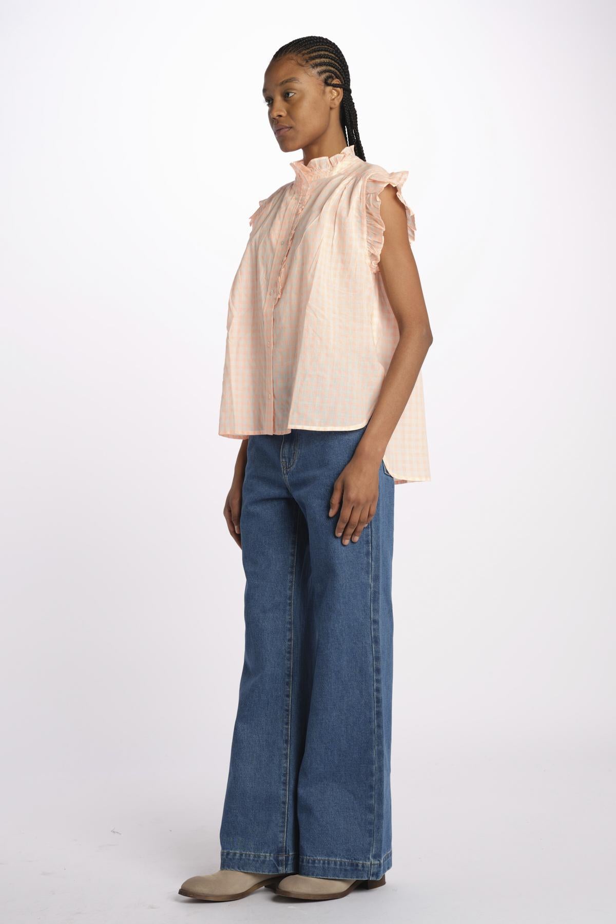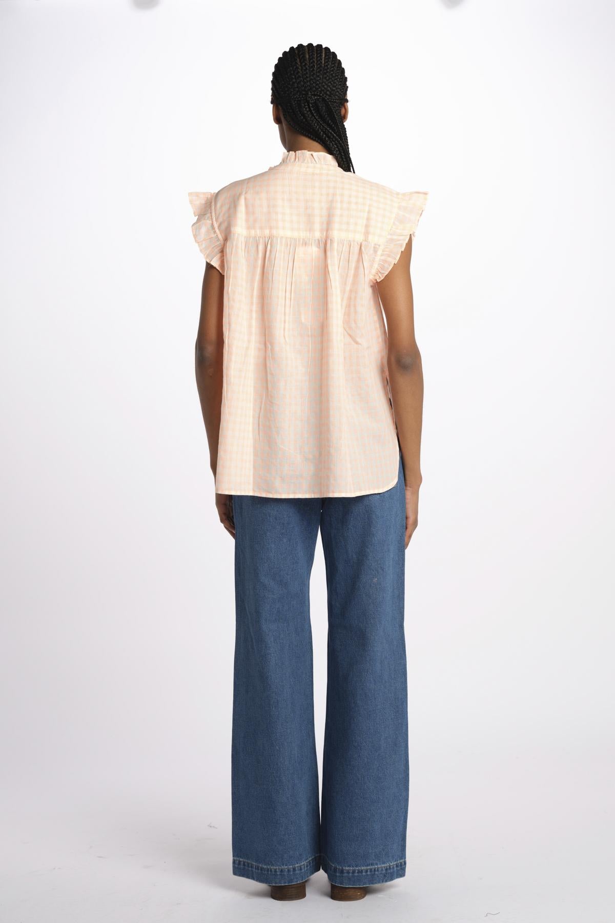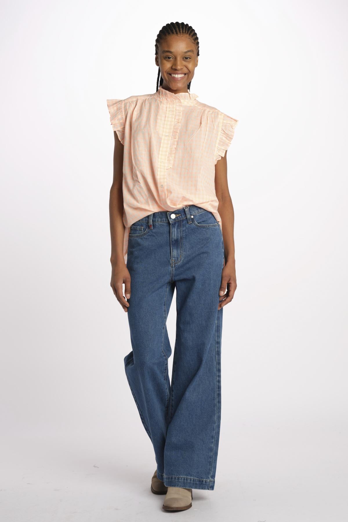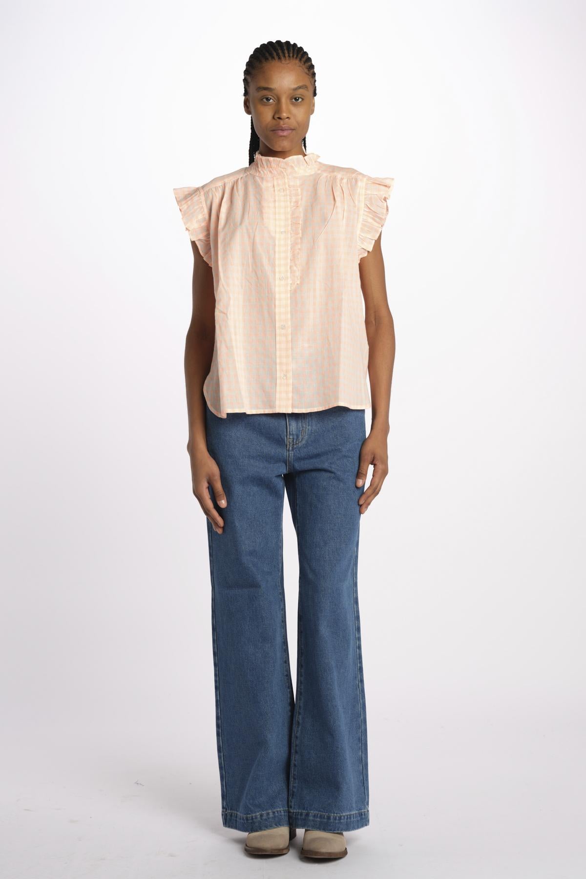 COYOTE camicia s/m chambray by bellerose. La modella è alta 174 cm e indossa una taglia 34 (IT38). Composizione: 100% cotone.