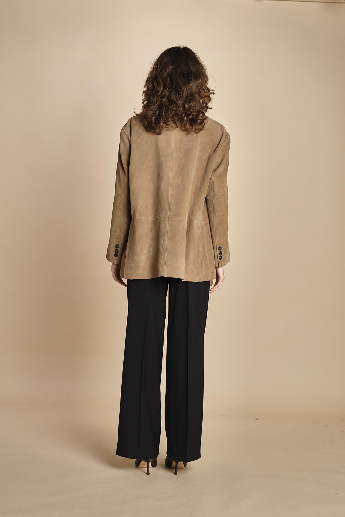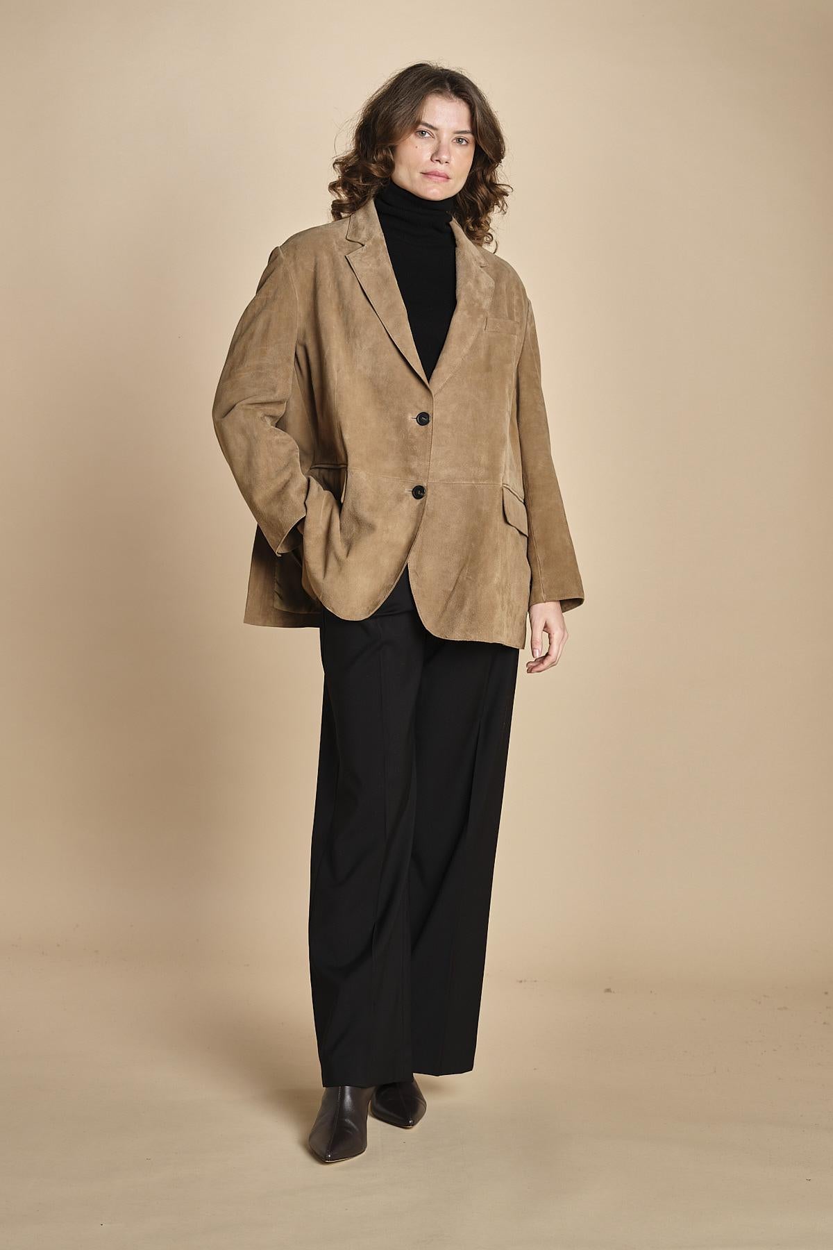 blazer over camoscio. La modella è alta 176 cm e indossa una taglia S. 100% PELLE