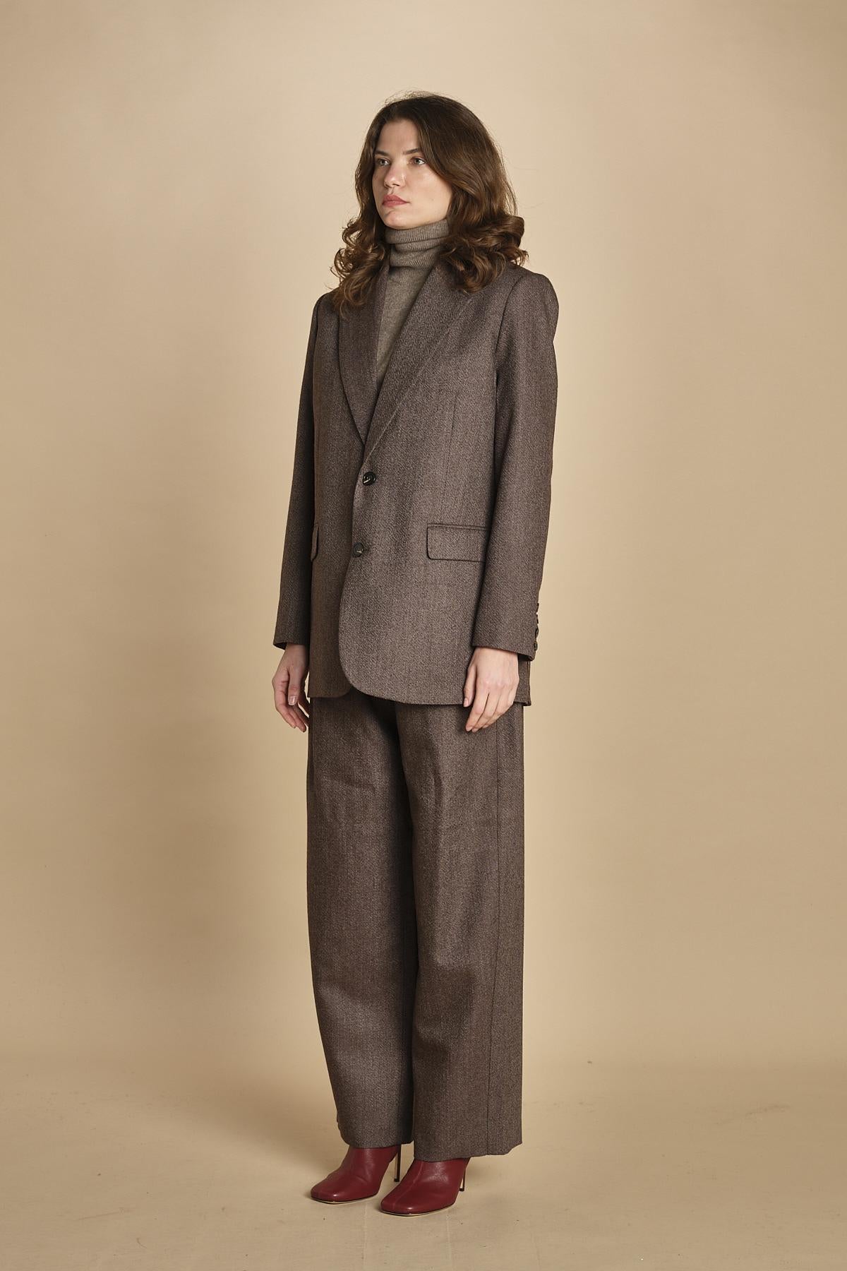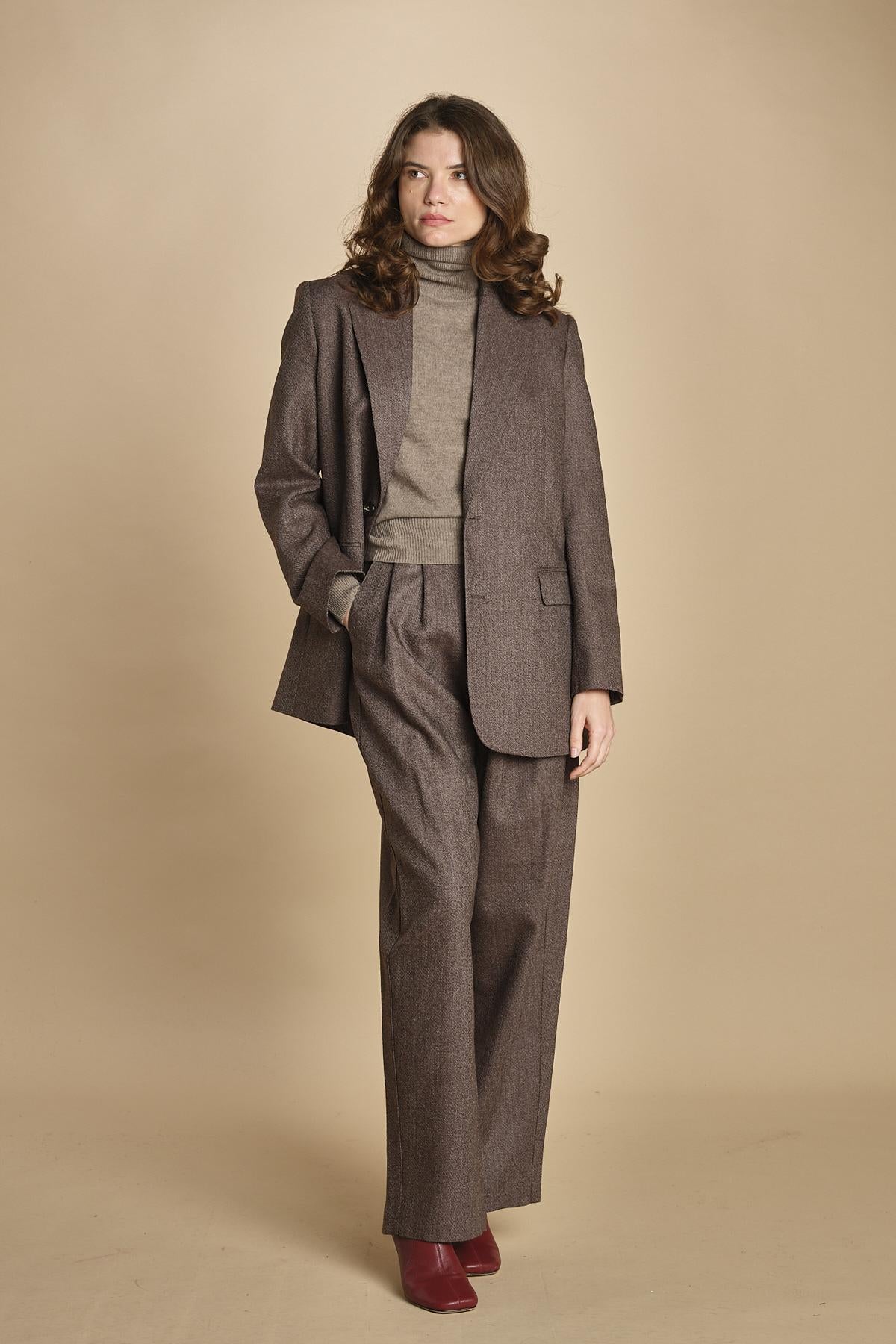 blazer over due bottoni occhio di pernice. La modella è alta 174 cm e indossa una taglia 36. 100% lana