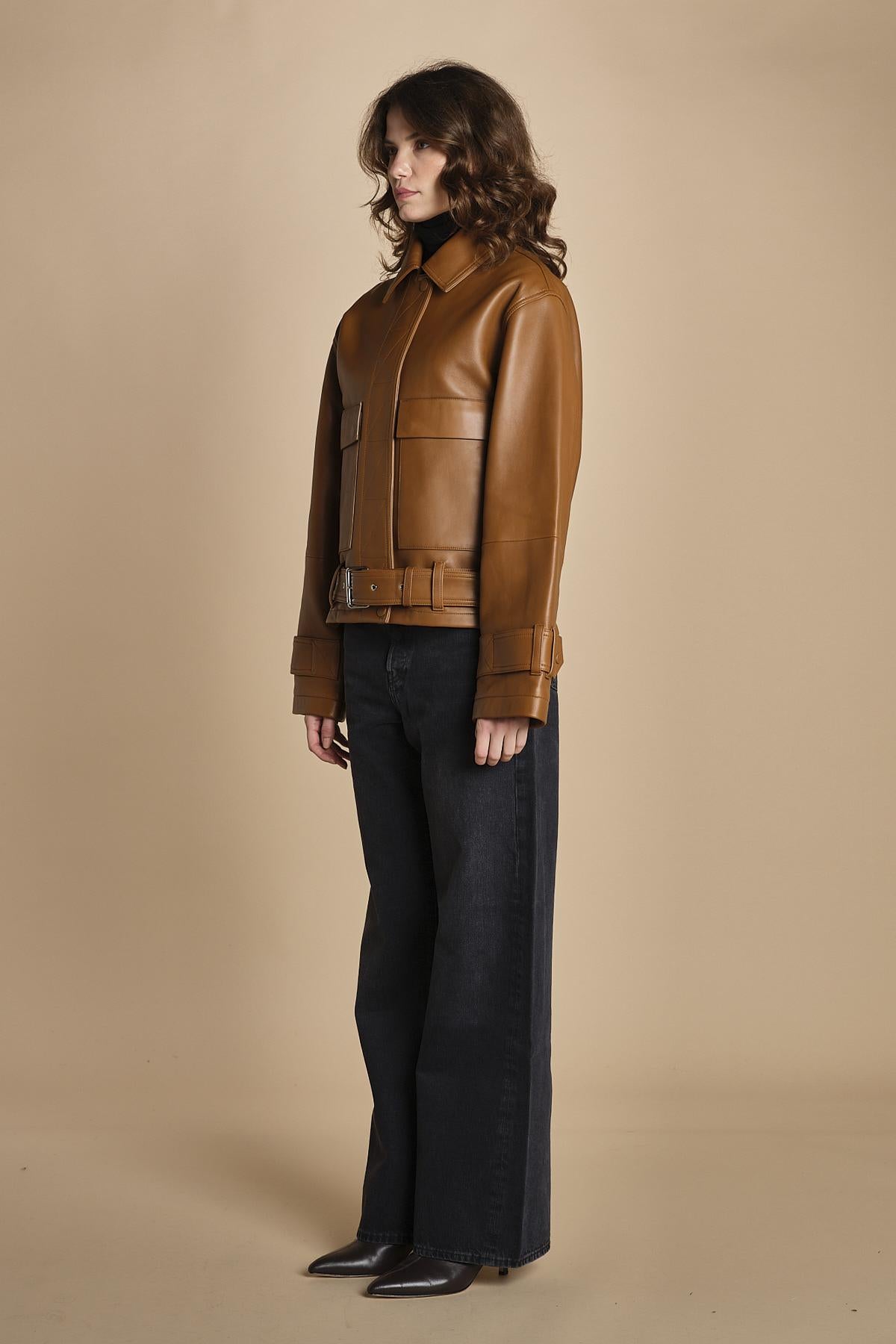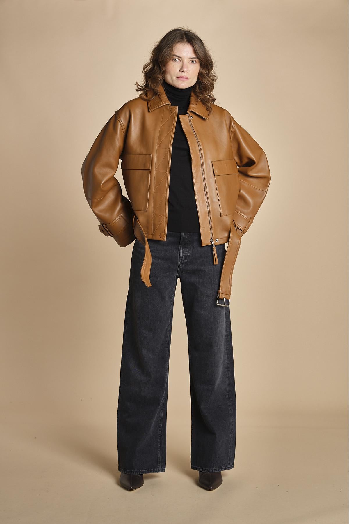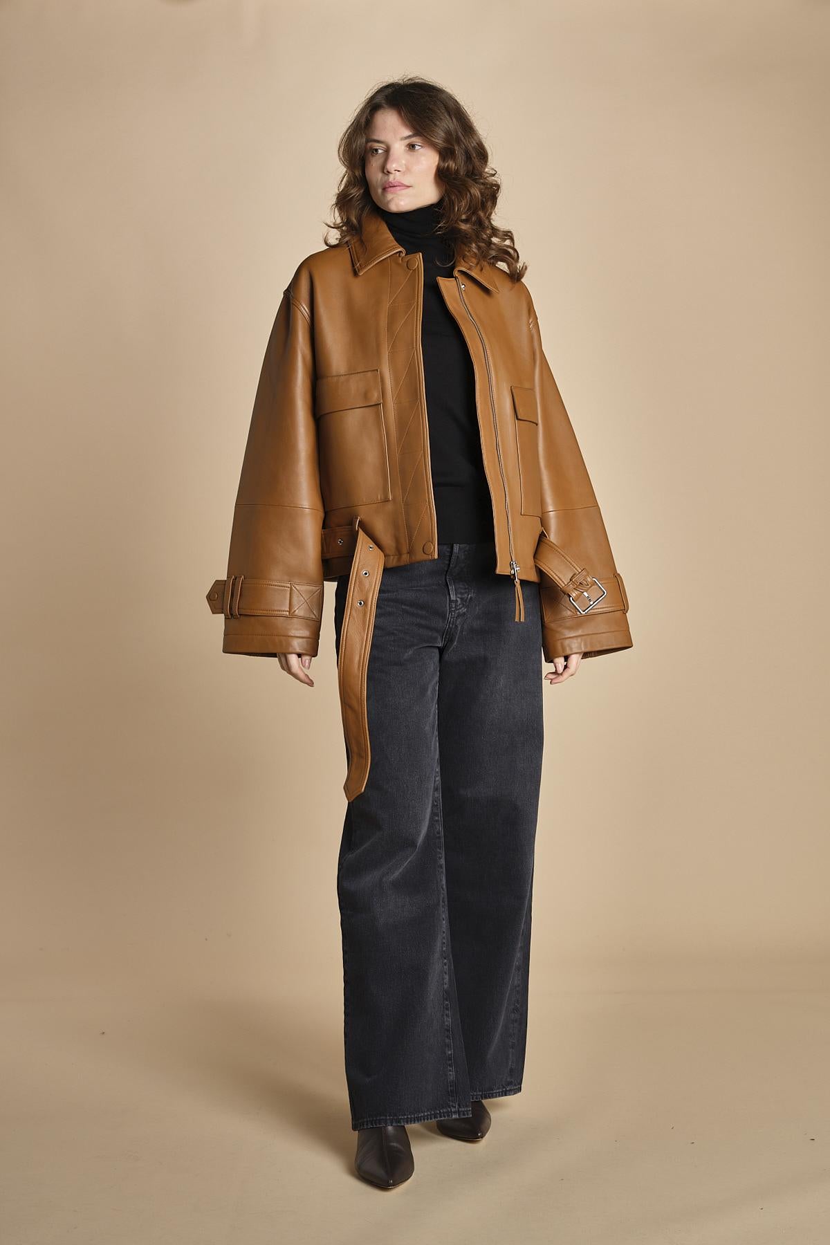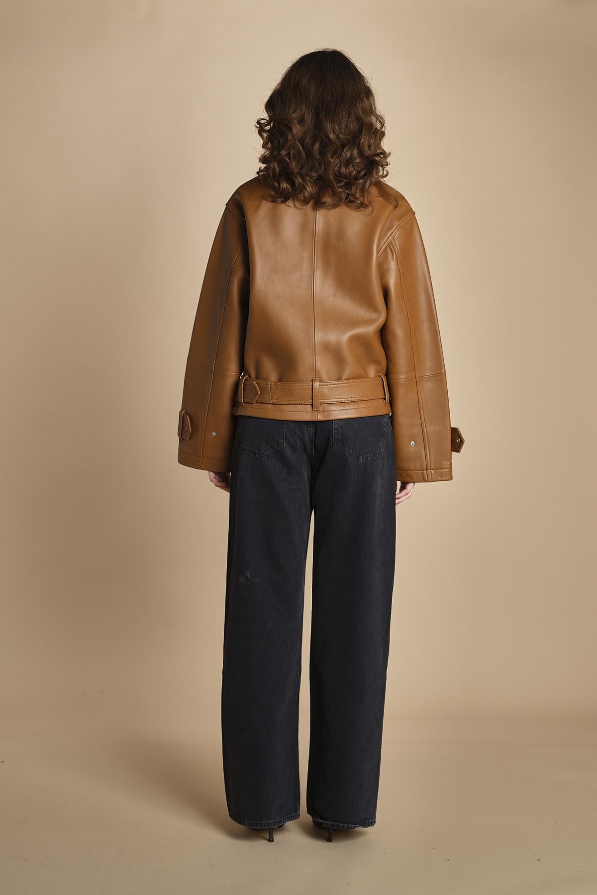 chiodo in pelle. La modella è alta 176cm e indossa una taglia 38.100% pelle