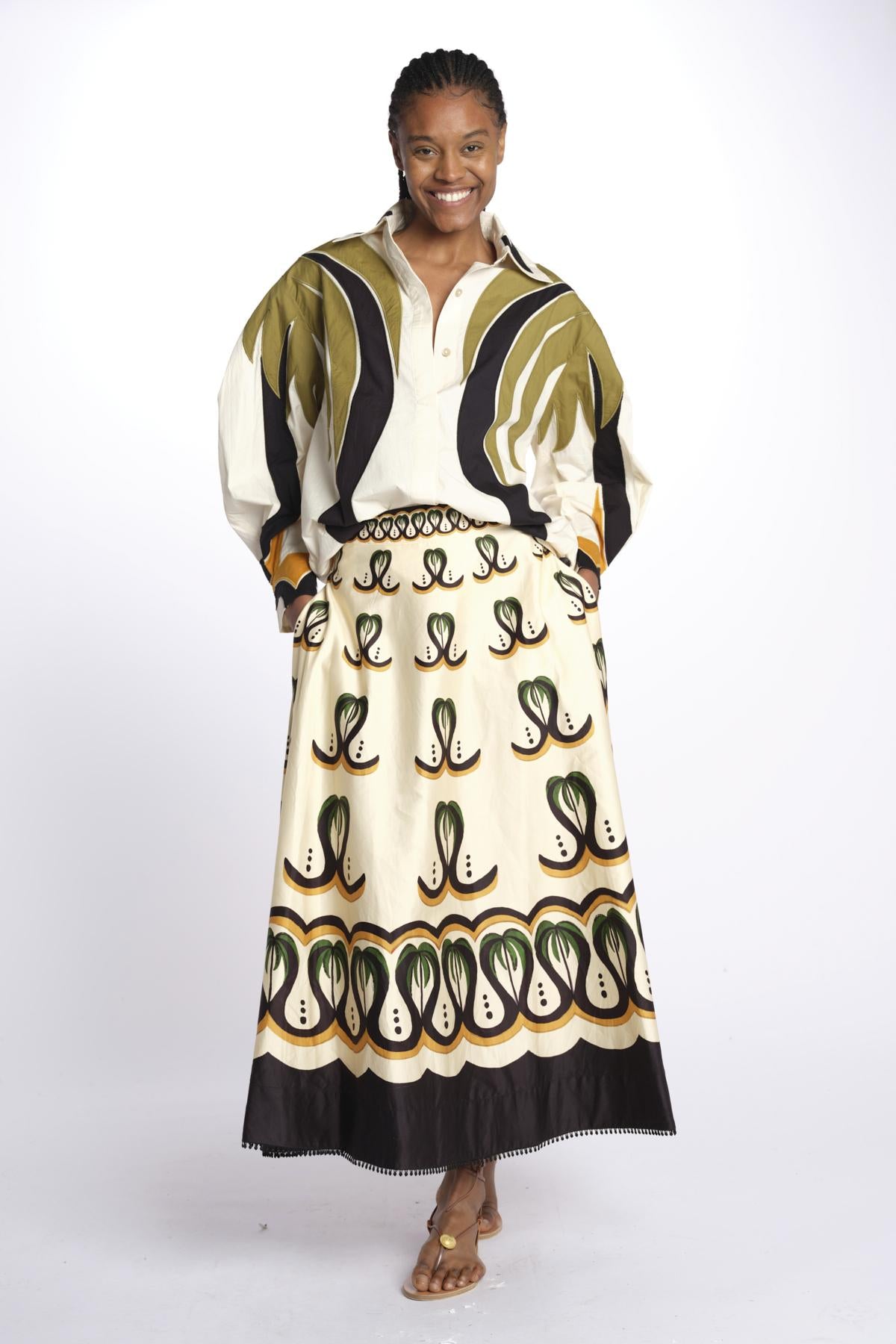 Camicia COCONUT TREE perline by farm rio. La modella è alta 174 cm e indossa una taglia S. Composizione: 100% cotone.