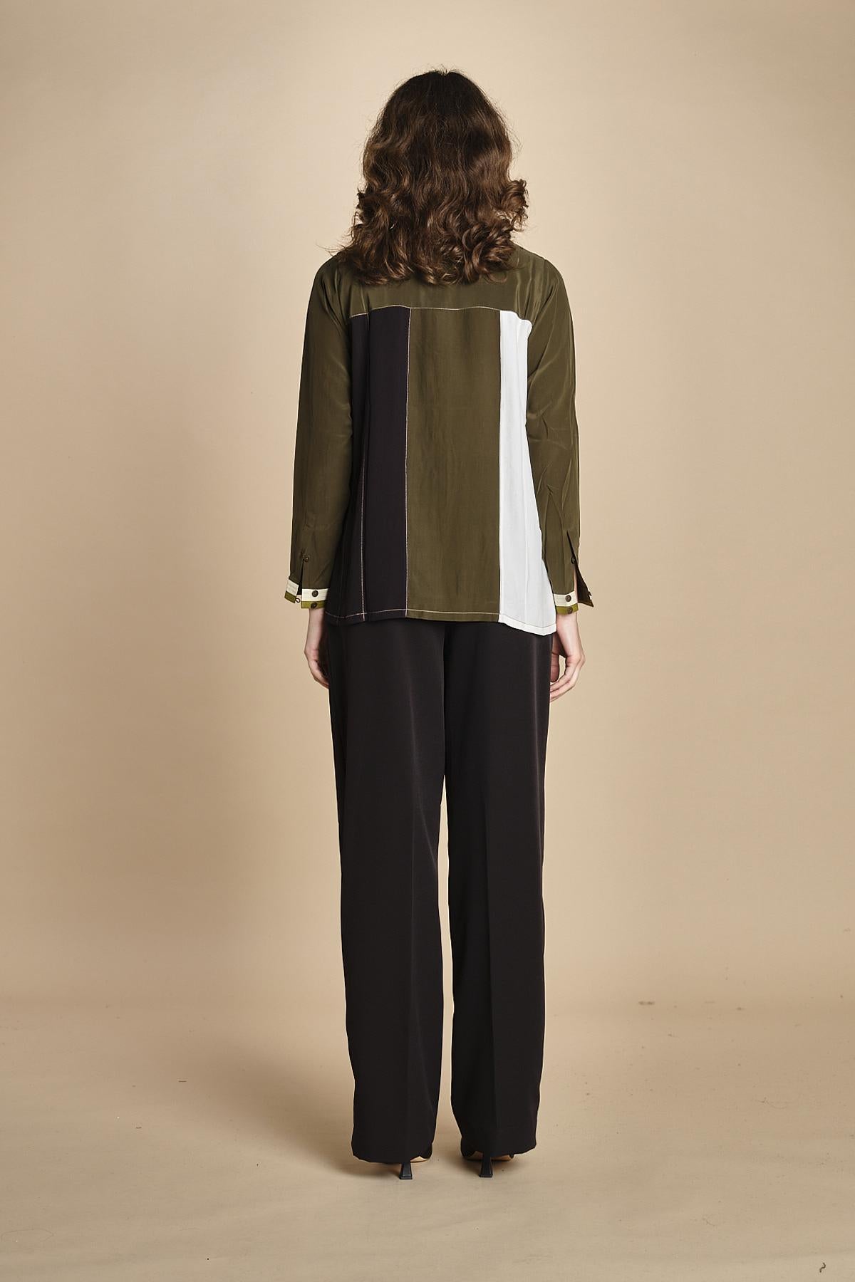 camicia con collo a pannelli. La modella è alta 176 cm e indossa una taglia XS. 100% SETA