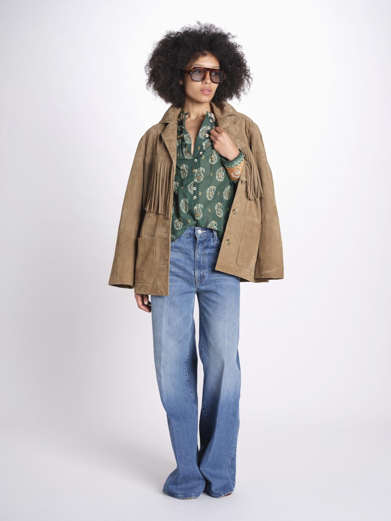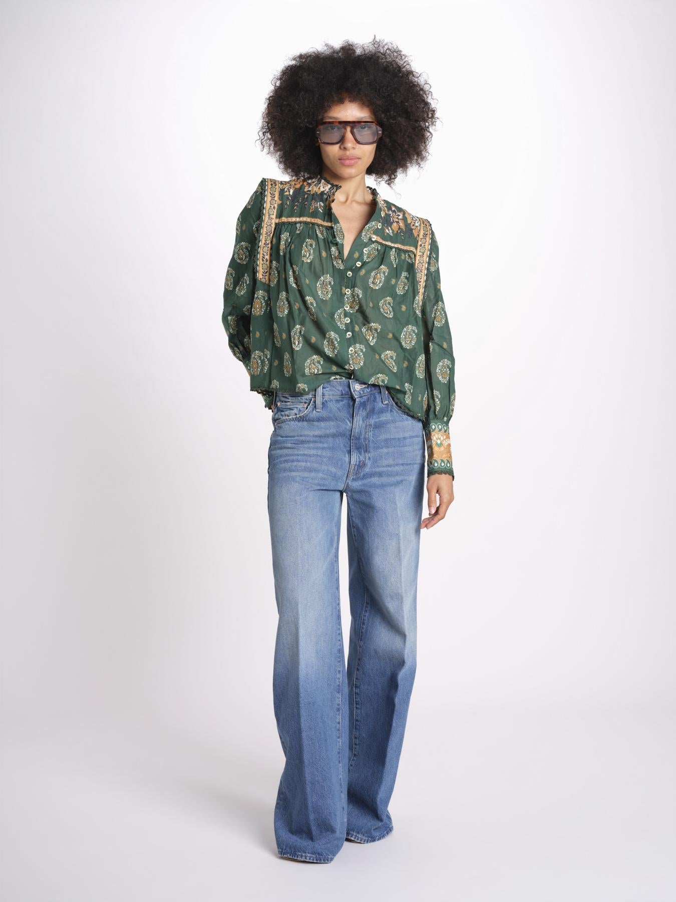 Camicia m/l stampa paisley. La modella è alta 1.75 e indossa una taglia XS. Composizione: 100% cotone.