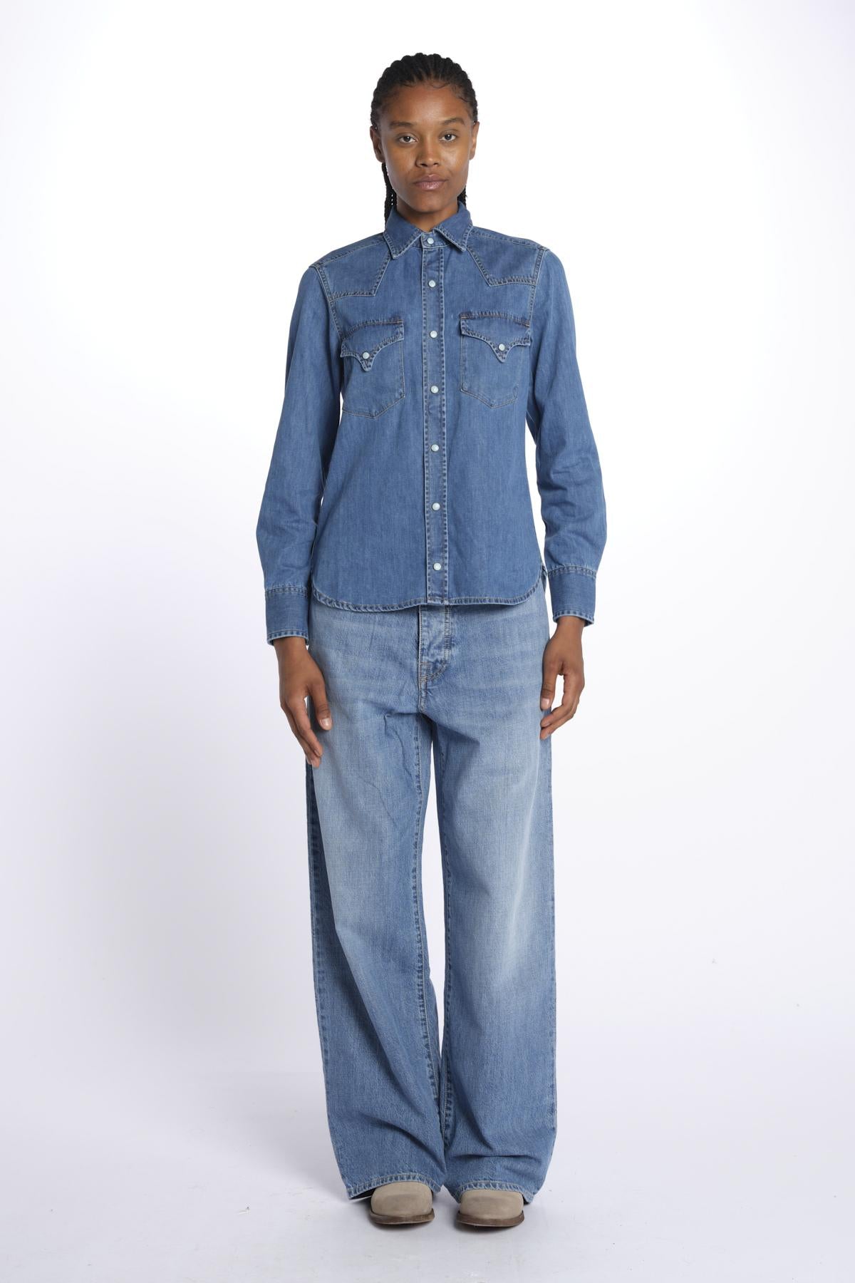 Camicia NTEX denim by fortela. La modella è alta 174 cm e indossa una taglia 40. Composizione: 100% cotone.