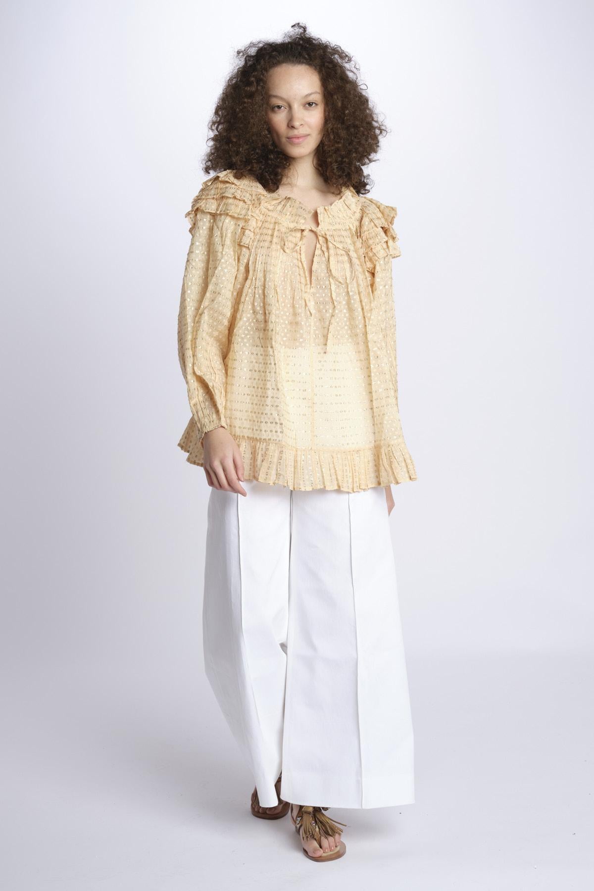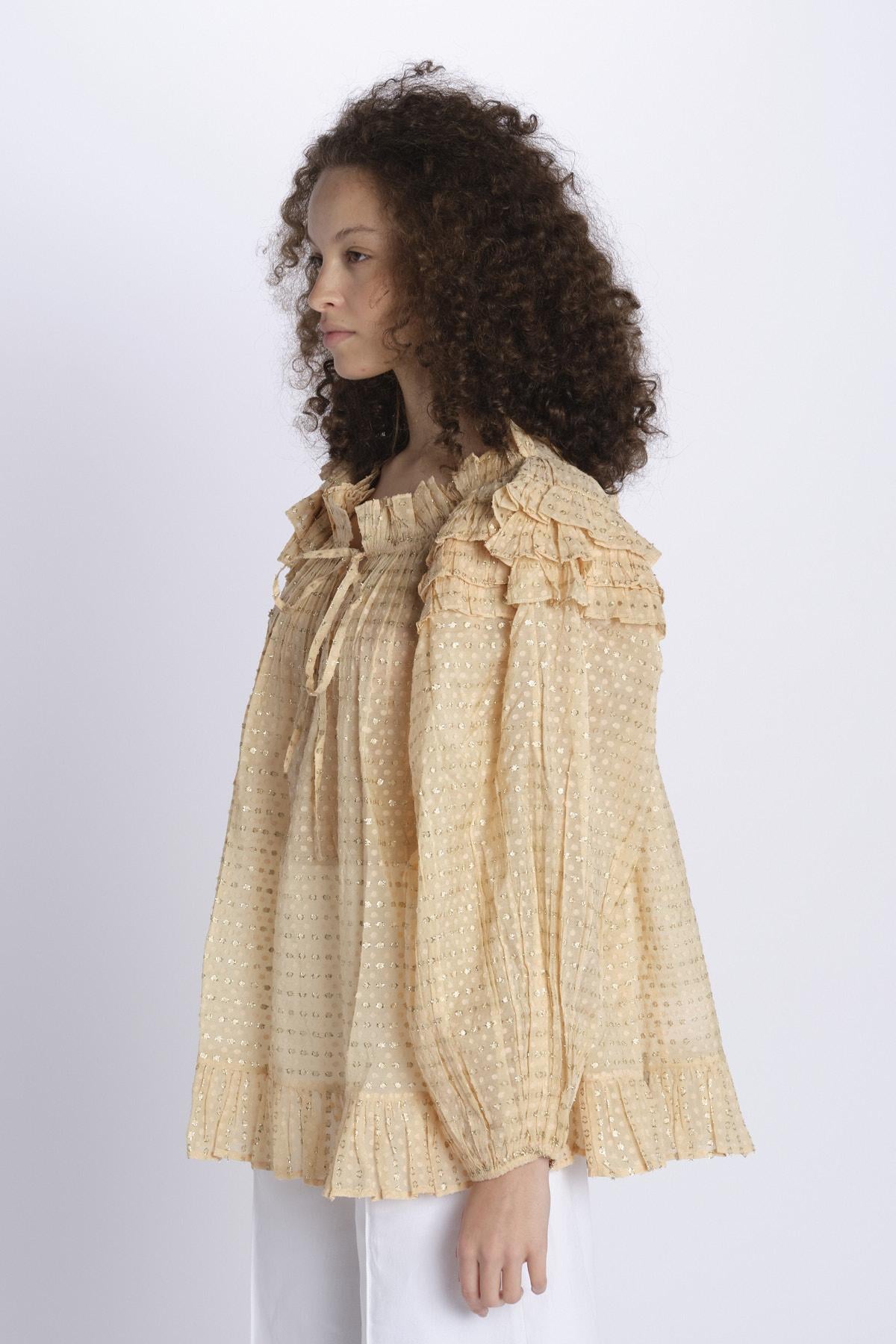 Camicia by Anaak over pois. La modella è alta 176 cm e indossa una 0. Composizione: 80% Cotone, 20% Seta.