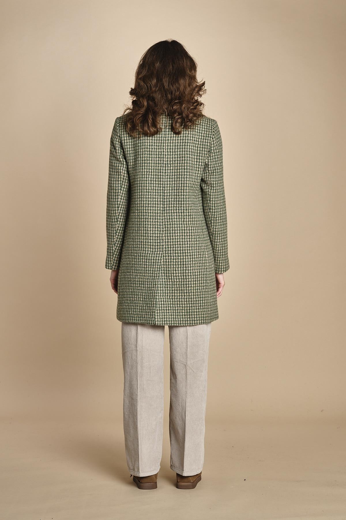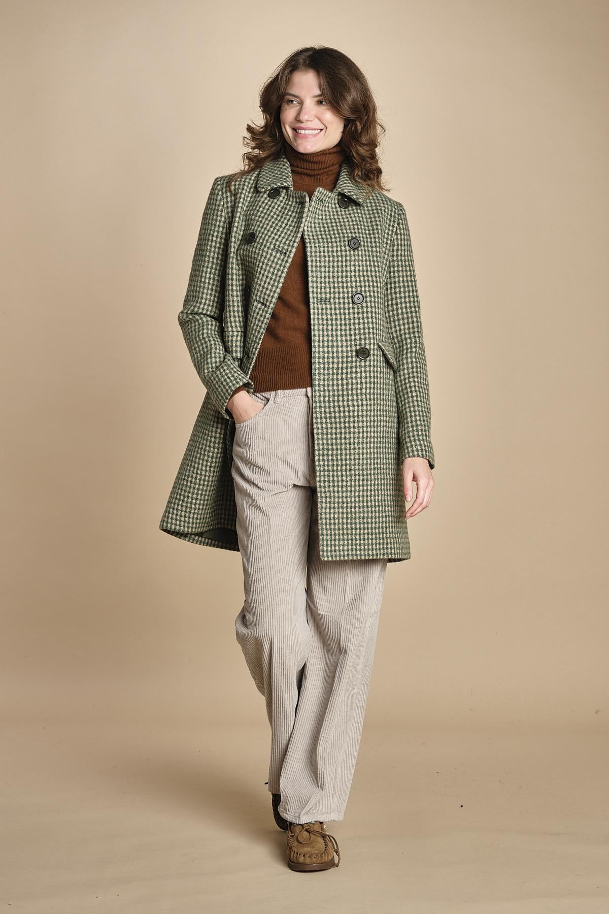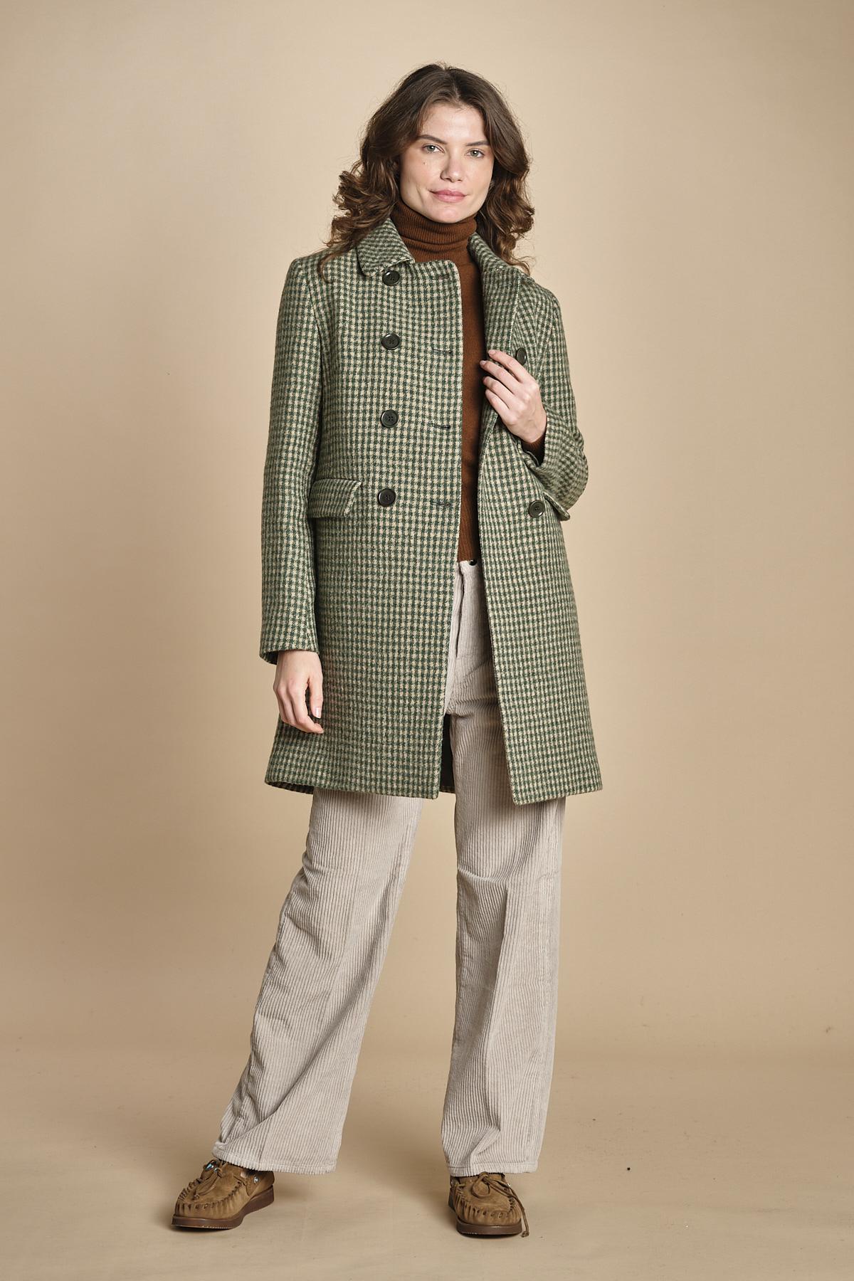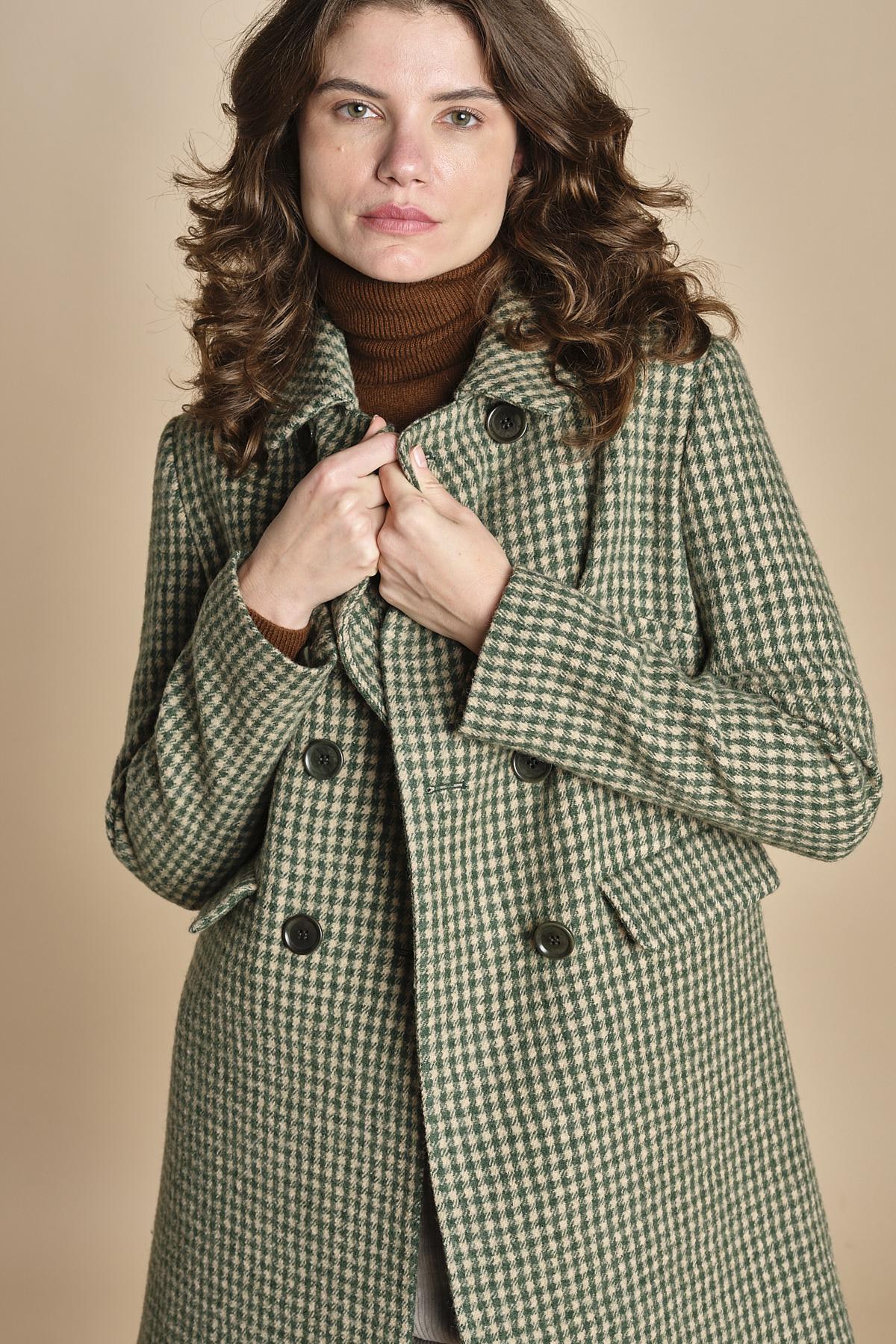 cappottino doppiopetto a quadretti. La modella è alta 176 cm e indossa una taglia 40. 100% LANA