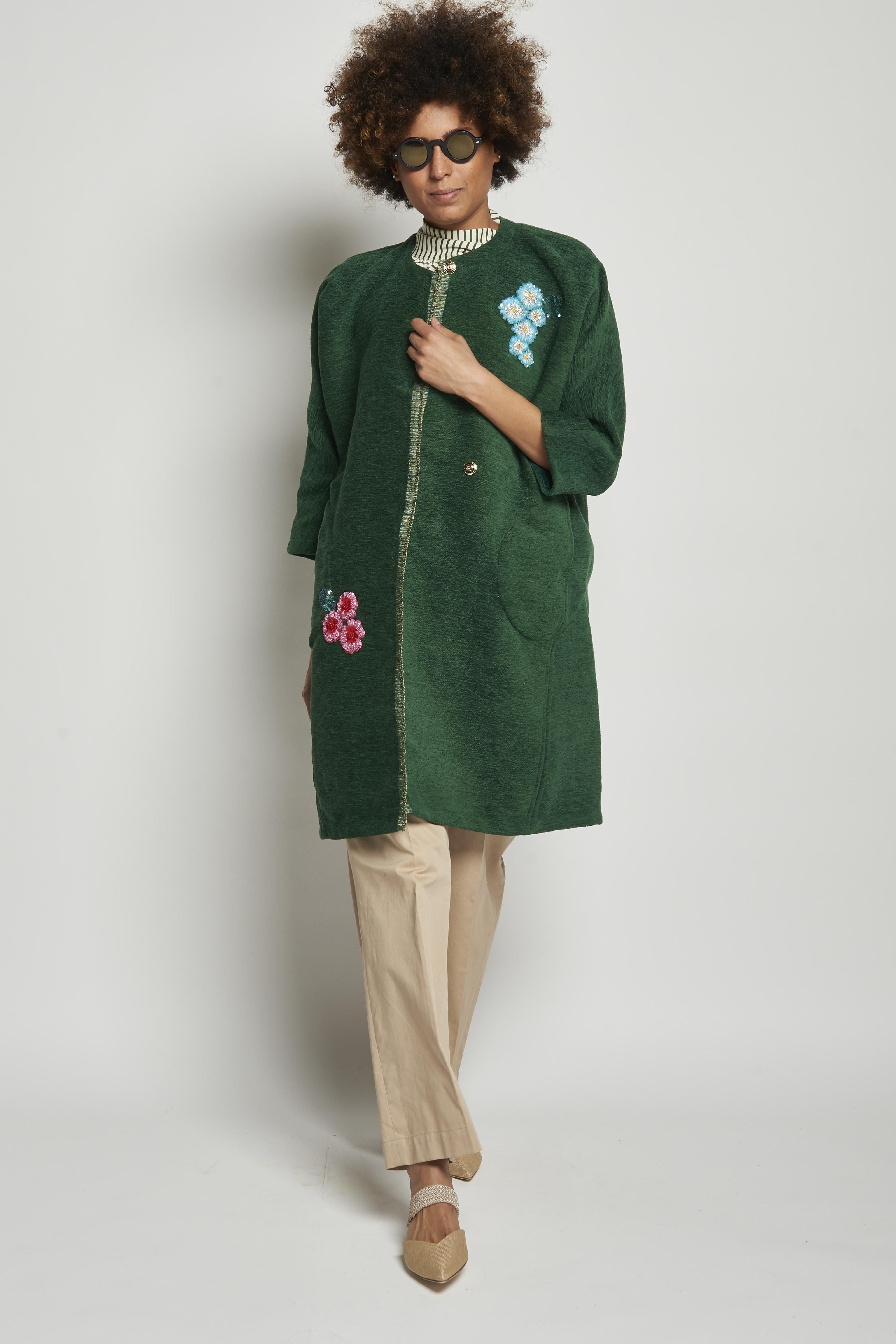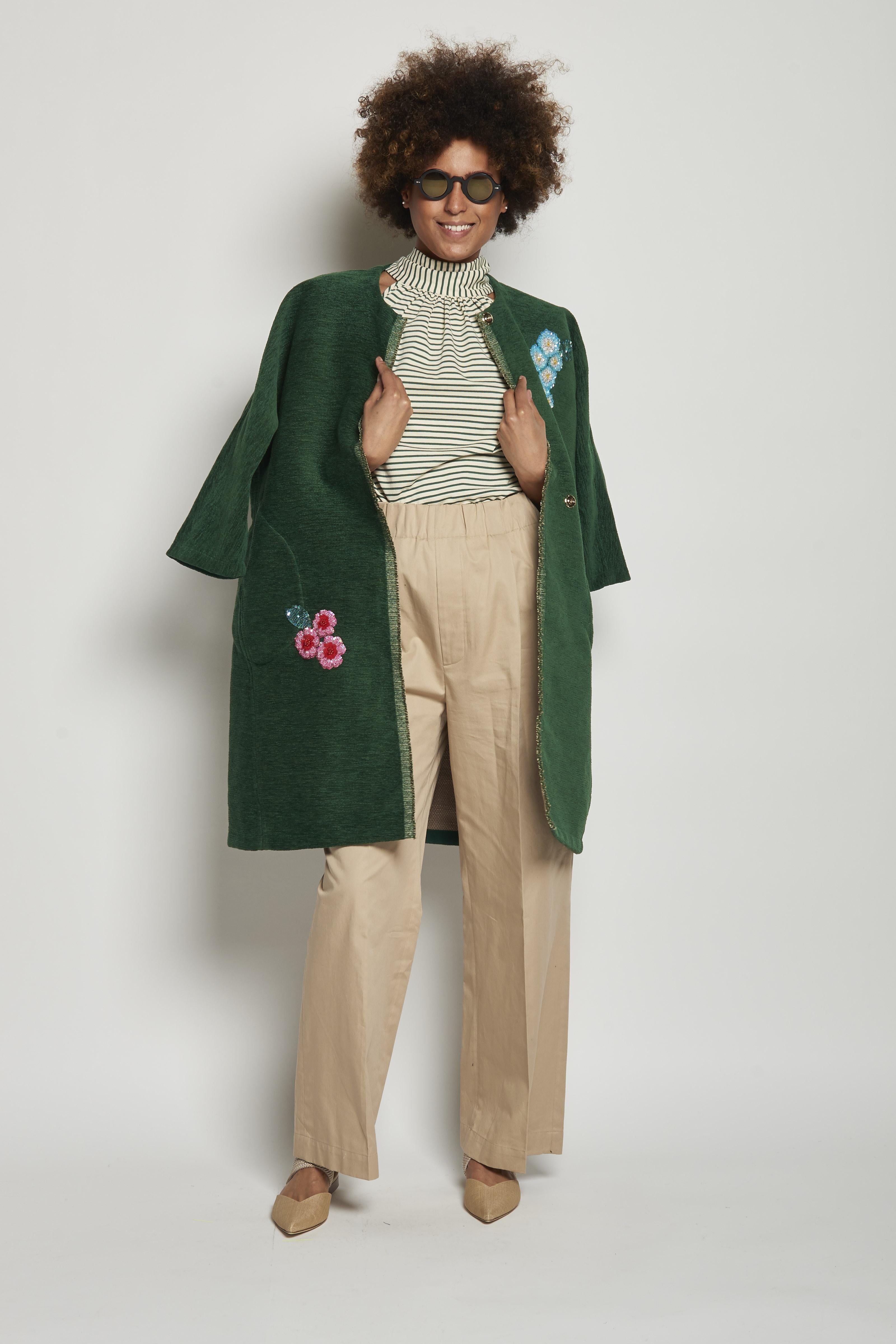 Marit Ilison cappotto verde con decorazioni fiori in paillettes Composizione: 37% cotone 35% viscosa 24% poliestere 4% lino La modella indossa una taglia S ed è alta 1.80 m