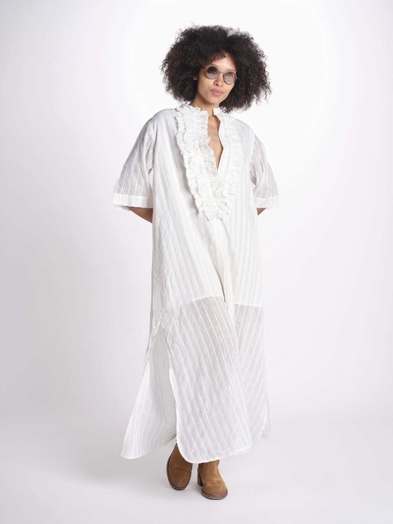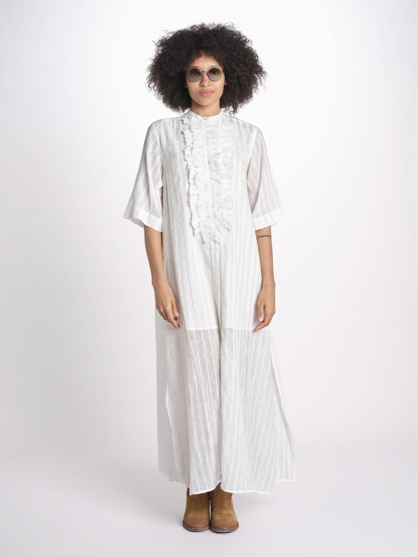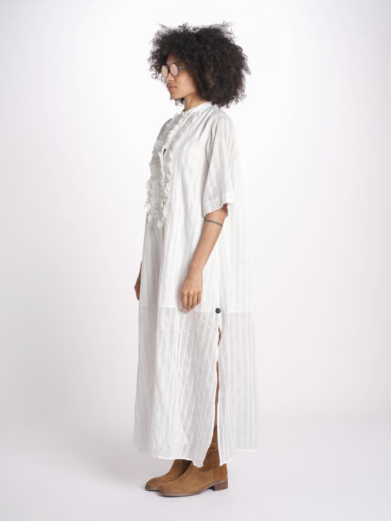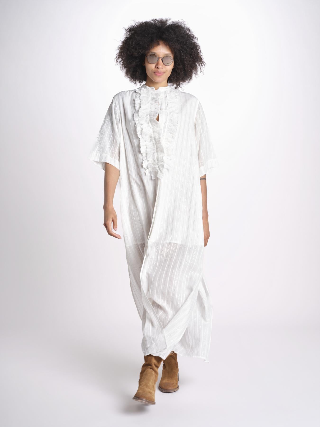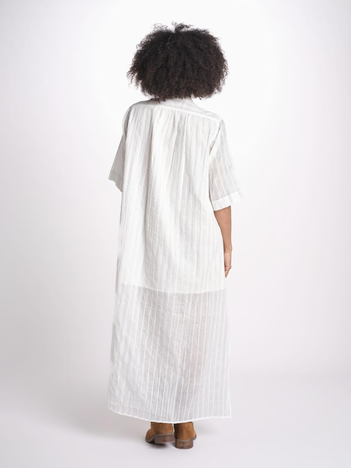 Chemisiere gessato argento. La modella è alta 1.75 e indossa una taglia 36. Composizione: 98% cotone, 2% lurex.